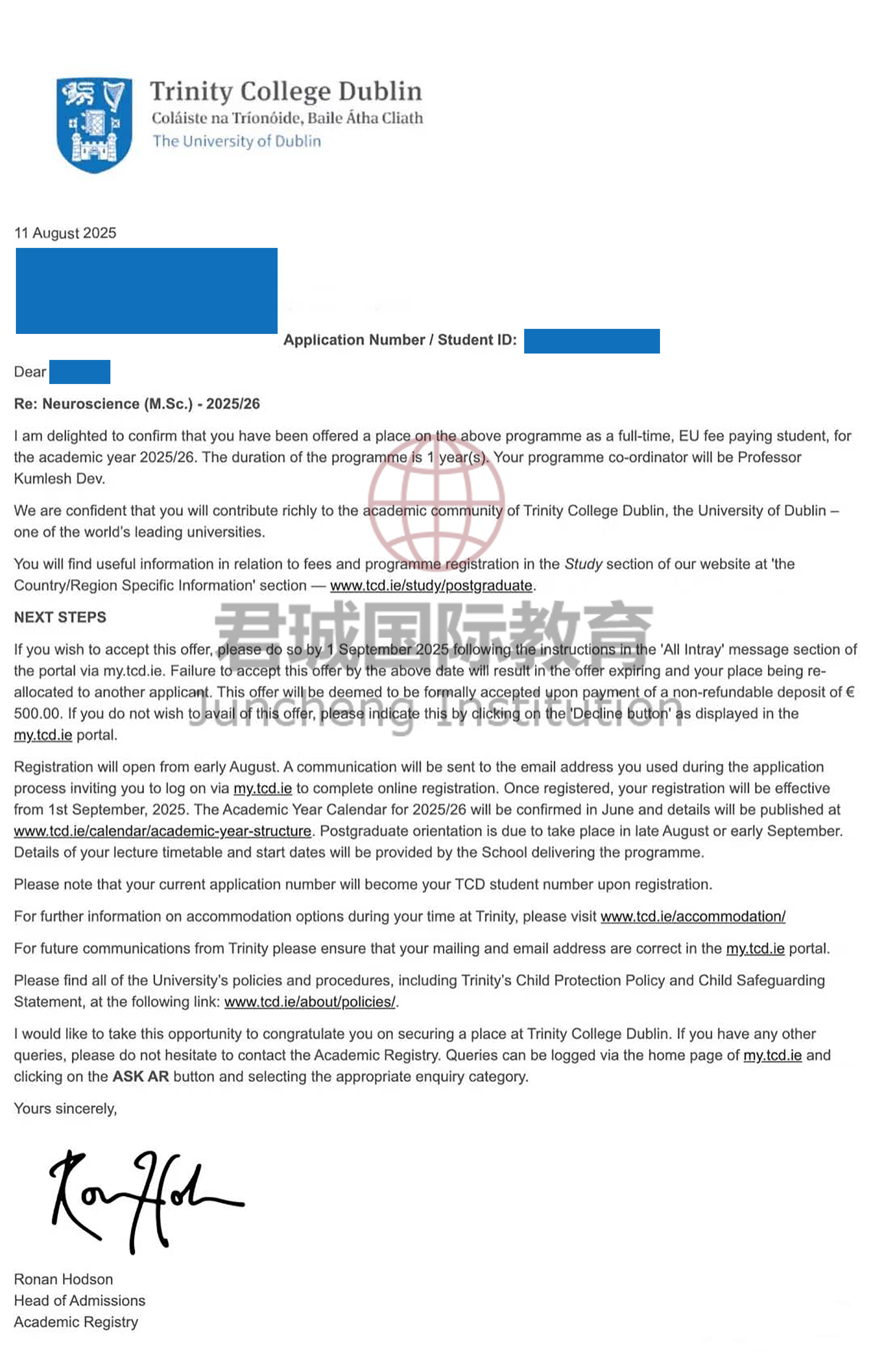 录取Offer:都柏林圣三一学院 Trinity College Dublin