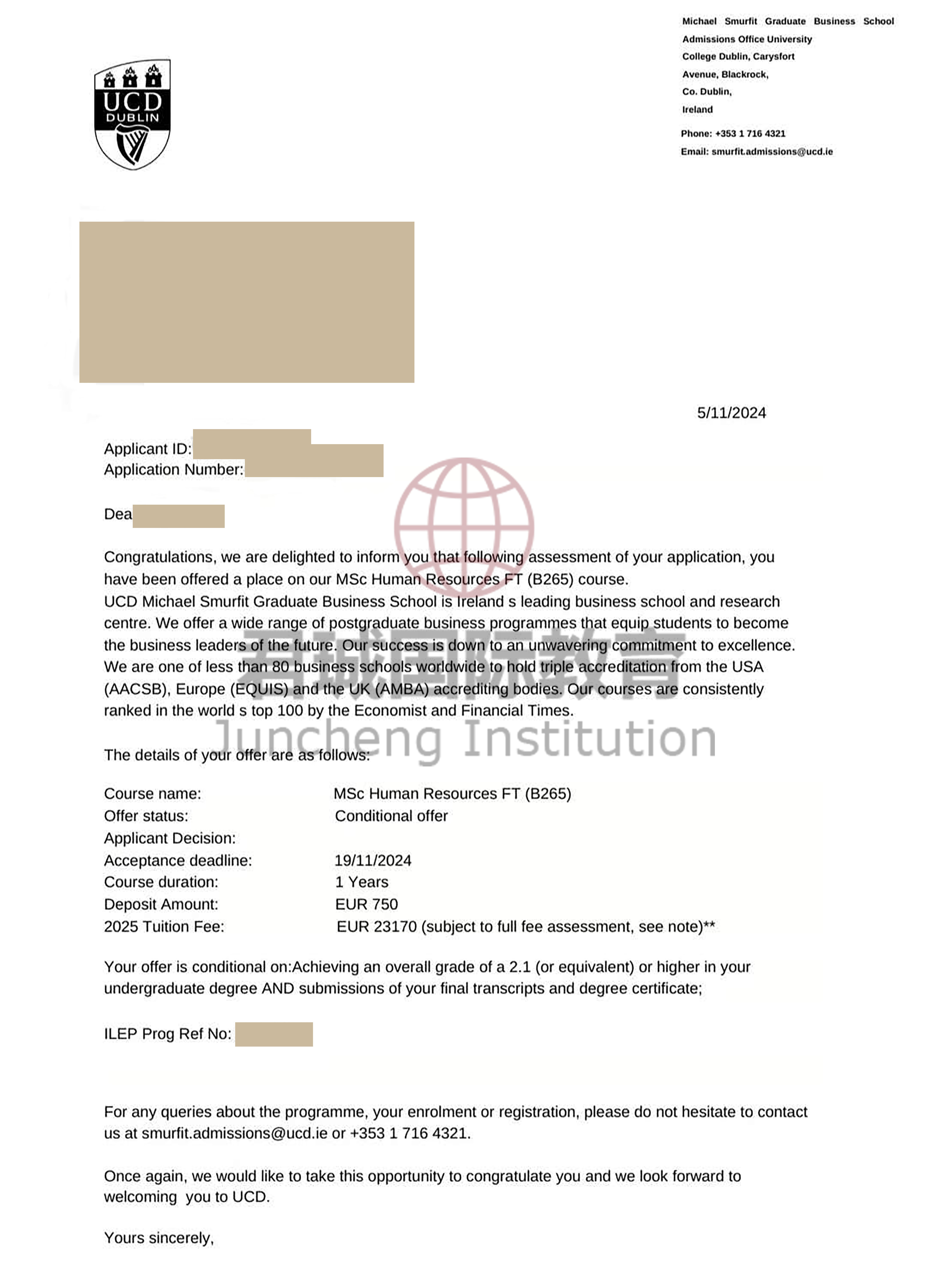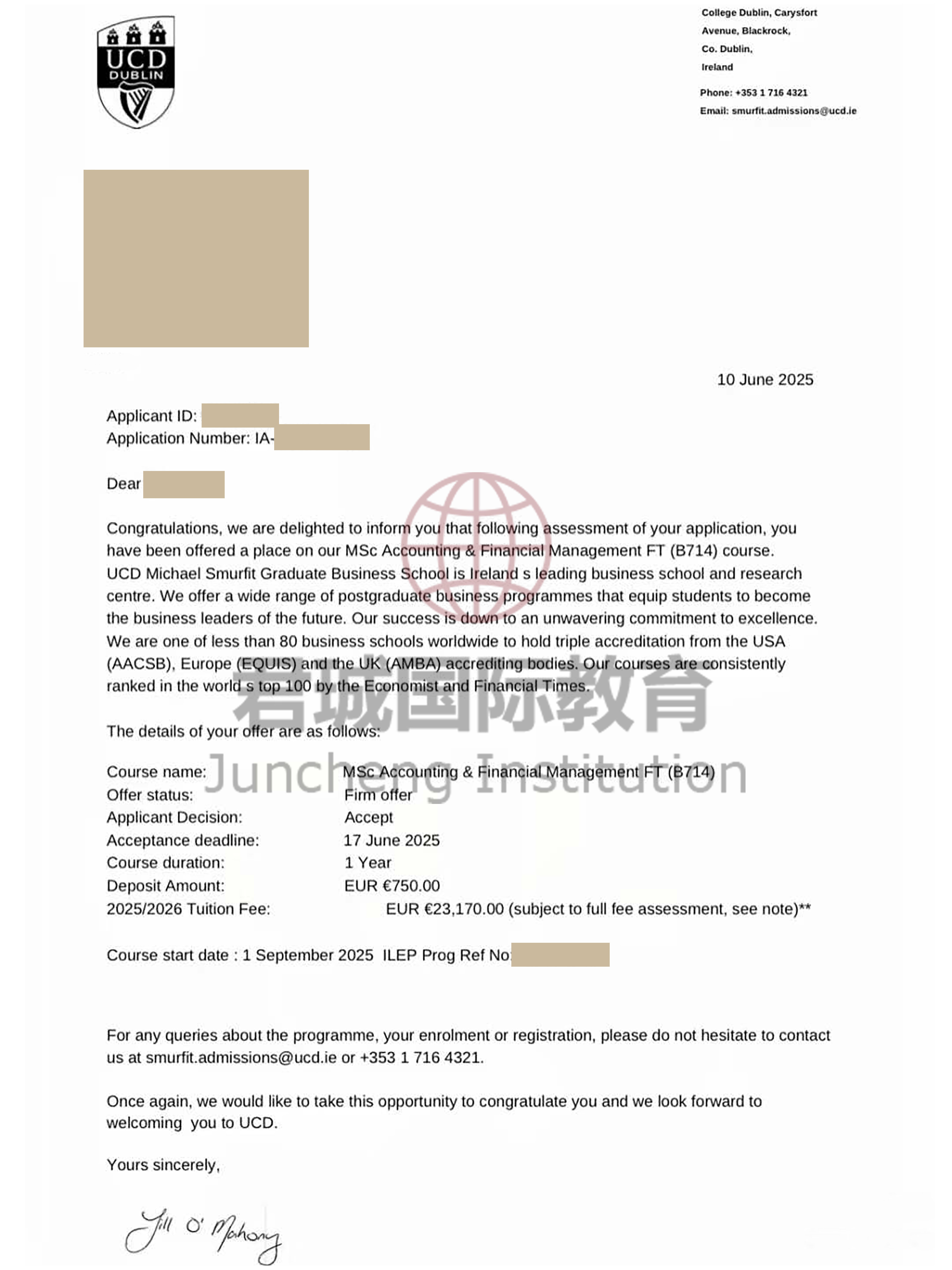 录取Offer:都柏林大学学院 University College Dublin