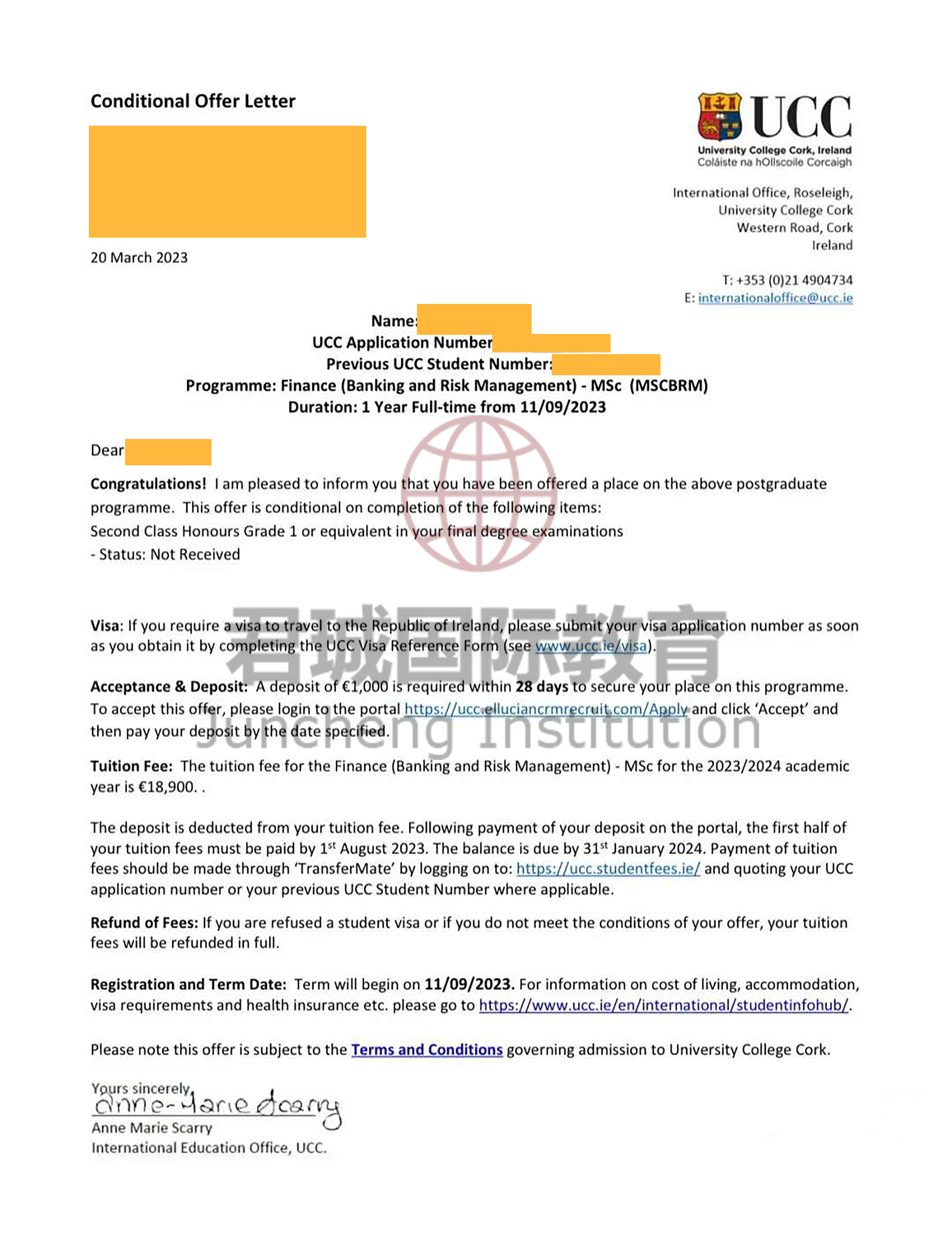 录取Offer:科克大学 University College Cork