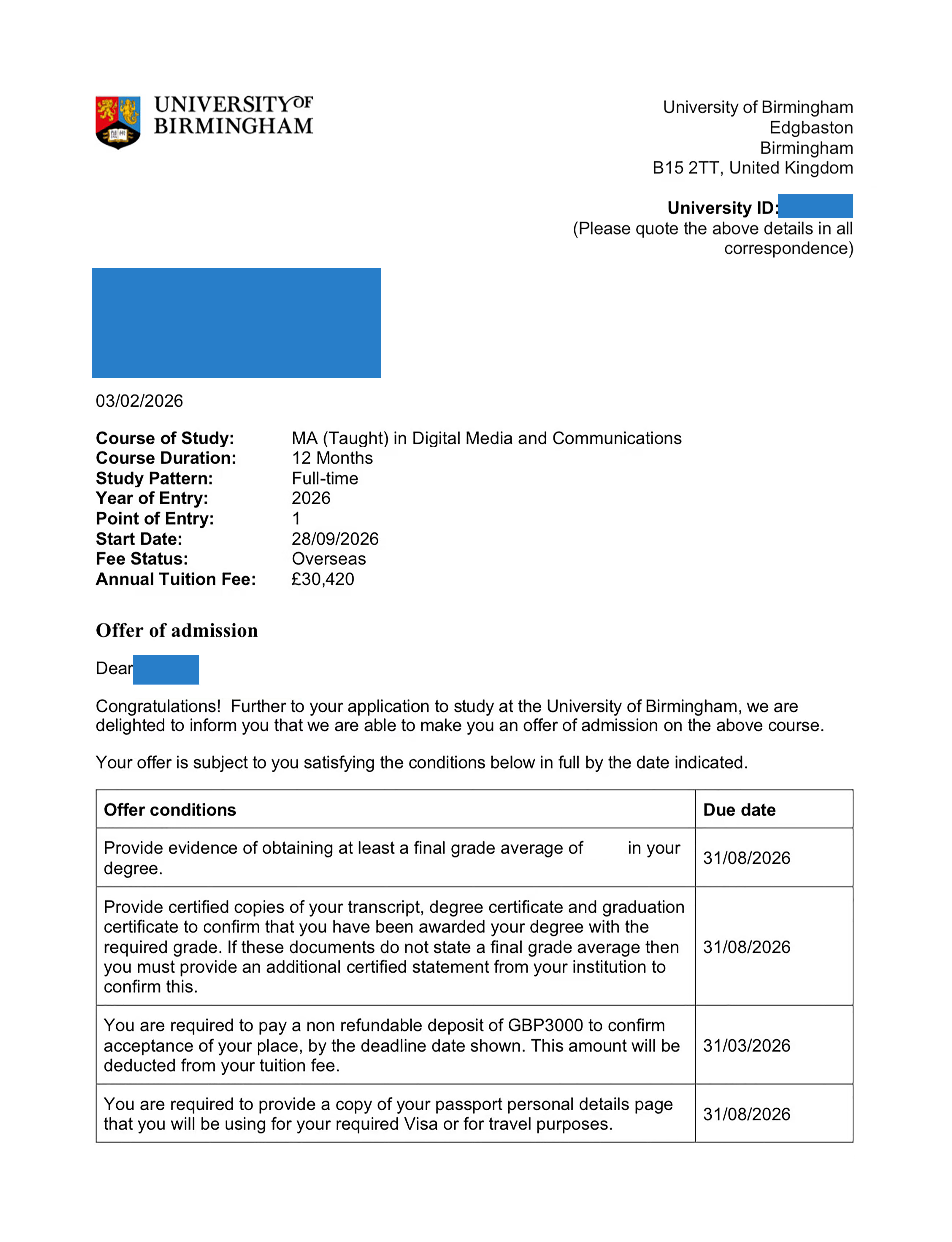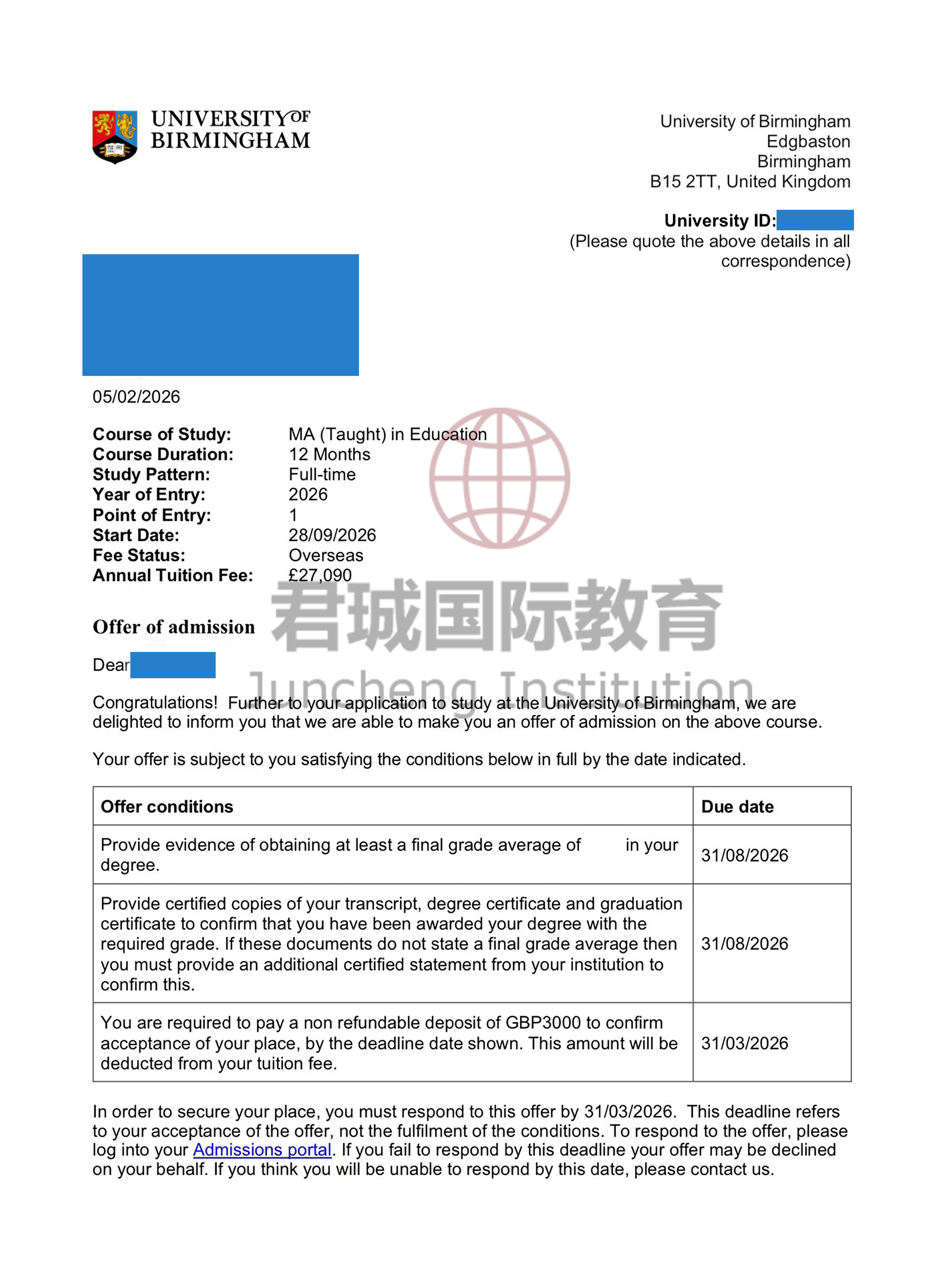 录取Offer:伯明翰大学 University of Birmingham