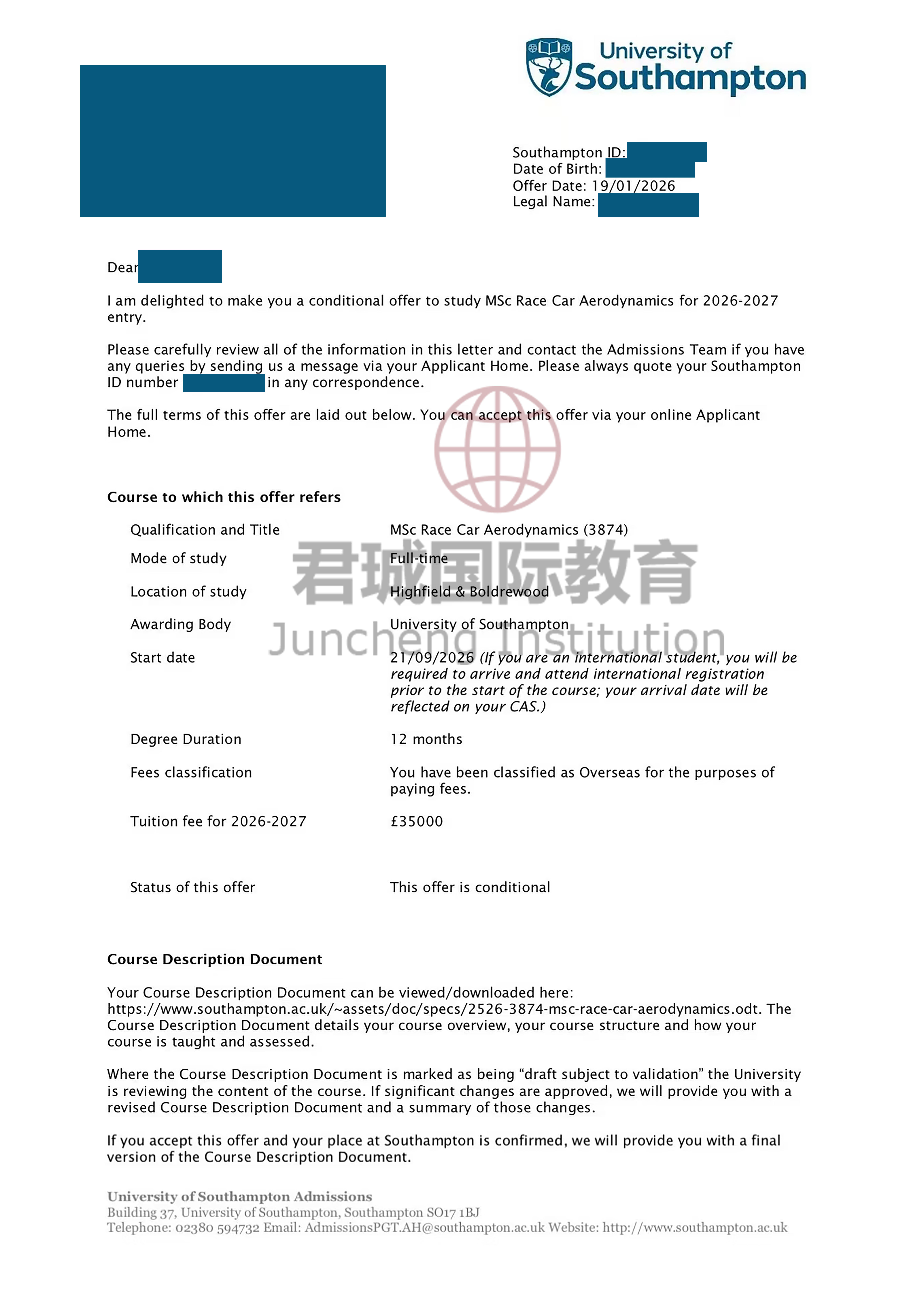 录取Offer:南安普顿大学 University of Southampton