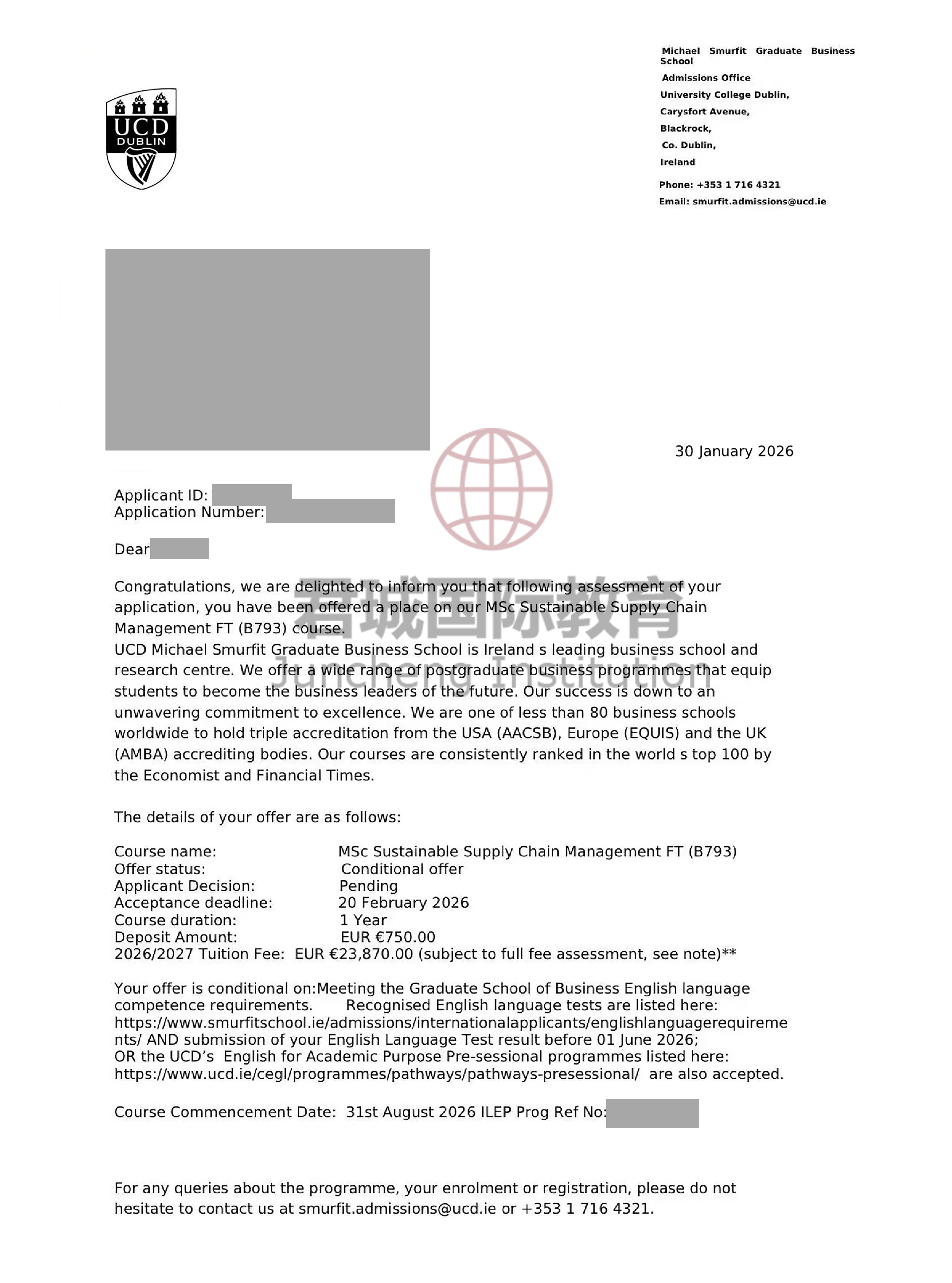 录取Offer:都柏林大学学院 University College Dublin