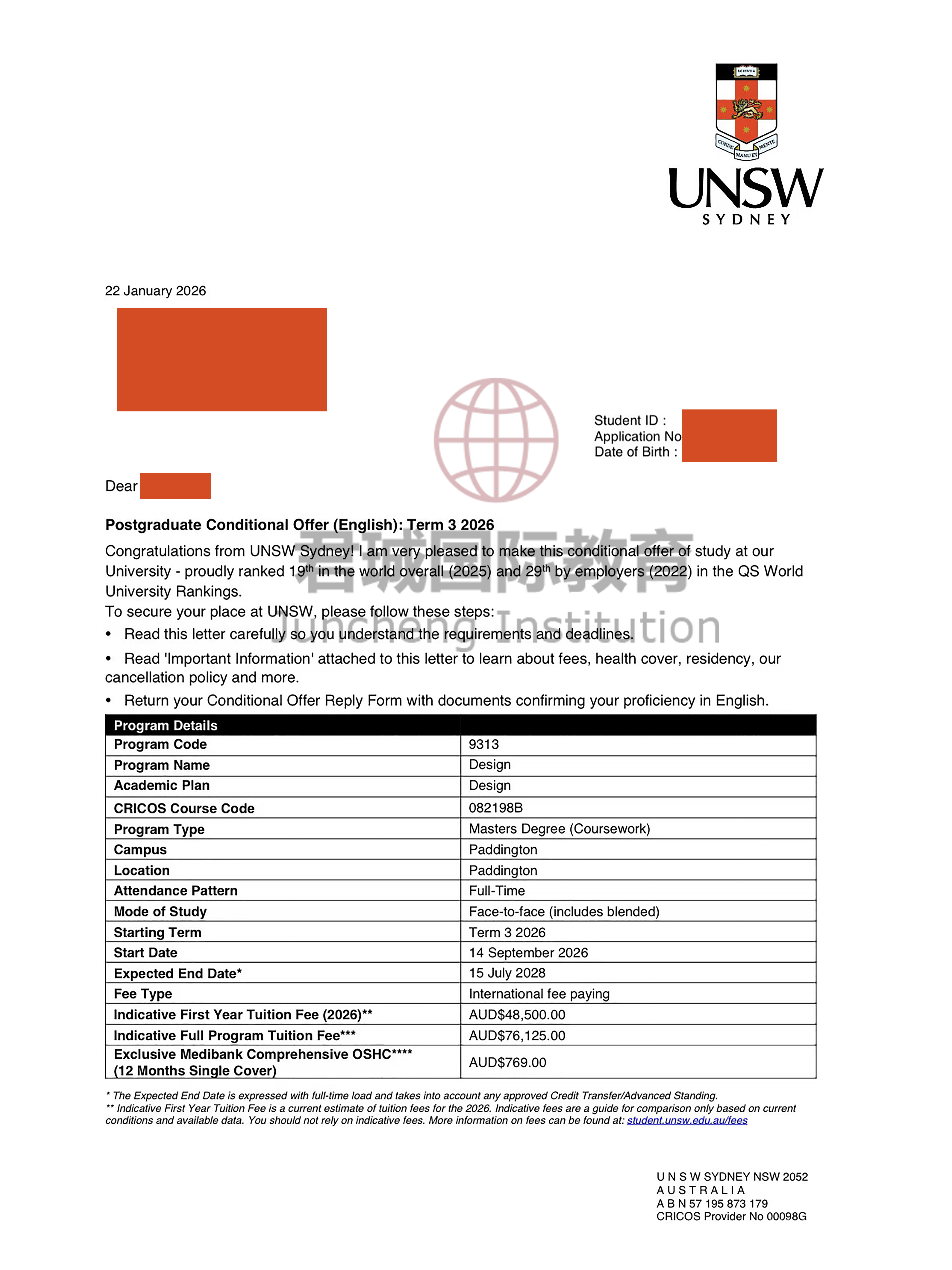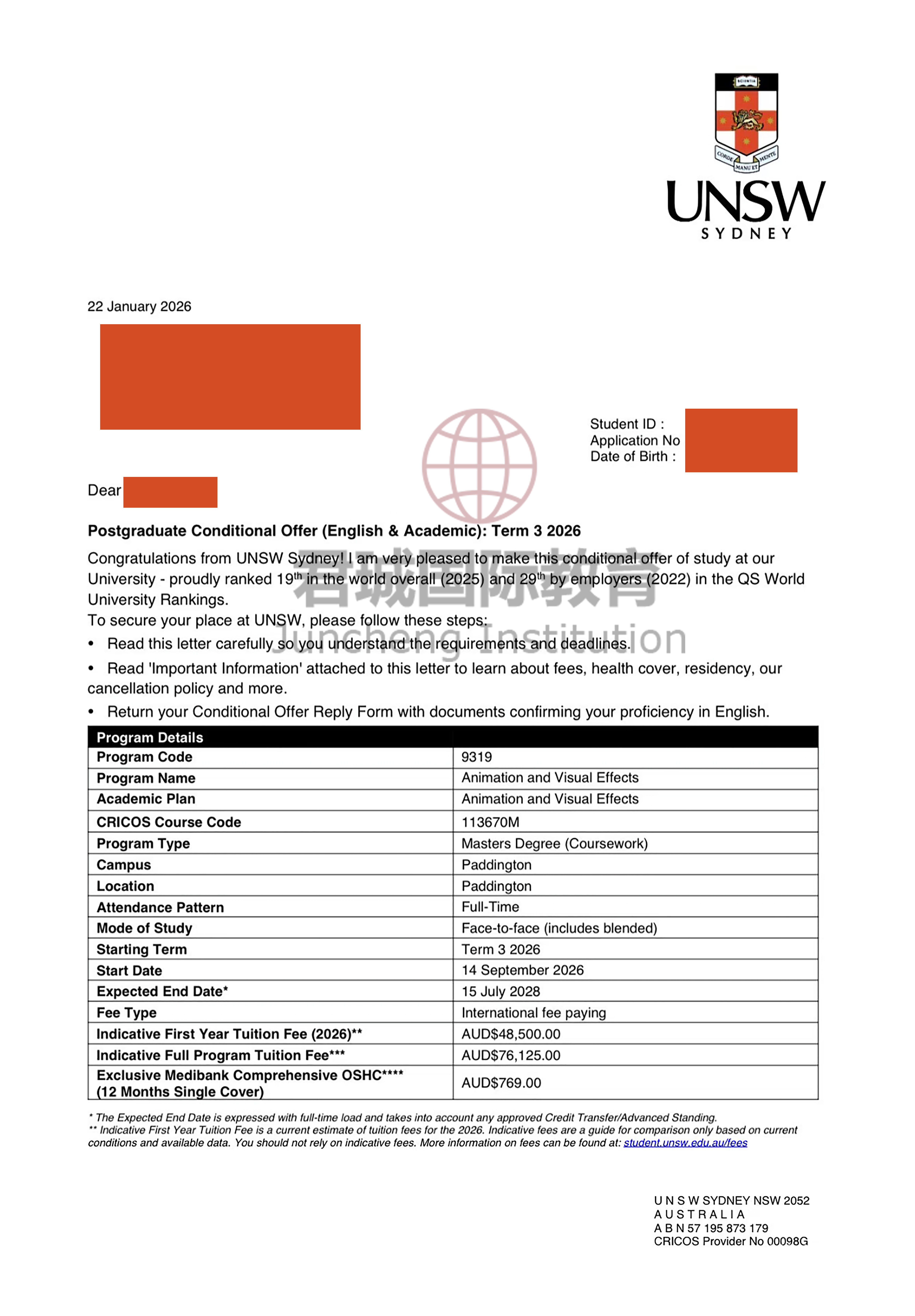 录取Offer:新南威尔士大学 University of New South Wales