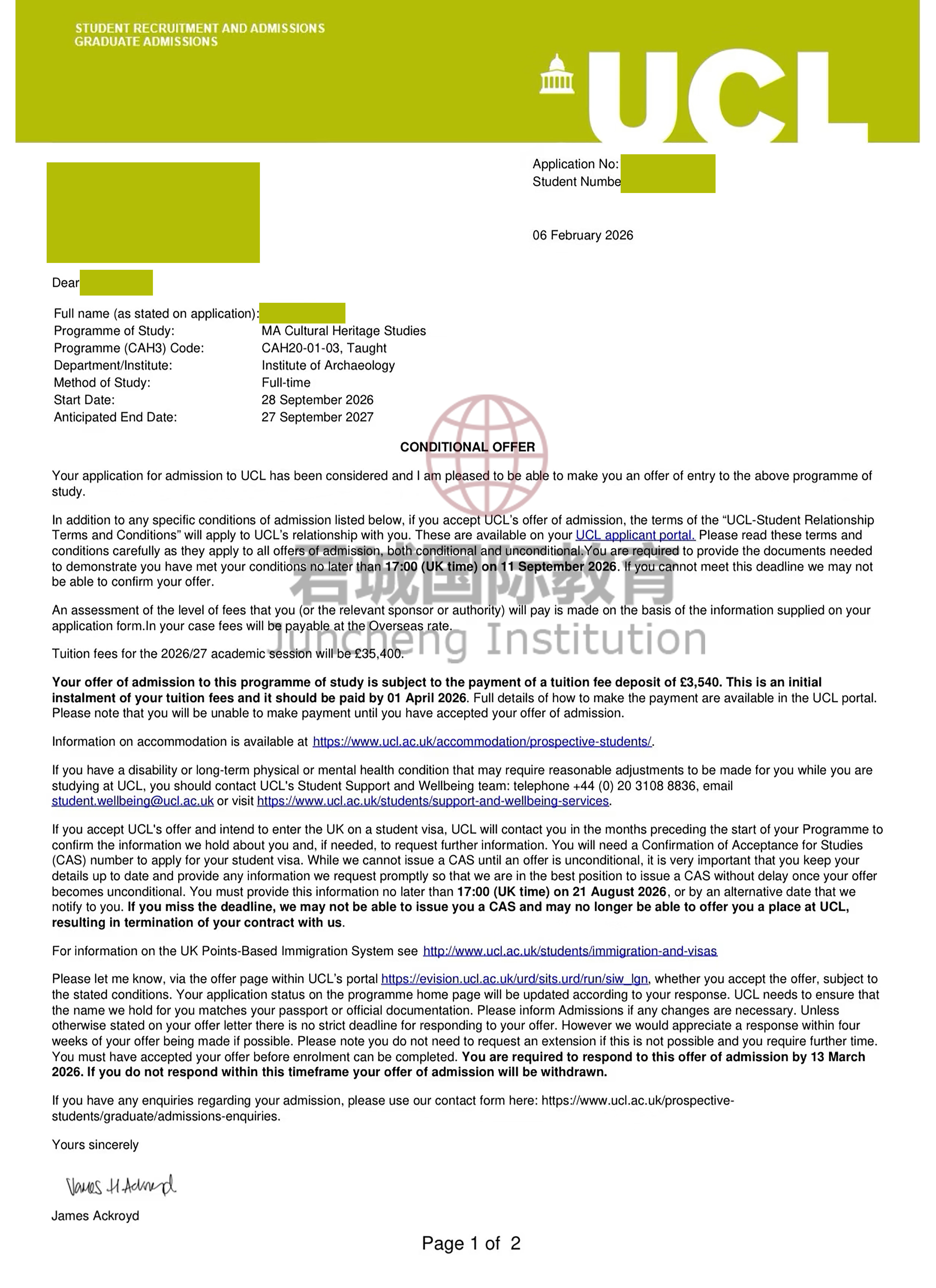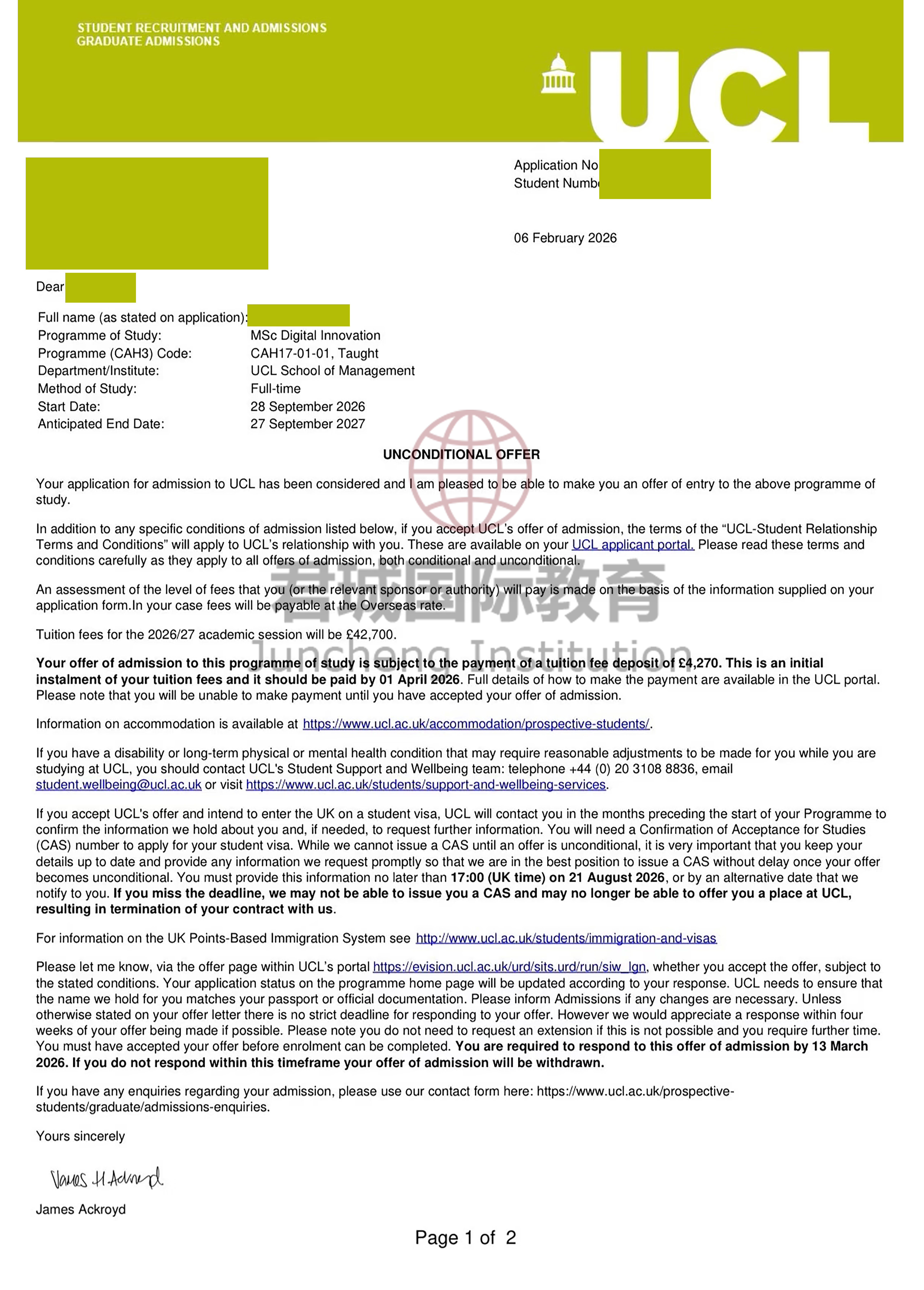 录取Offer:伦敦大学学院 University College London