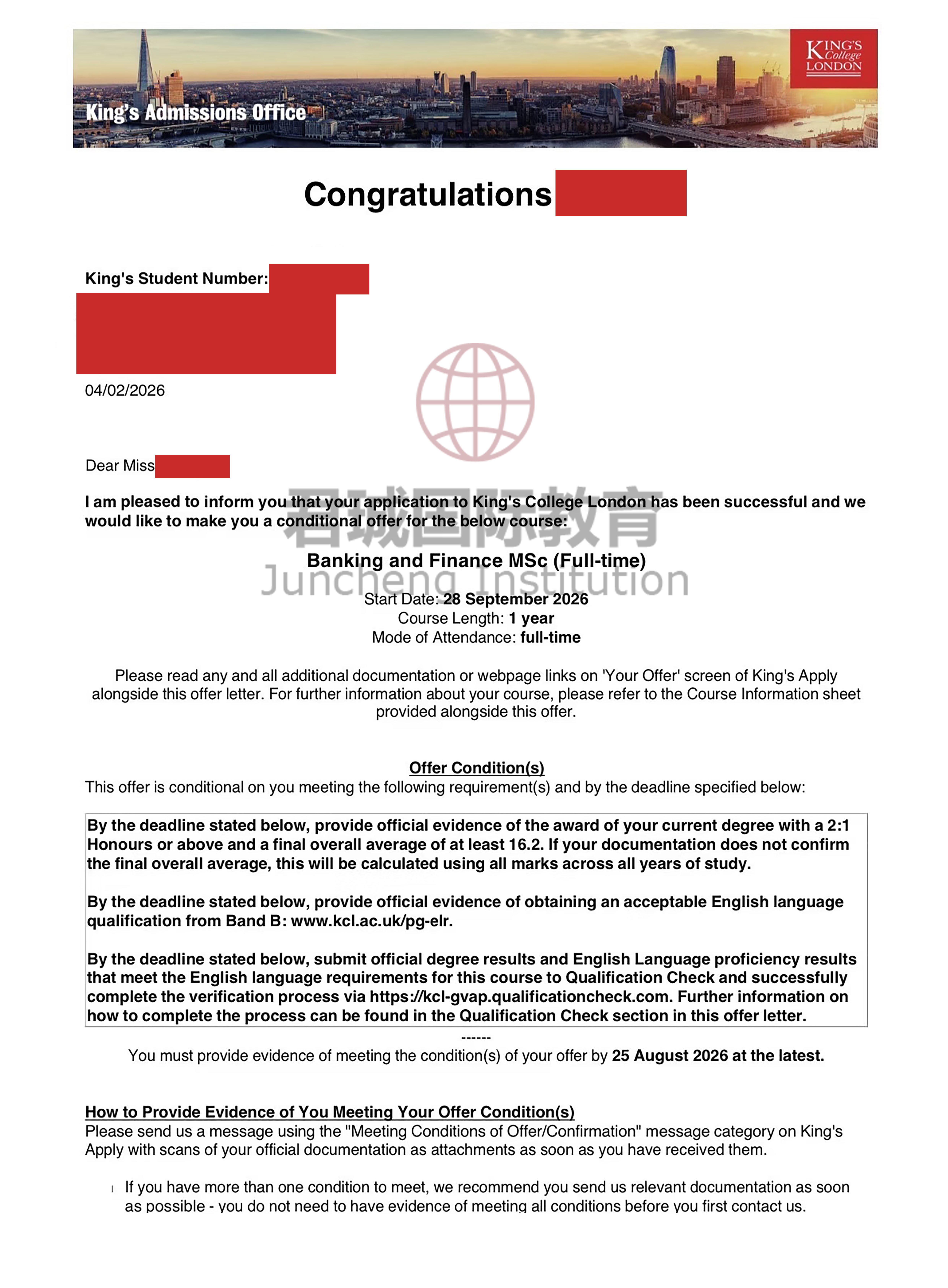 录取Offer:伦敦国王学院 King's College London