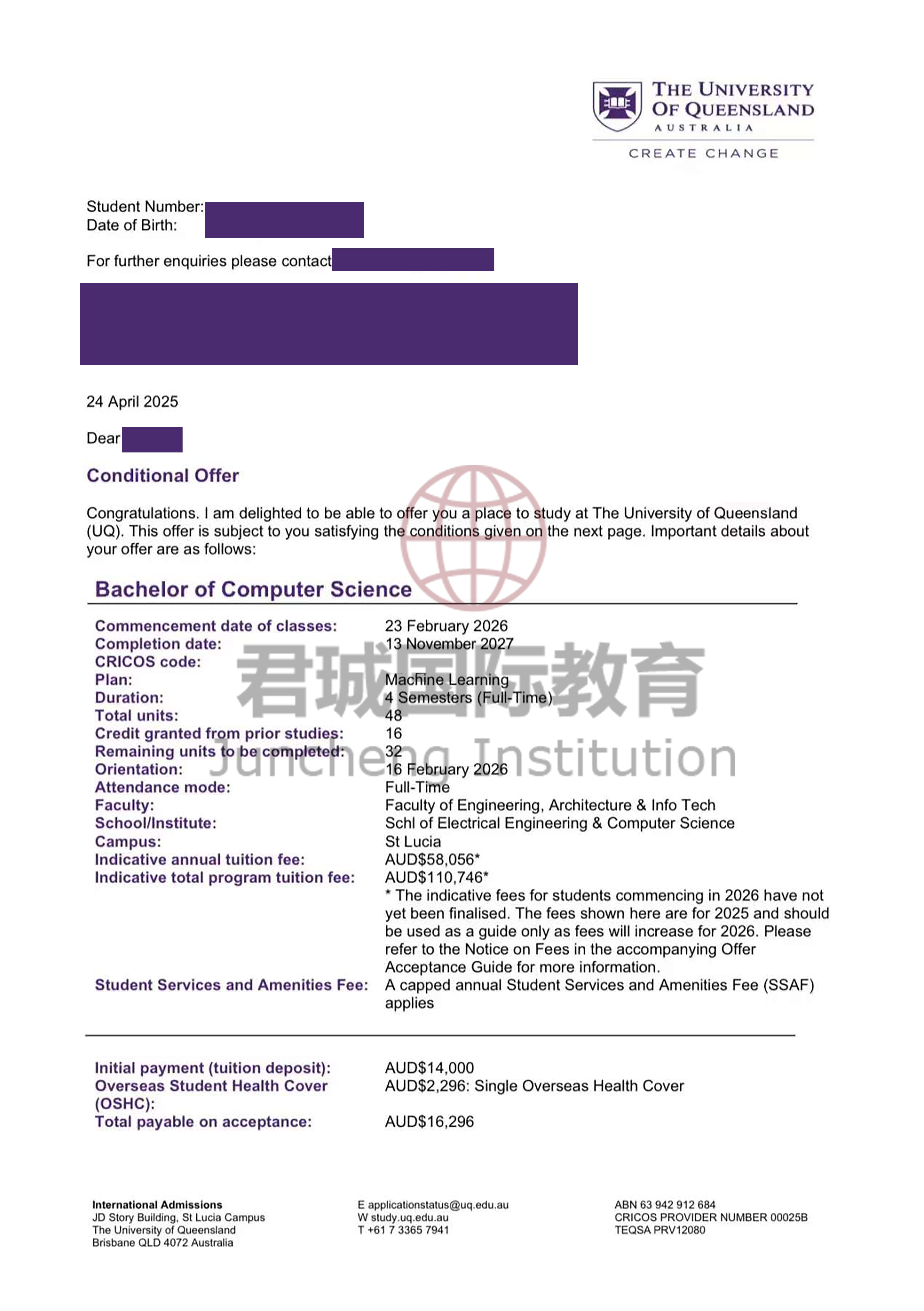 录取Offer:昆士兰大学 University of Queensland