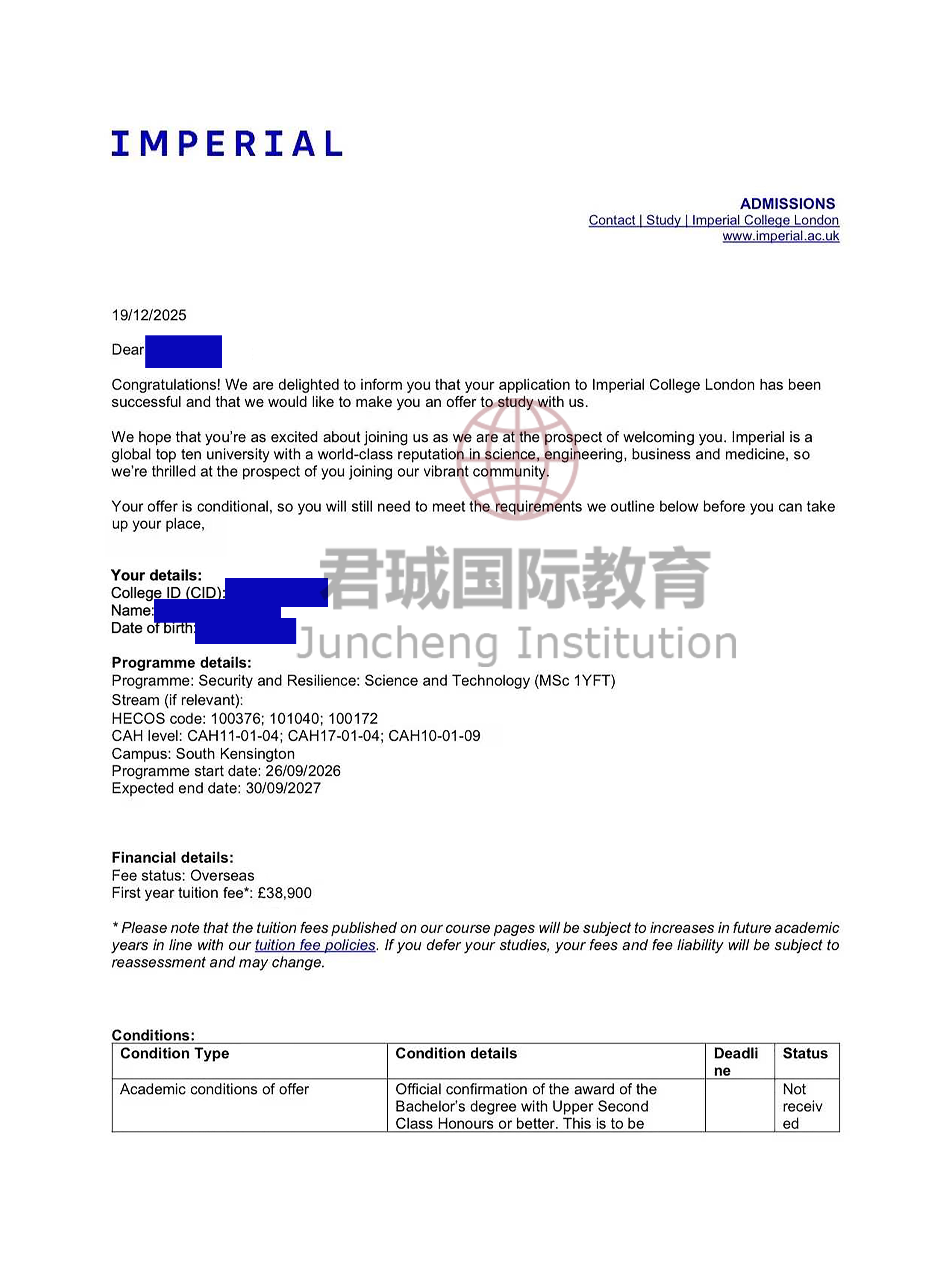 录取Offer:帝国理工学院 Imperial College London