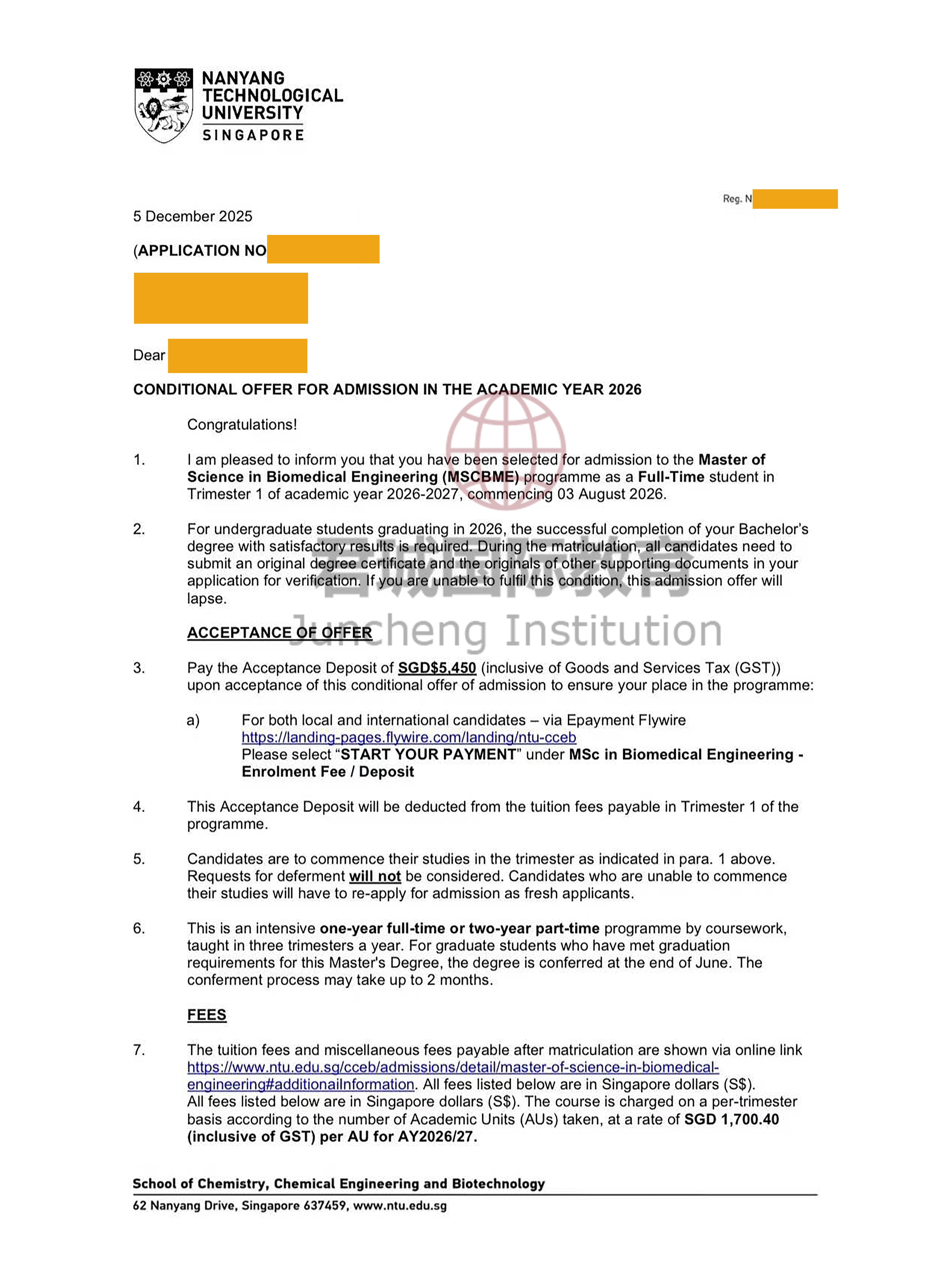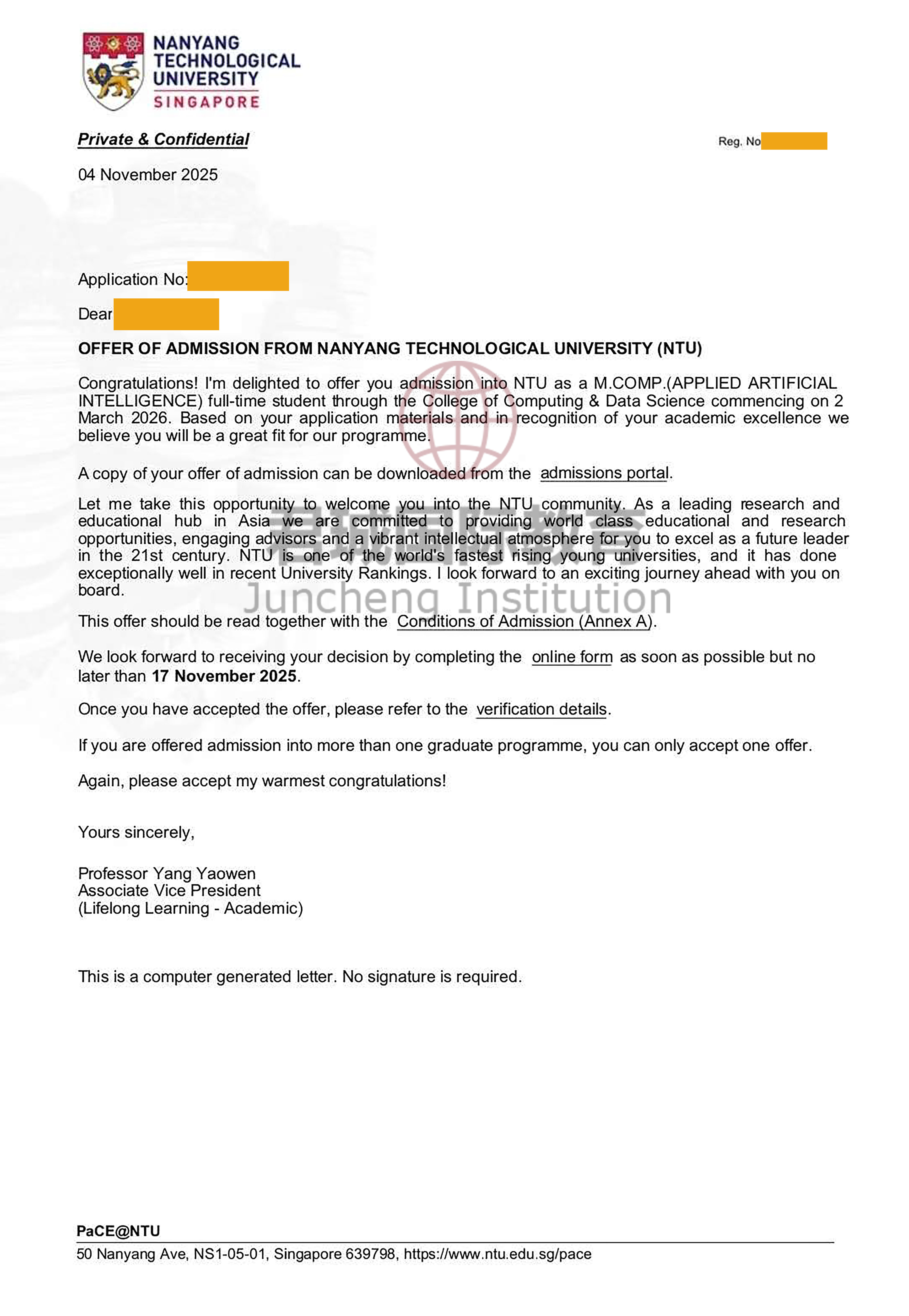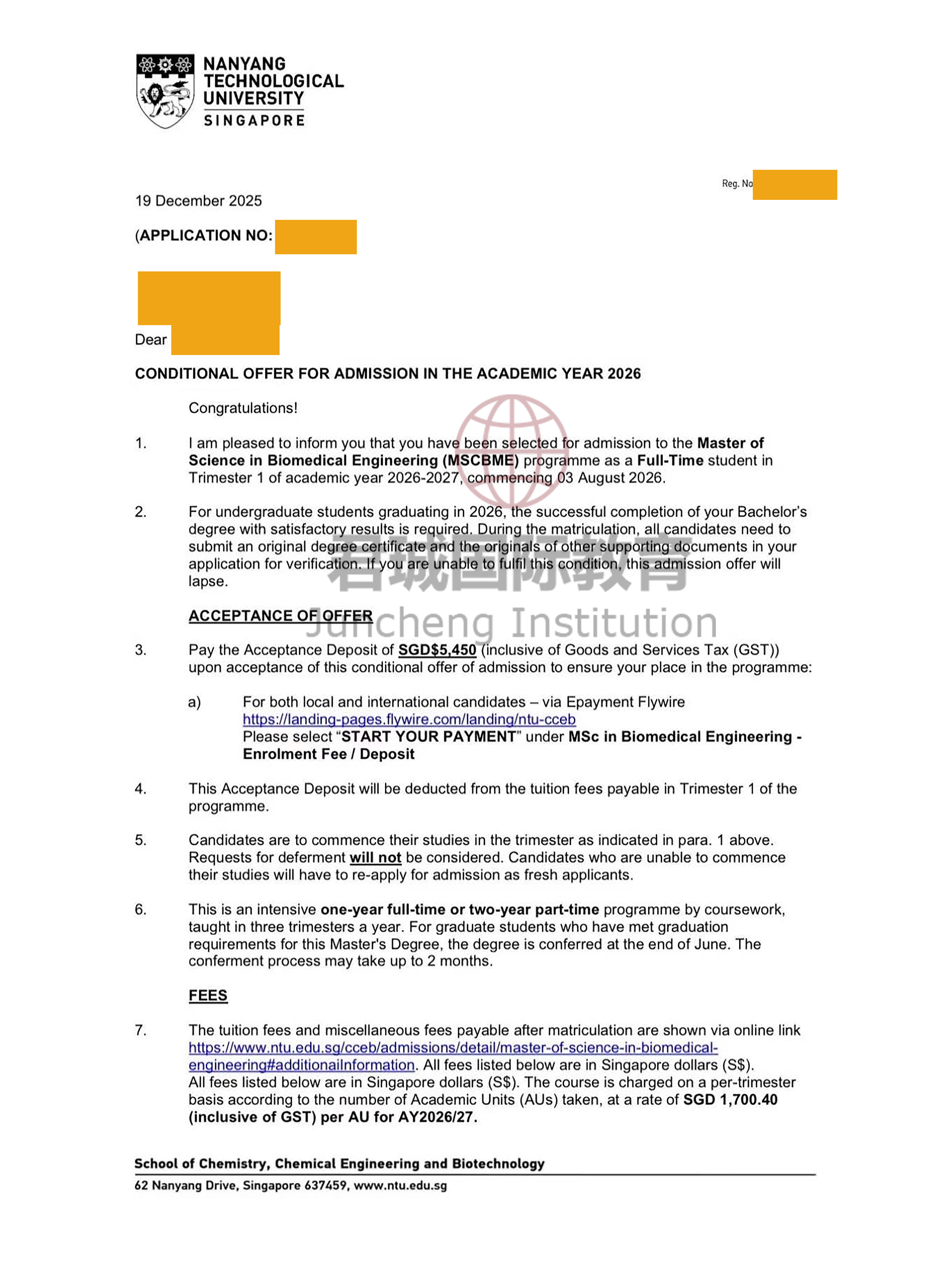 录取Offer:南洋理工大学 Nanyang Technological University, Singapore