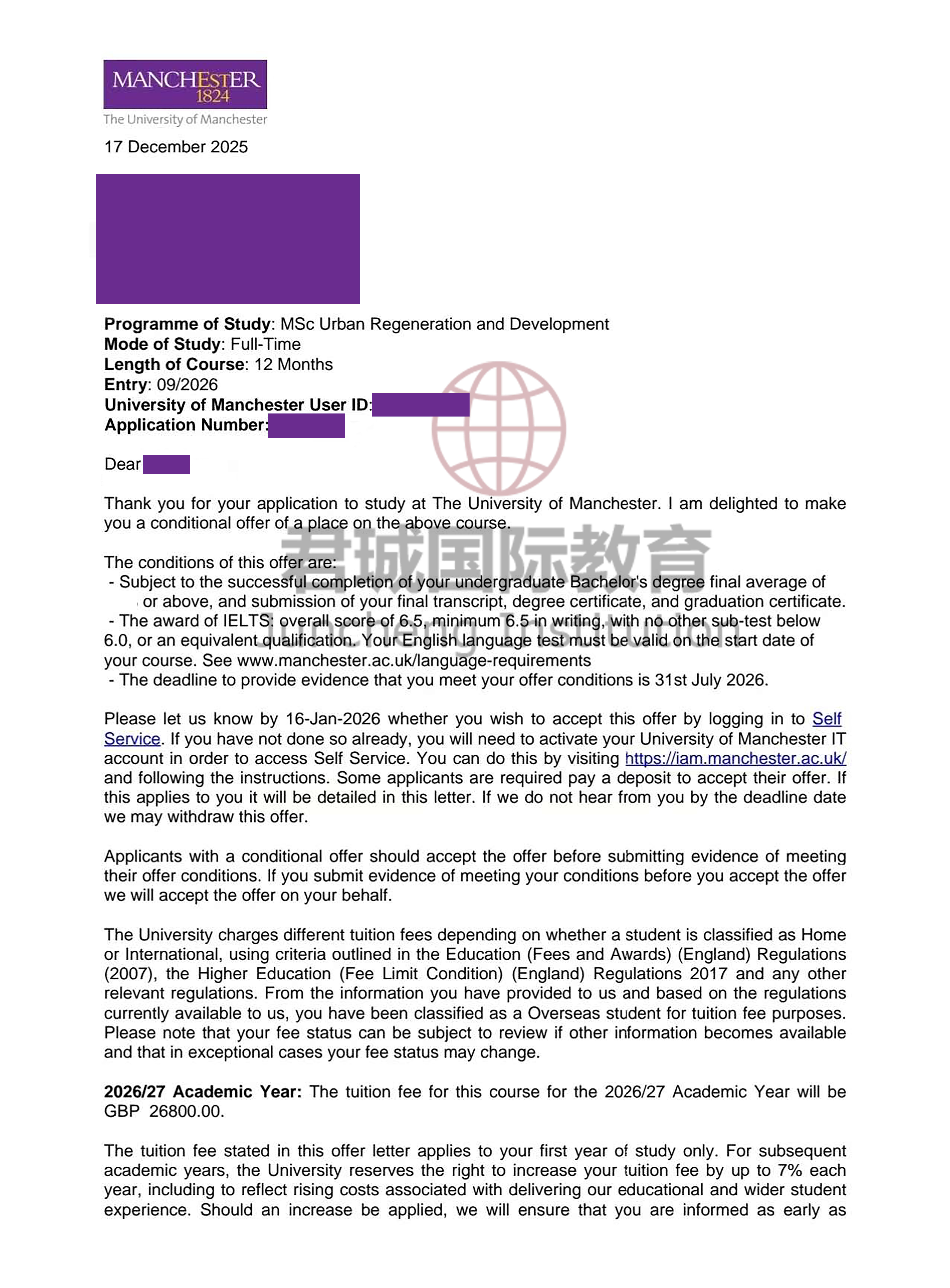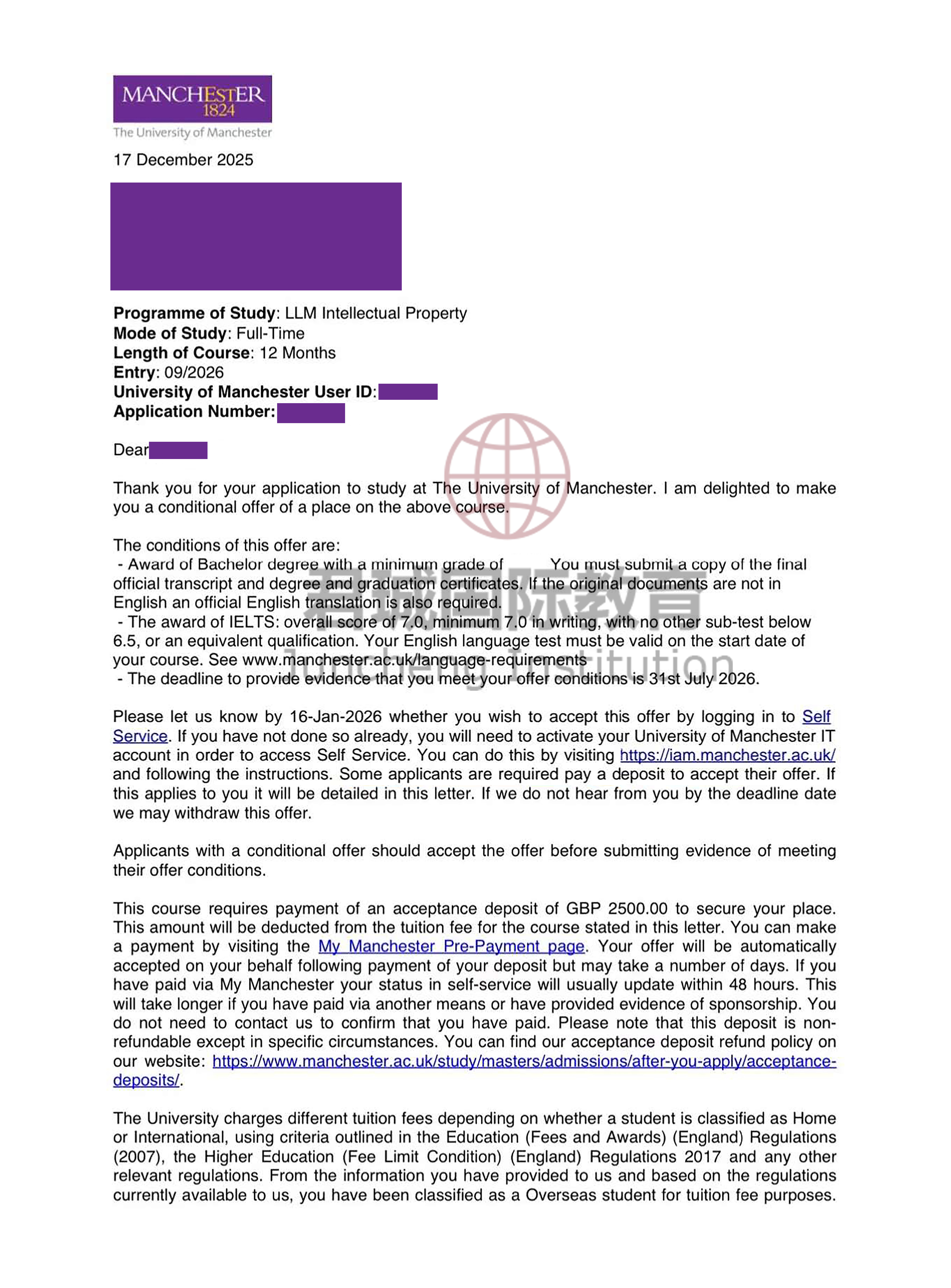 录取Offer:曼彻斯特大学 Manchester University