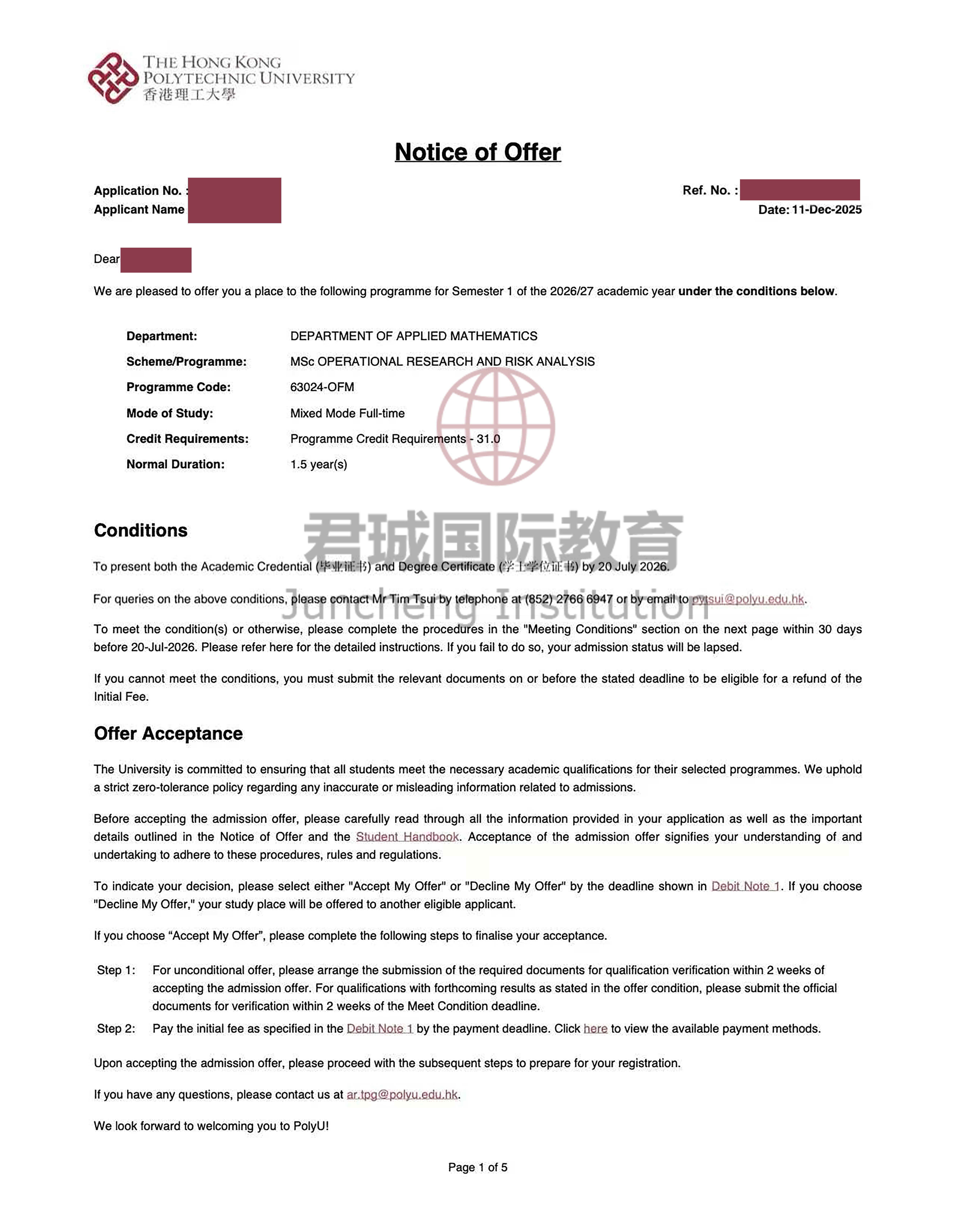 录取Offer:香港理工大学 Hong Kong Polytechnic University