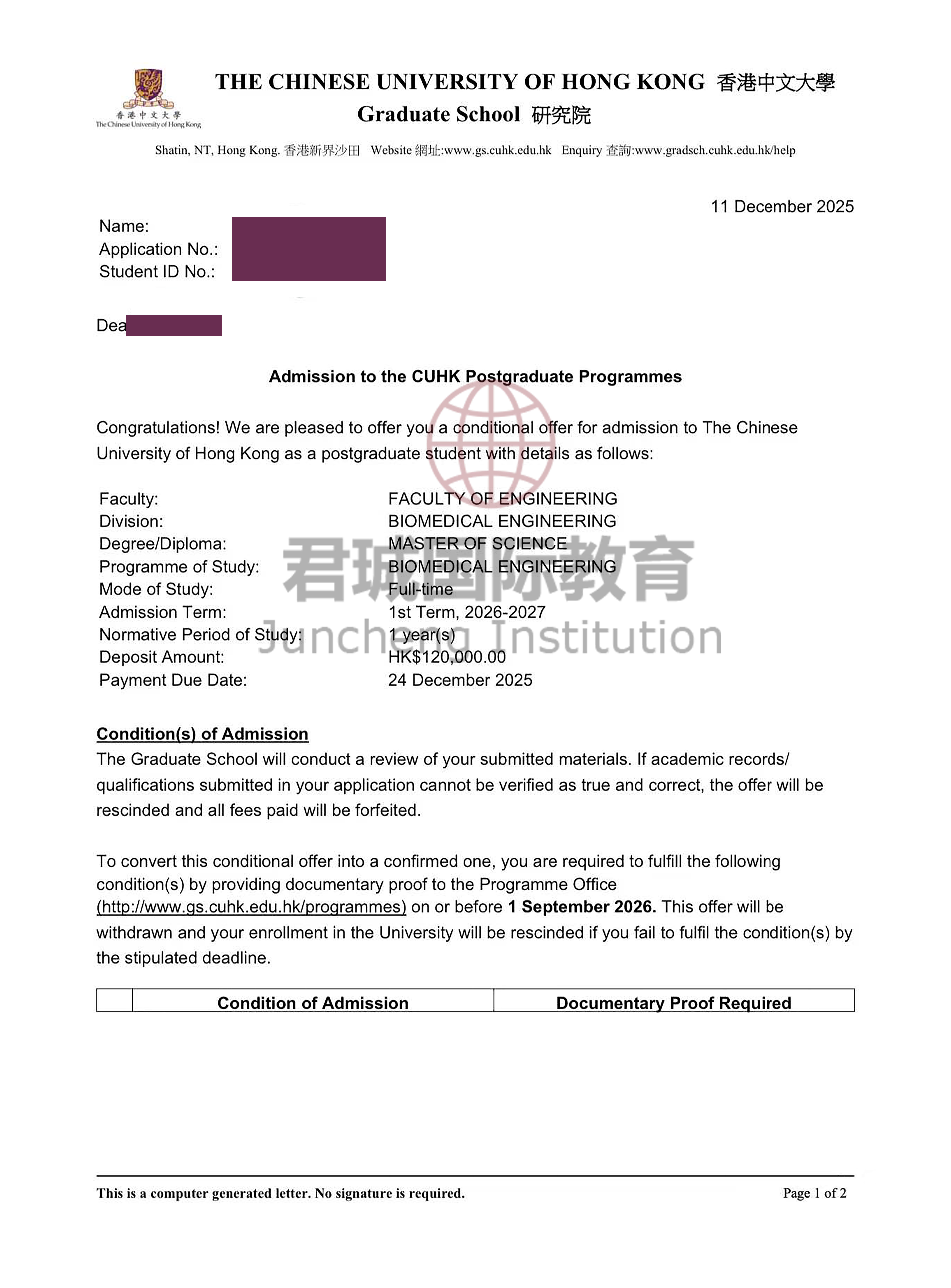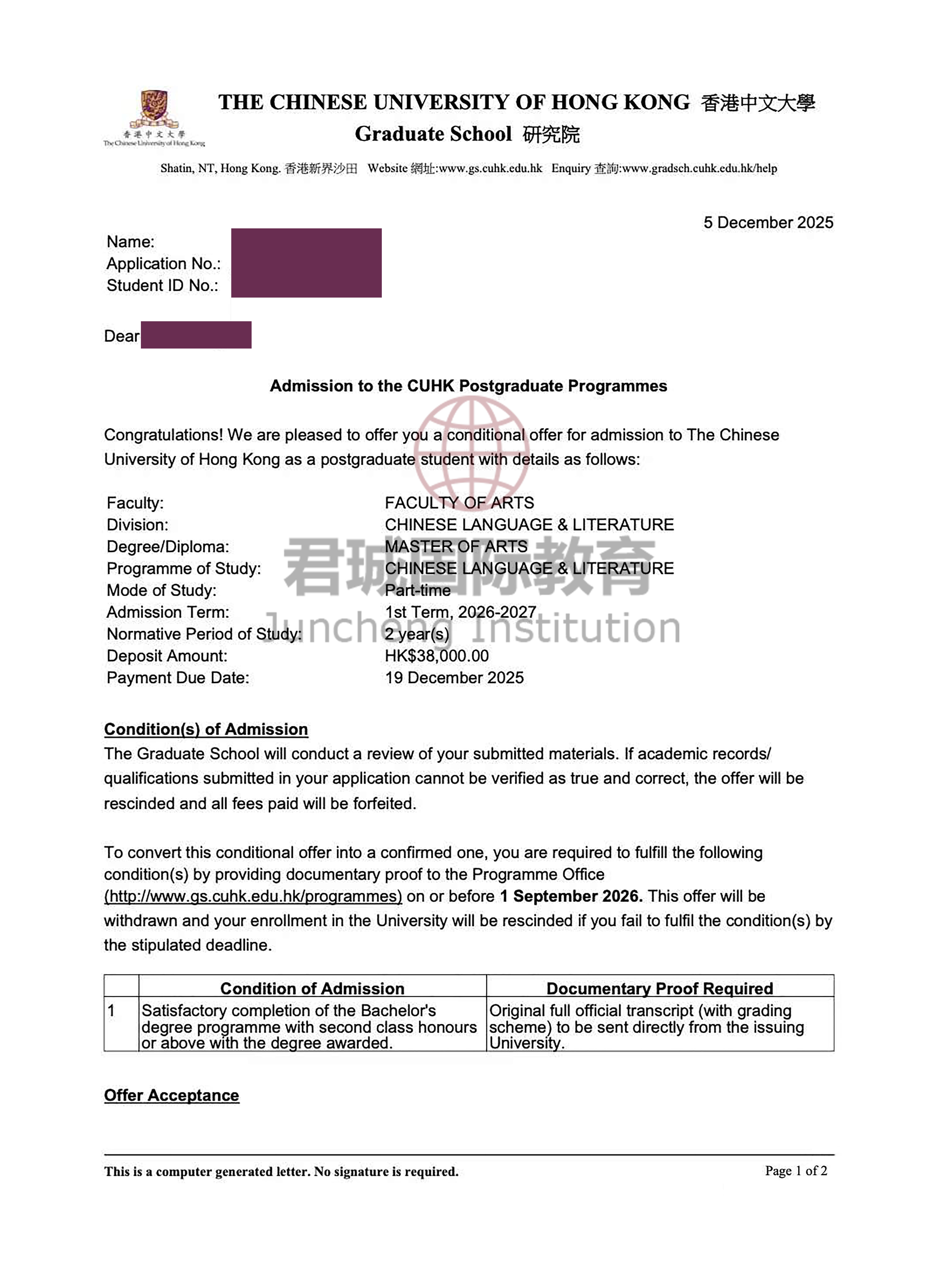 录取Offer:香港中文大学 The Chinese University of Hong Kong