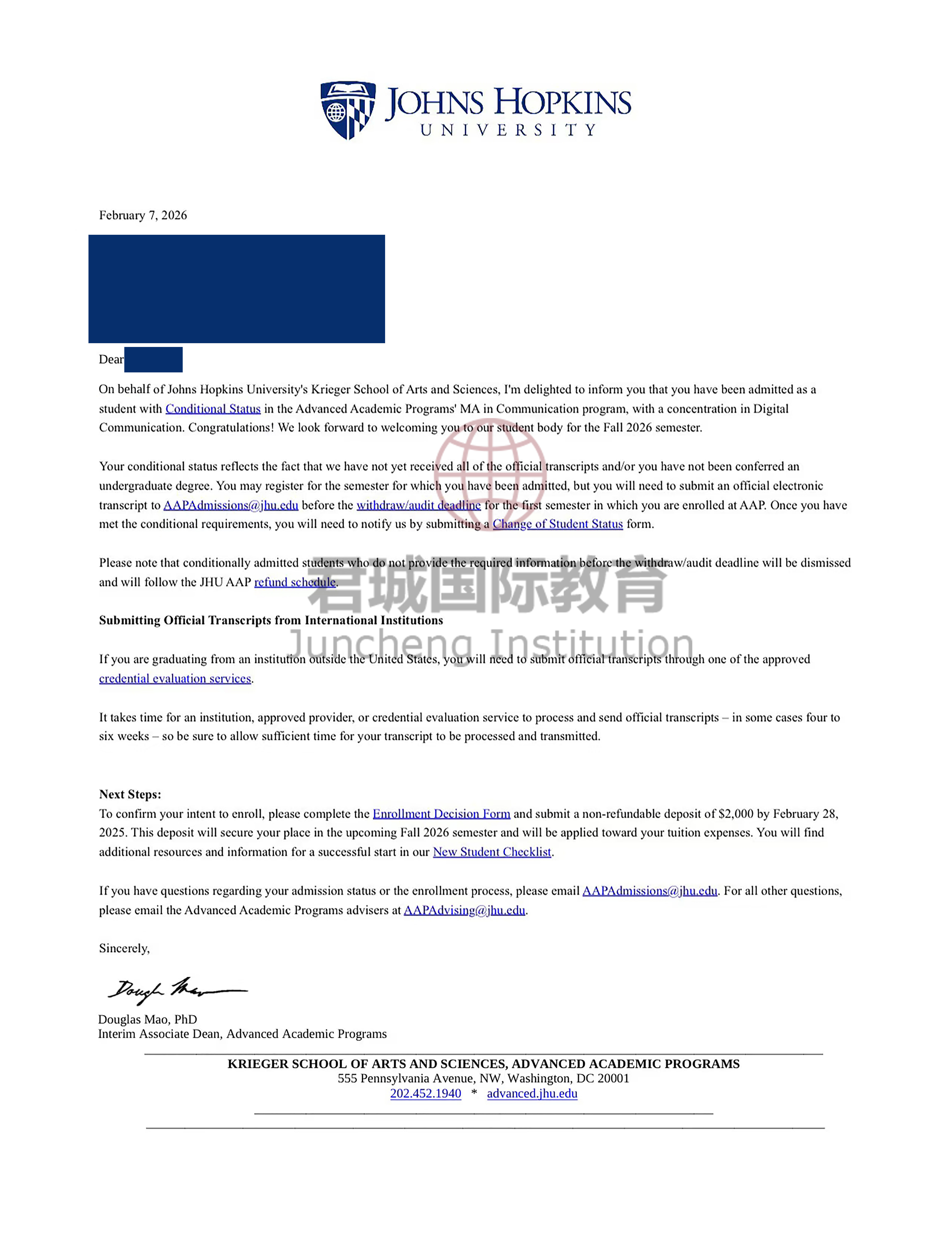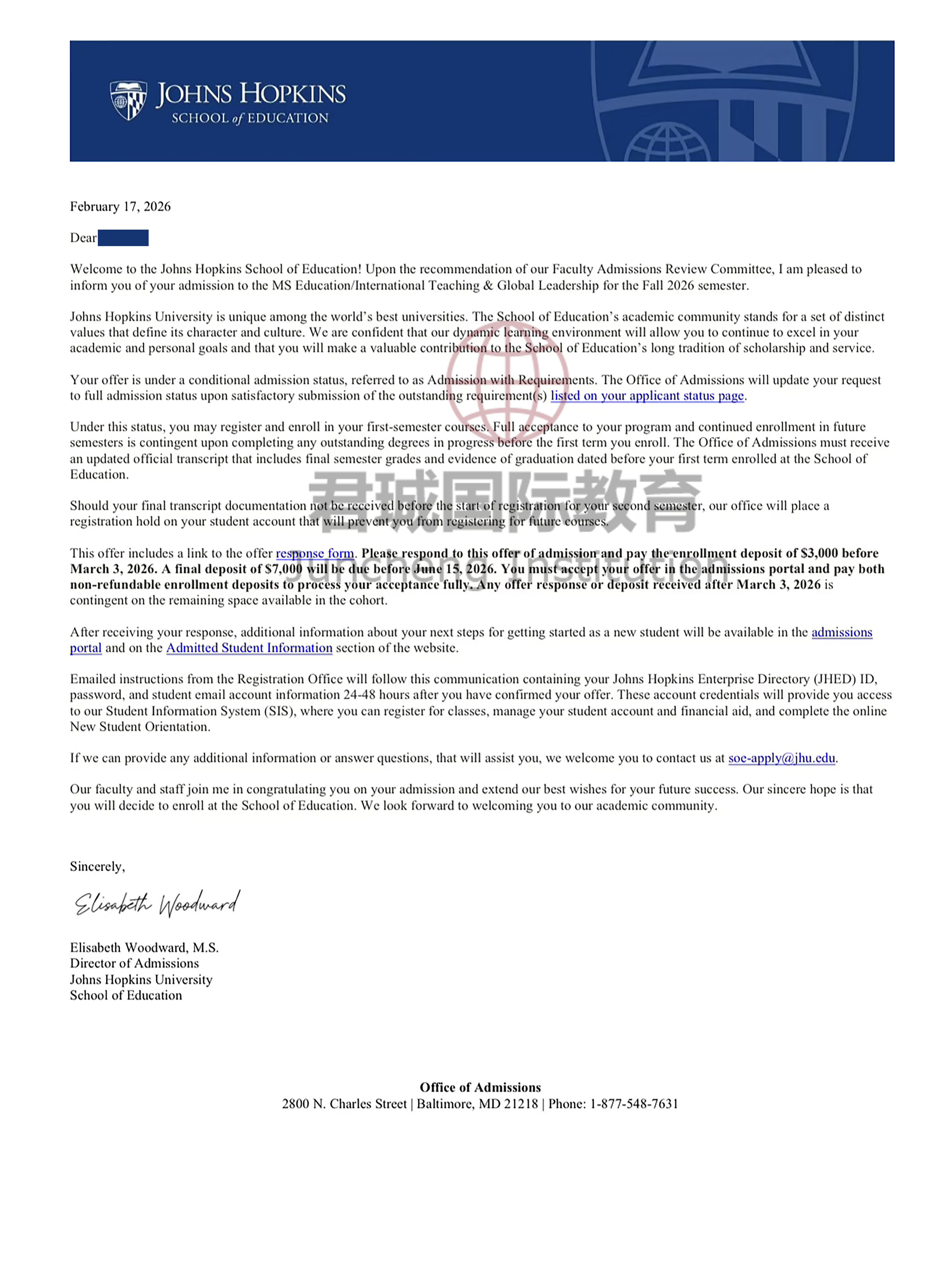 录取Offer:约翰霍普金斯大学 The Johns Hopkins University
