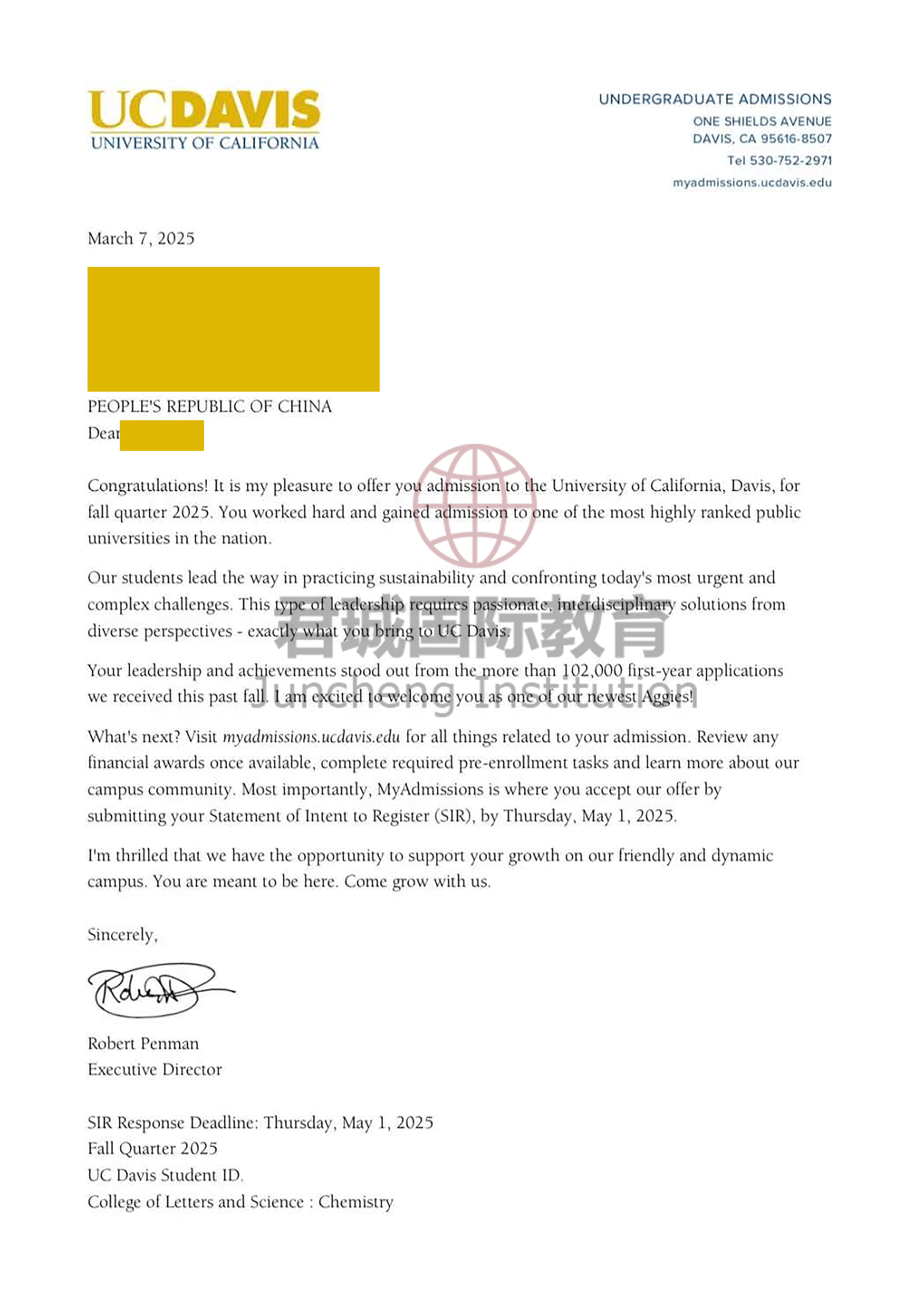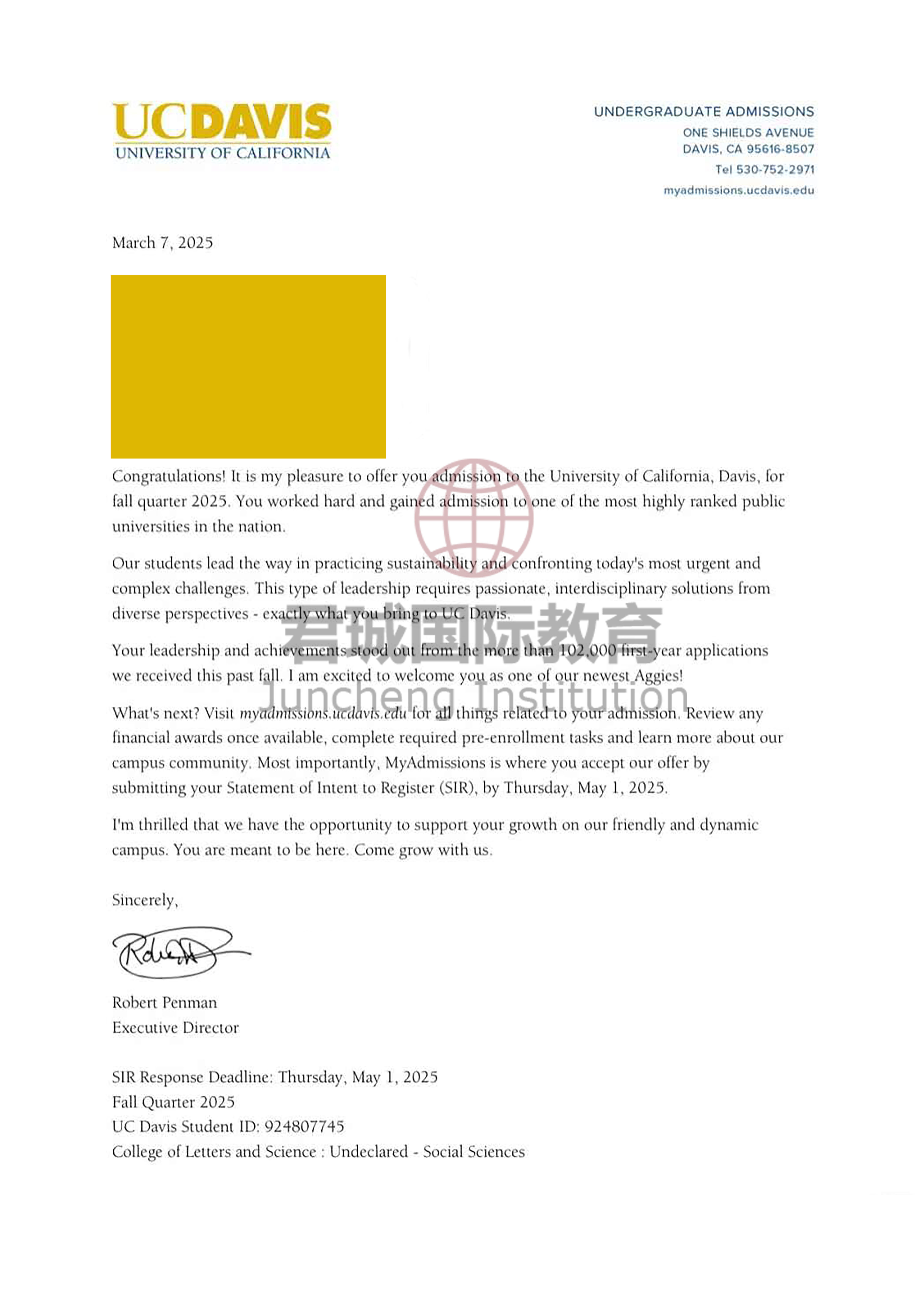 录取Offer:加州大学戴维斯分校 University of California, Davis