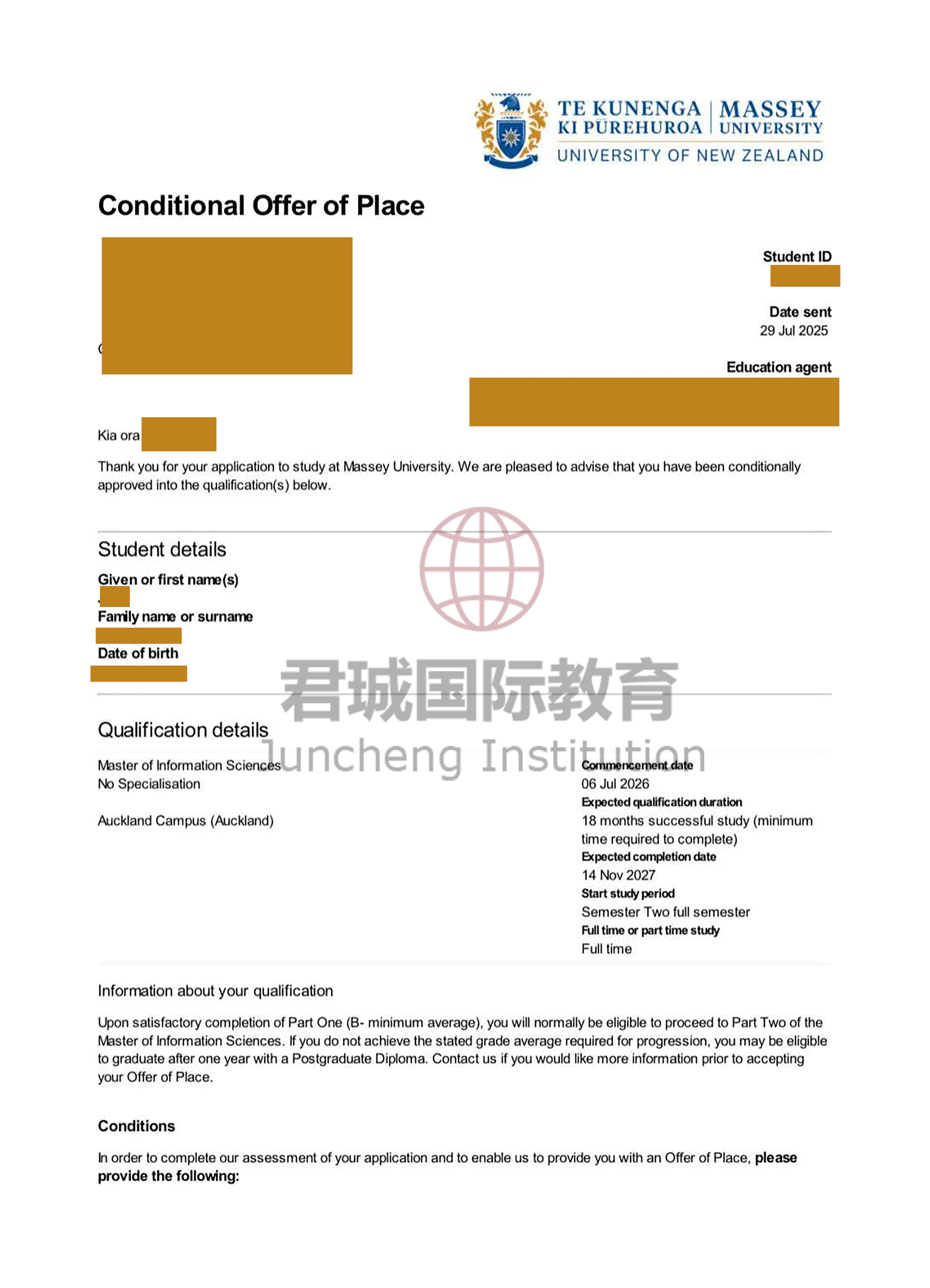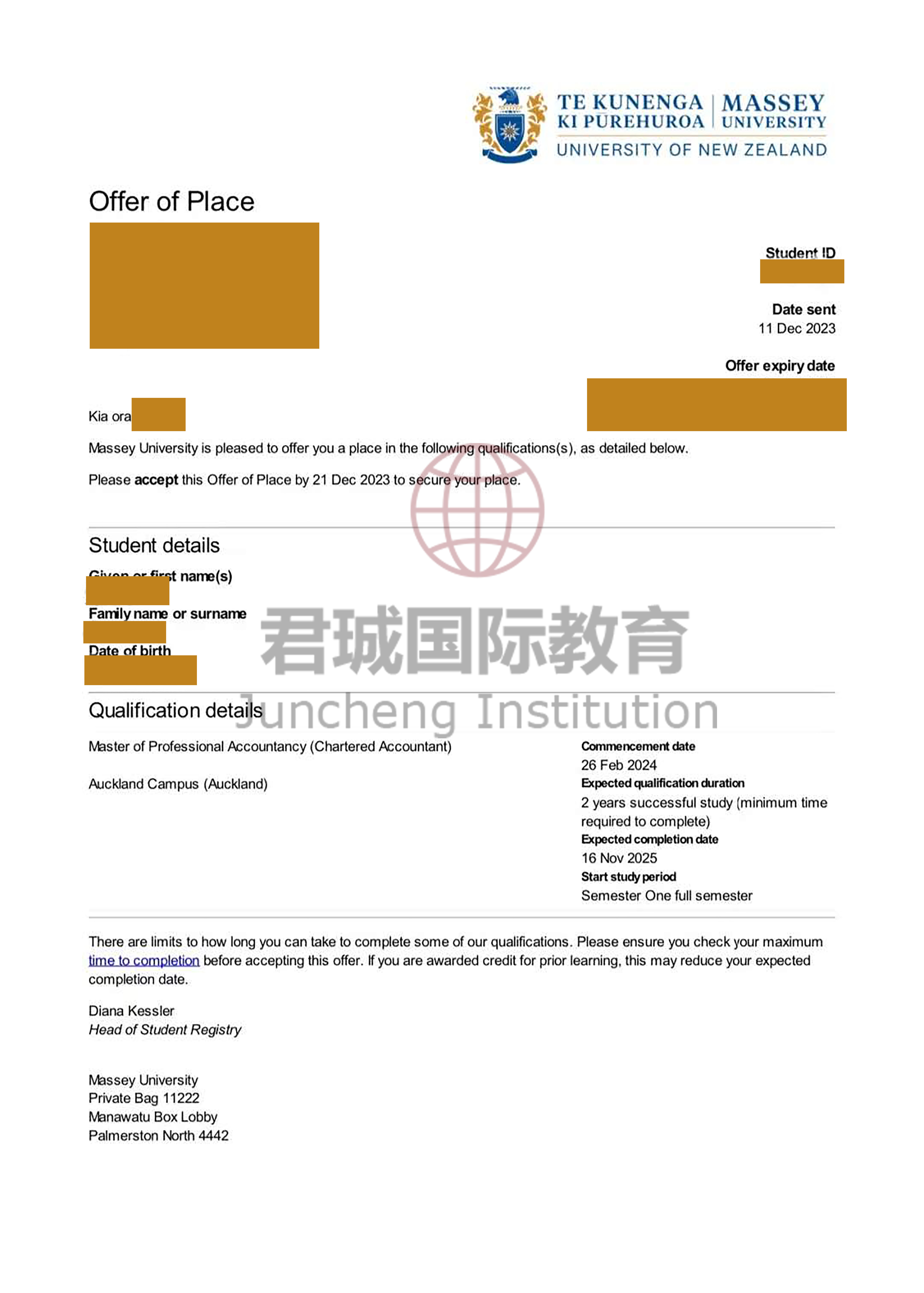 录取Offer:新西兰梅西大学 Massey University