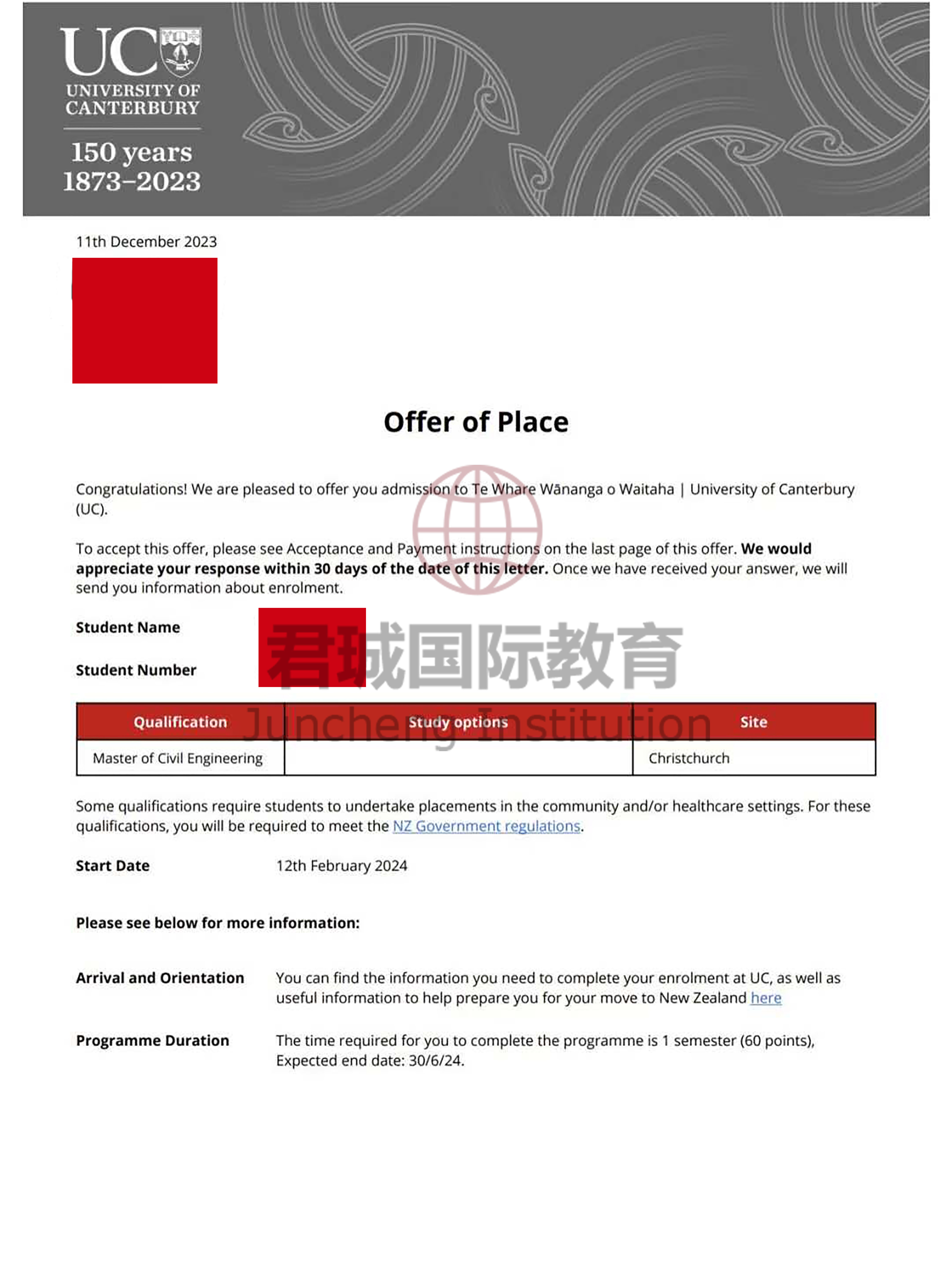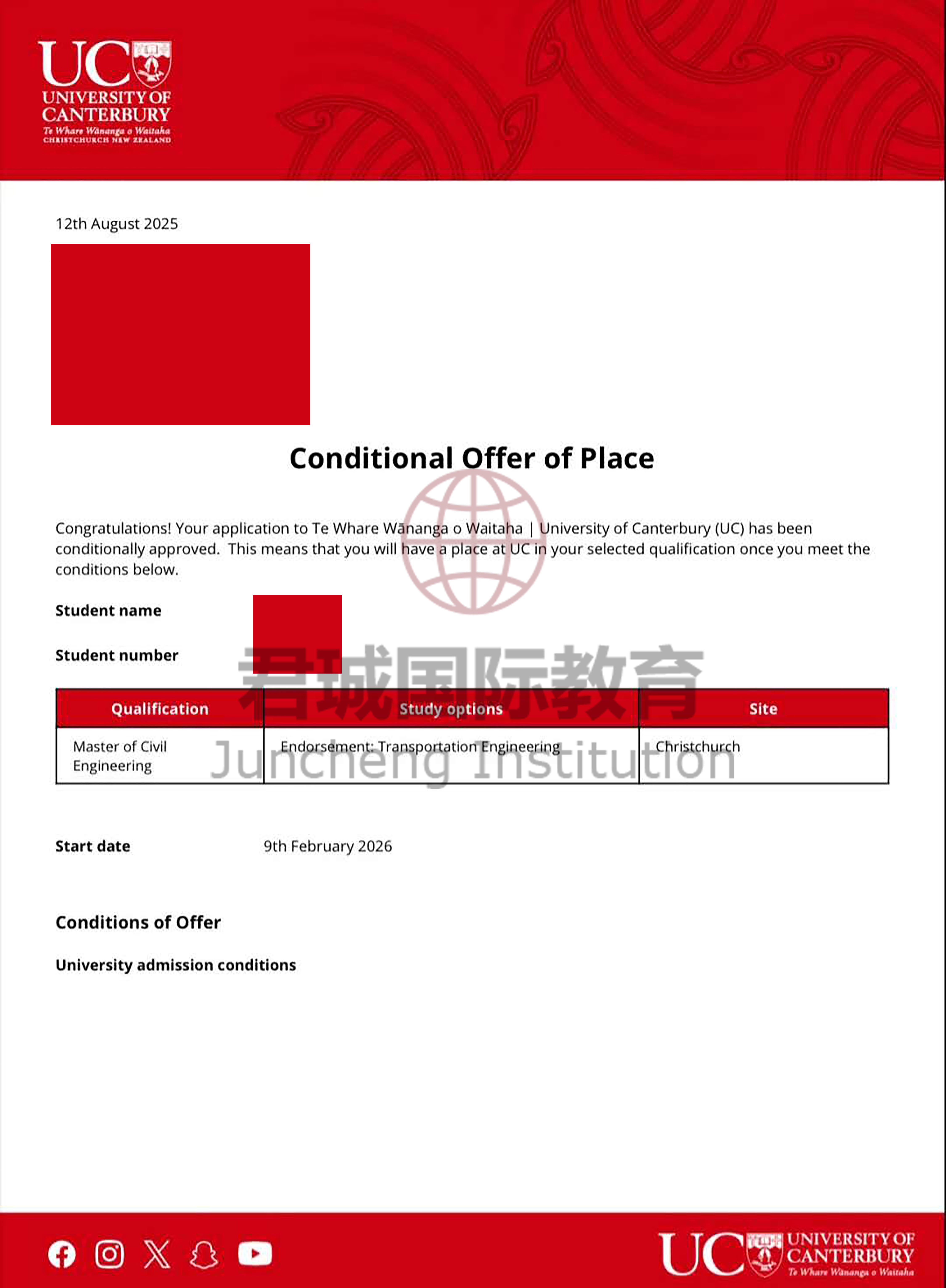 录取Offer:坎特伯雷大学 University of Canterbury