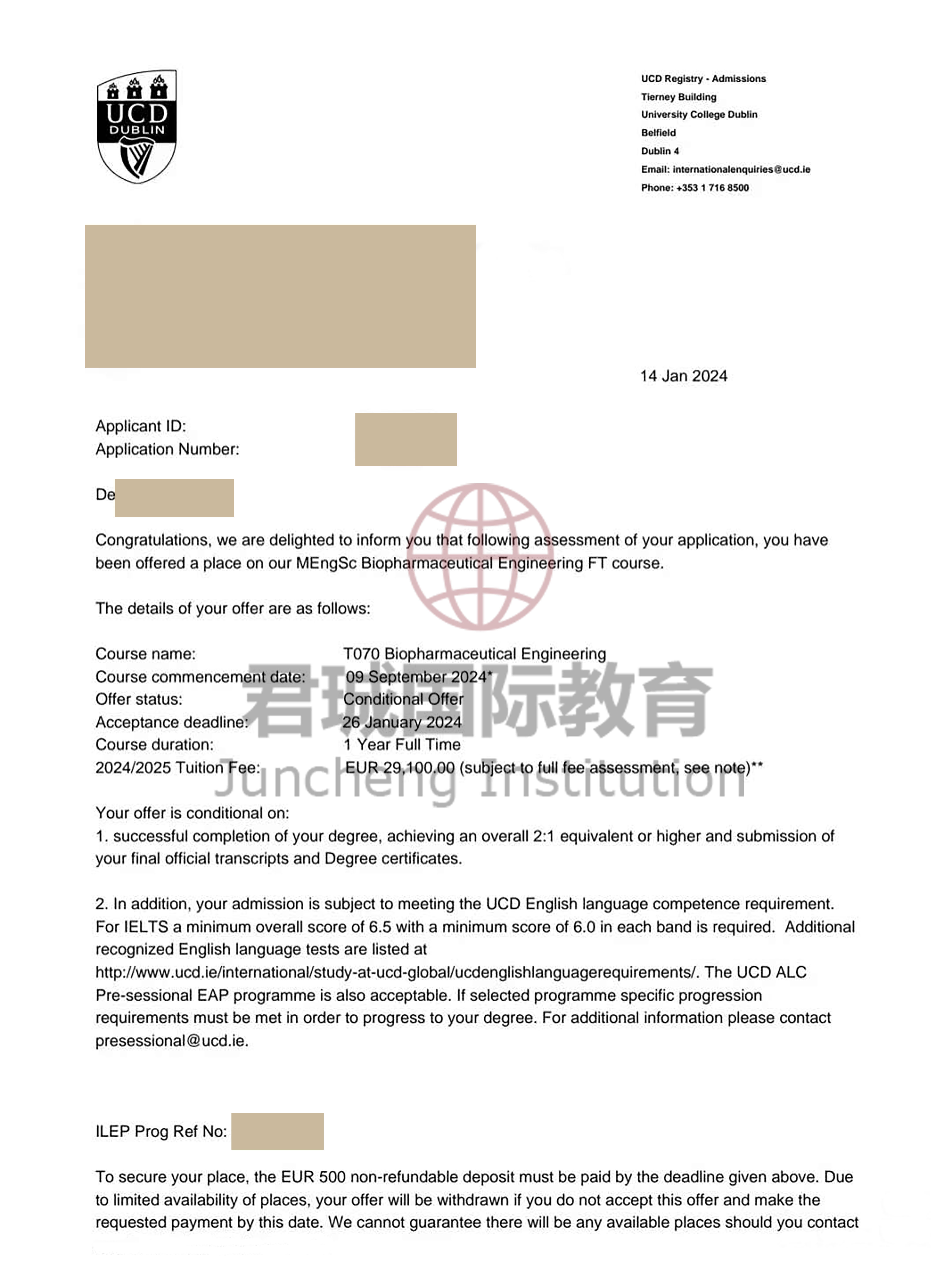 录取Offer:都柏林大学学院 University College Dublin