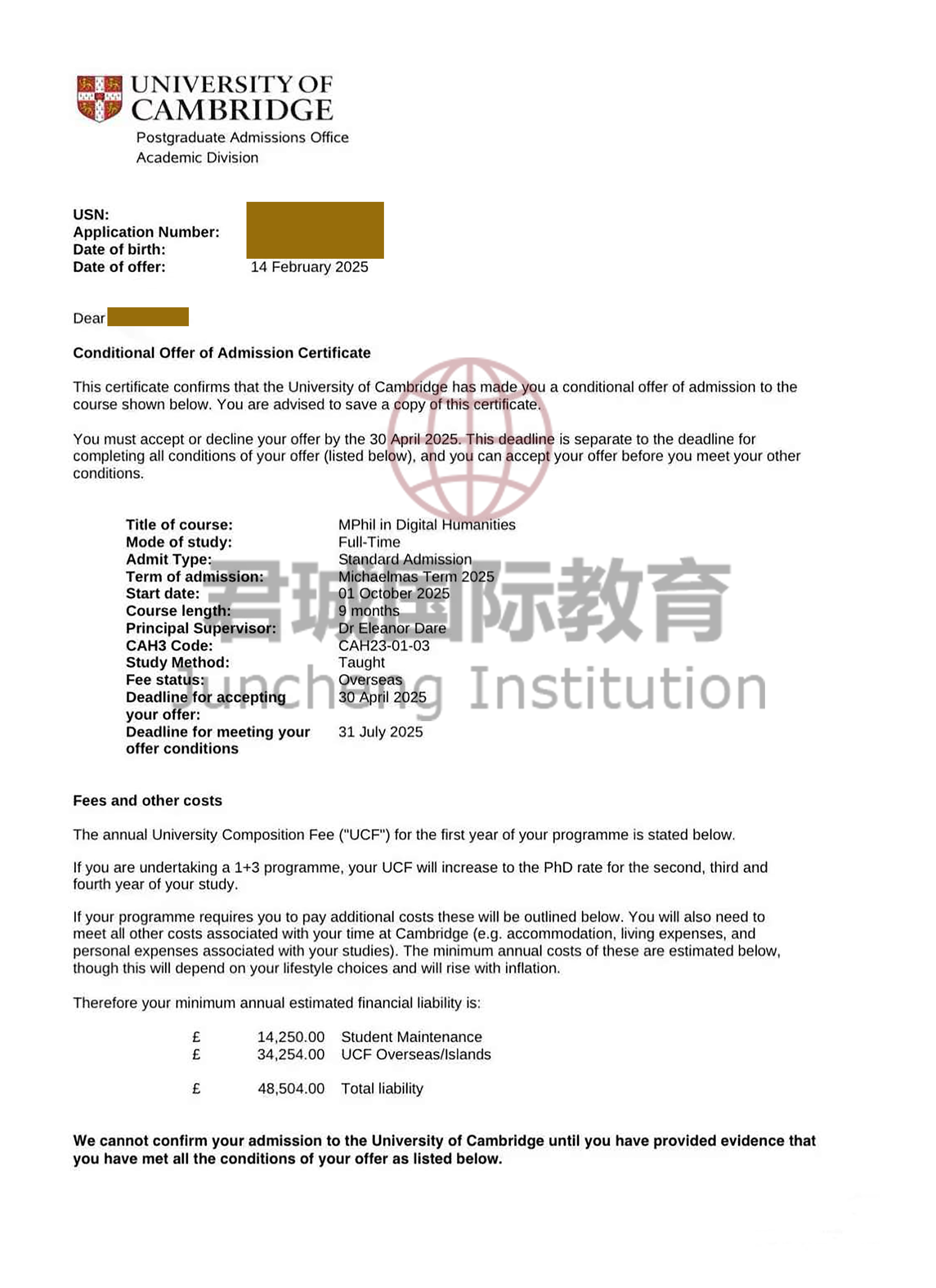 录取Offer:剑桥大学 University of Cambridge