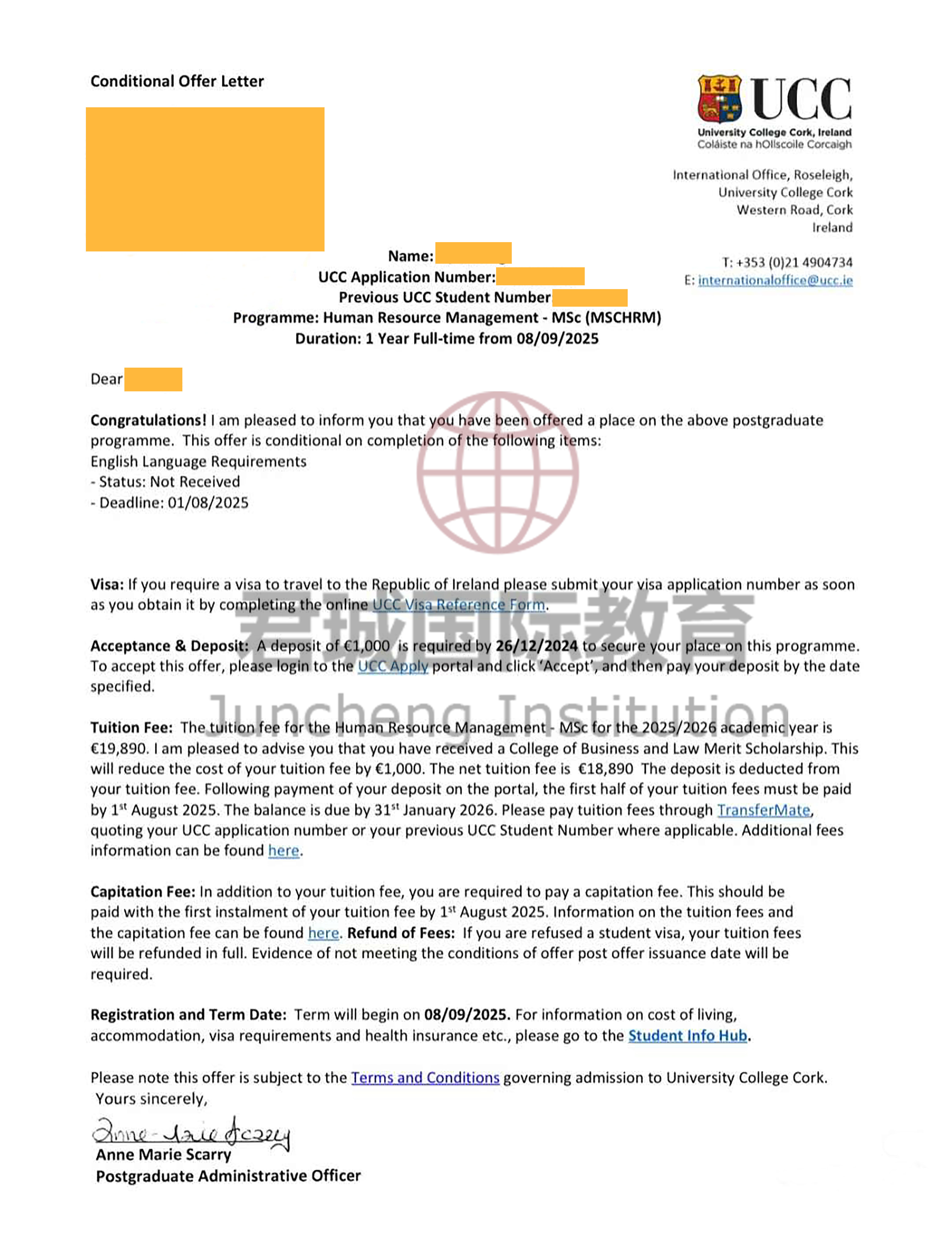 录取Offer:科克大学 University College Cork