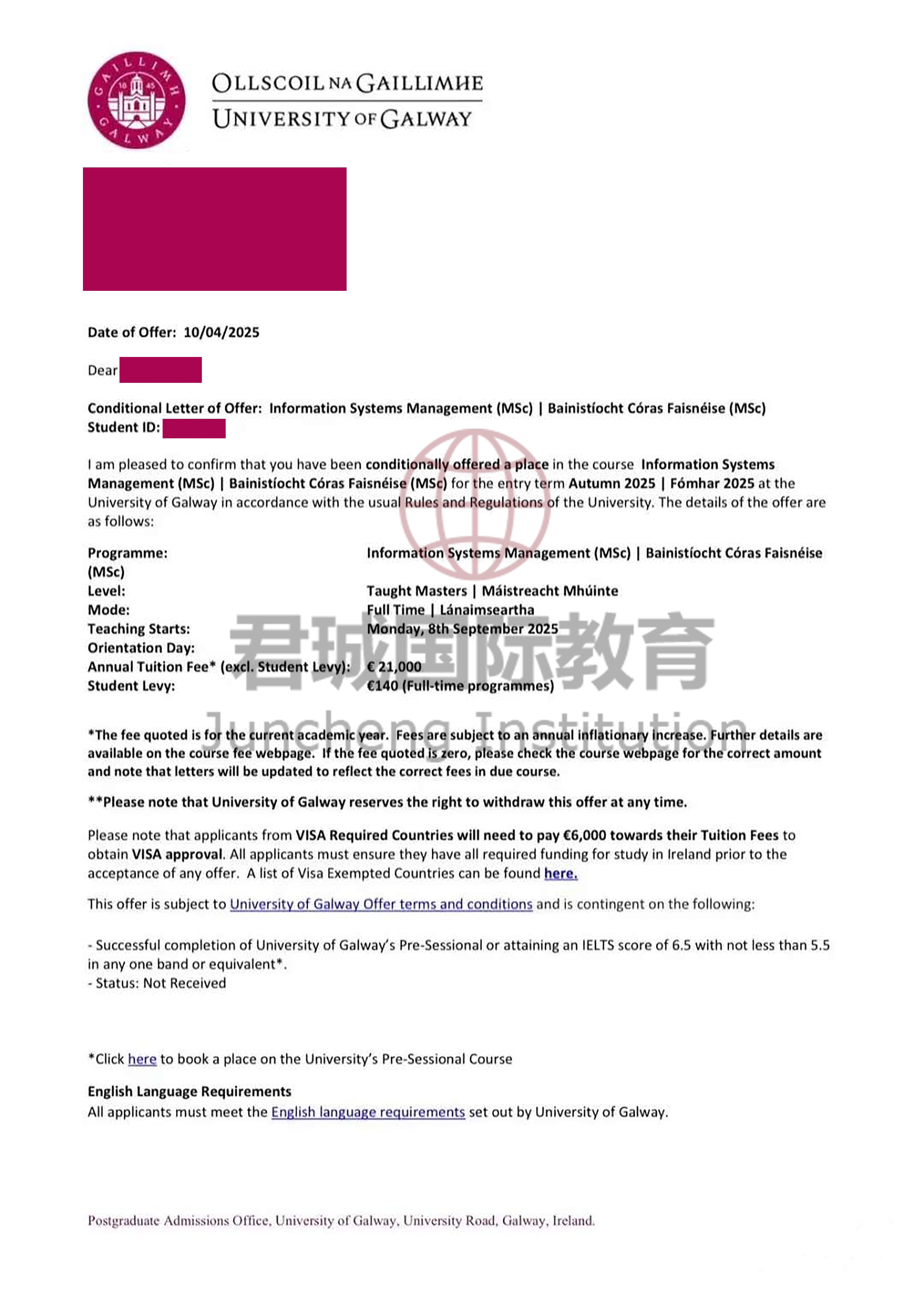 录取Offer:爱尔兰高威大学 University of Galway