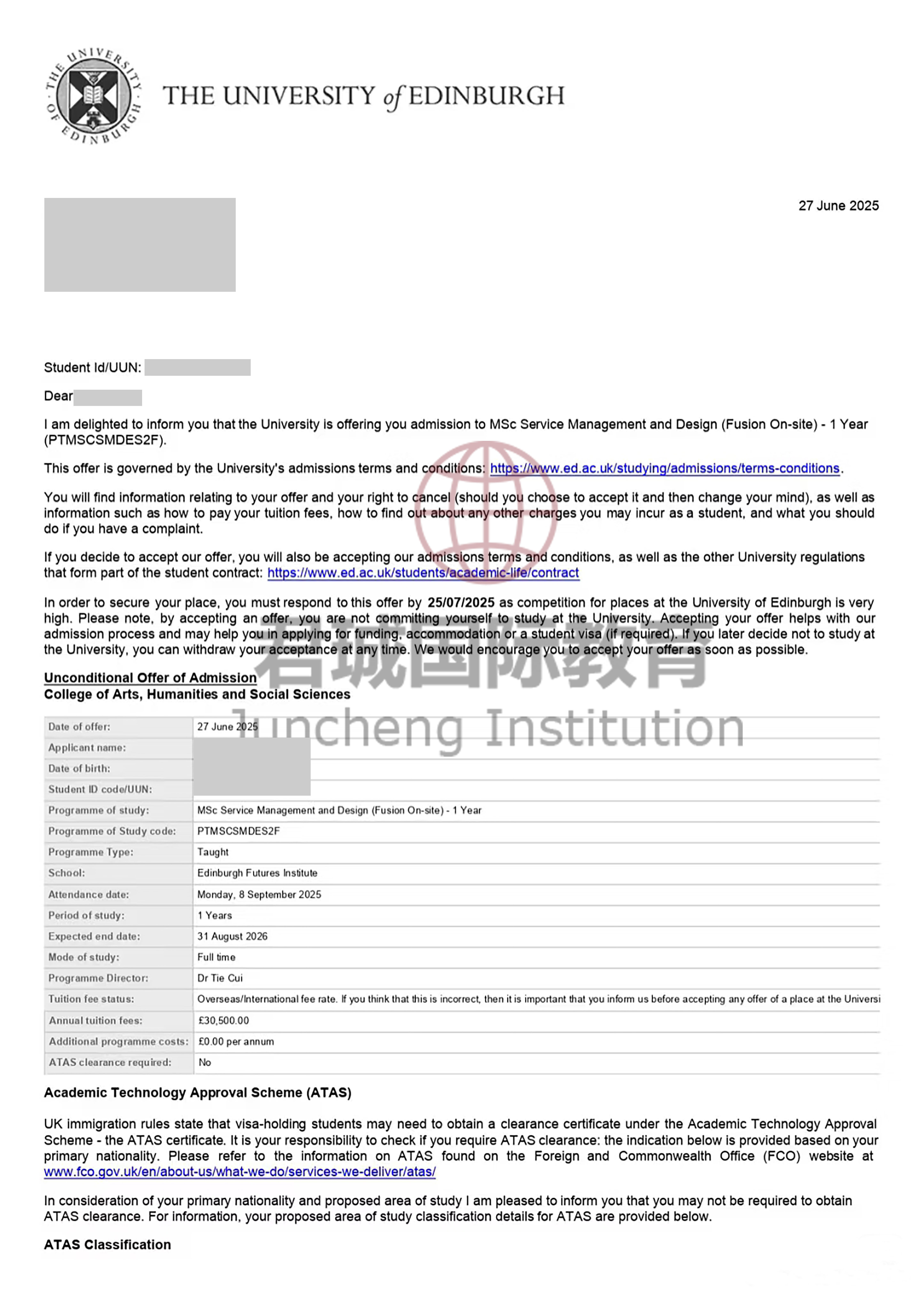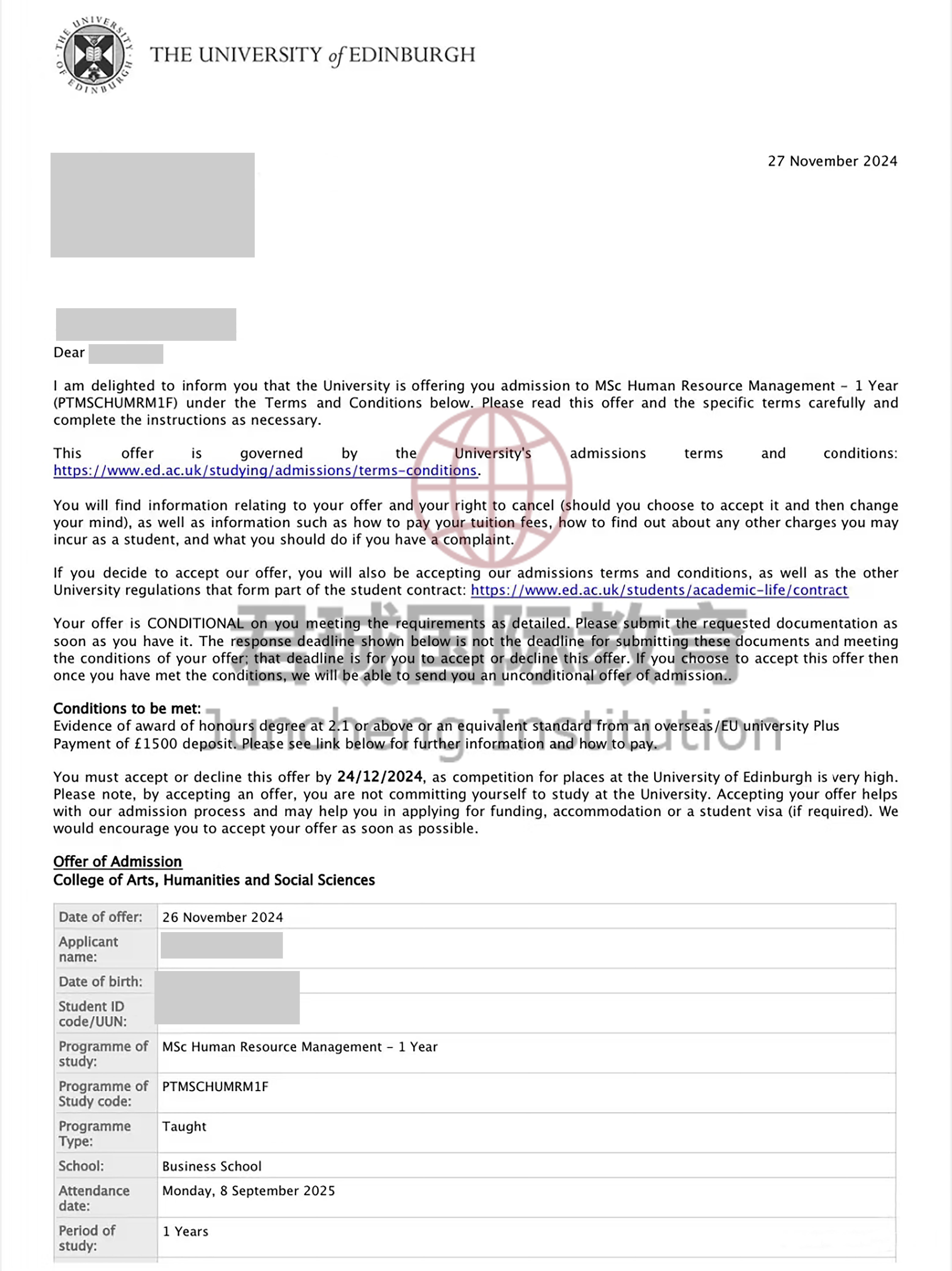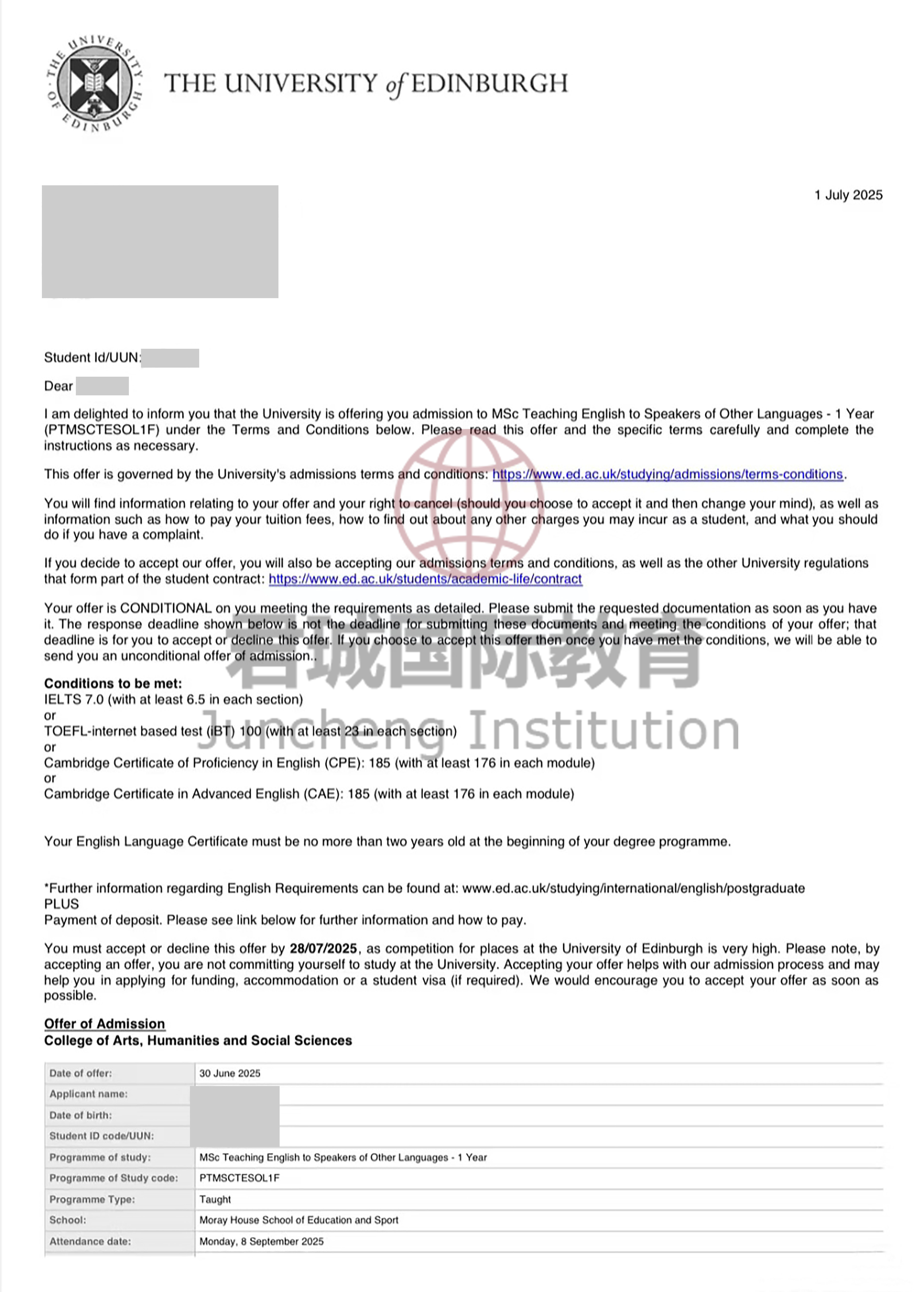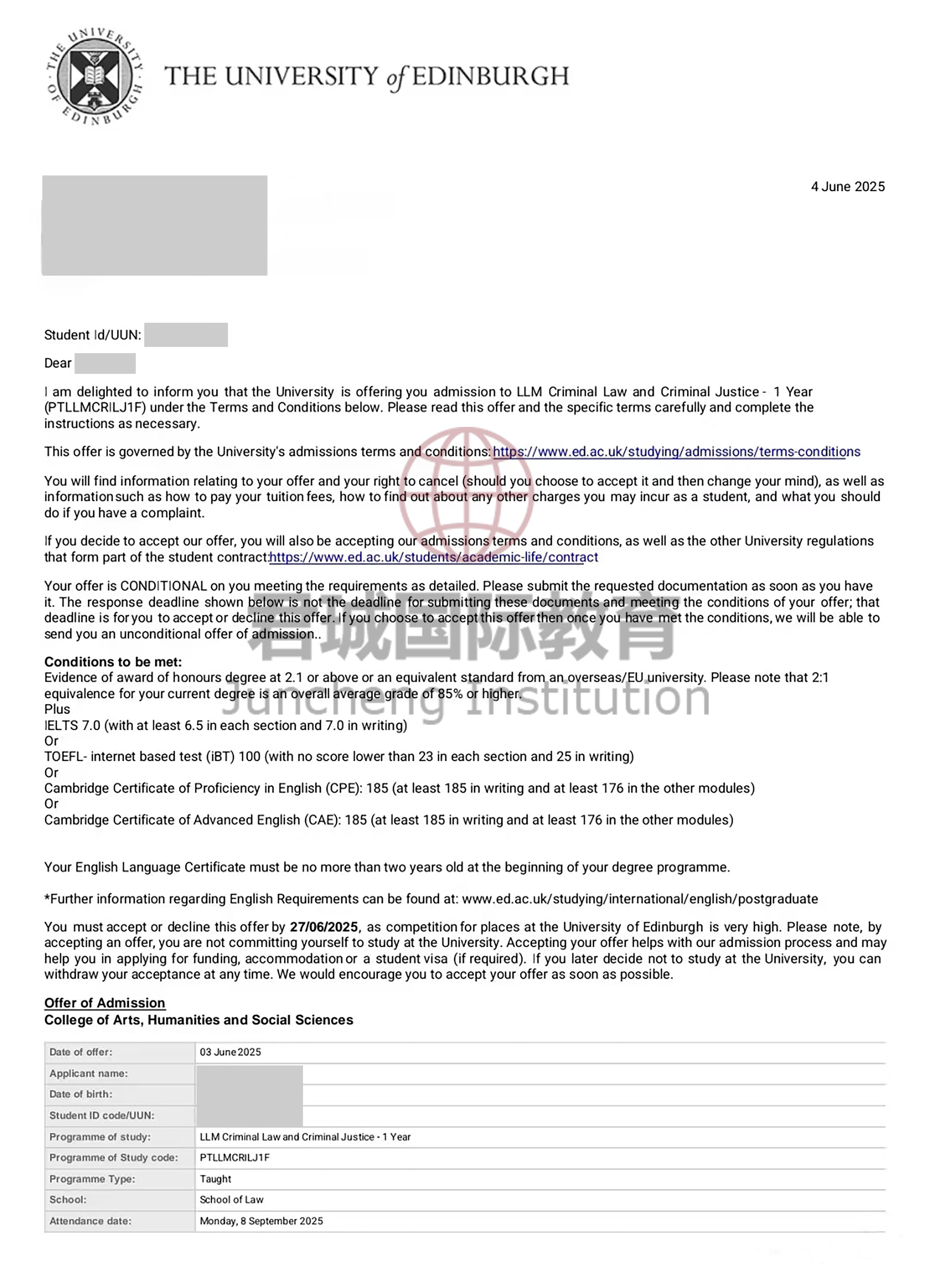 录取Offer:爱丁堡大学 University of Edinburgh