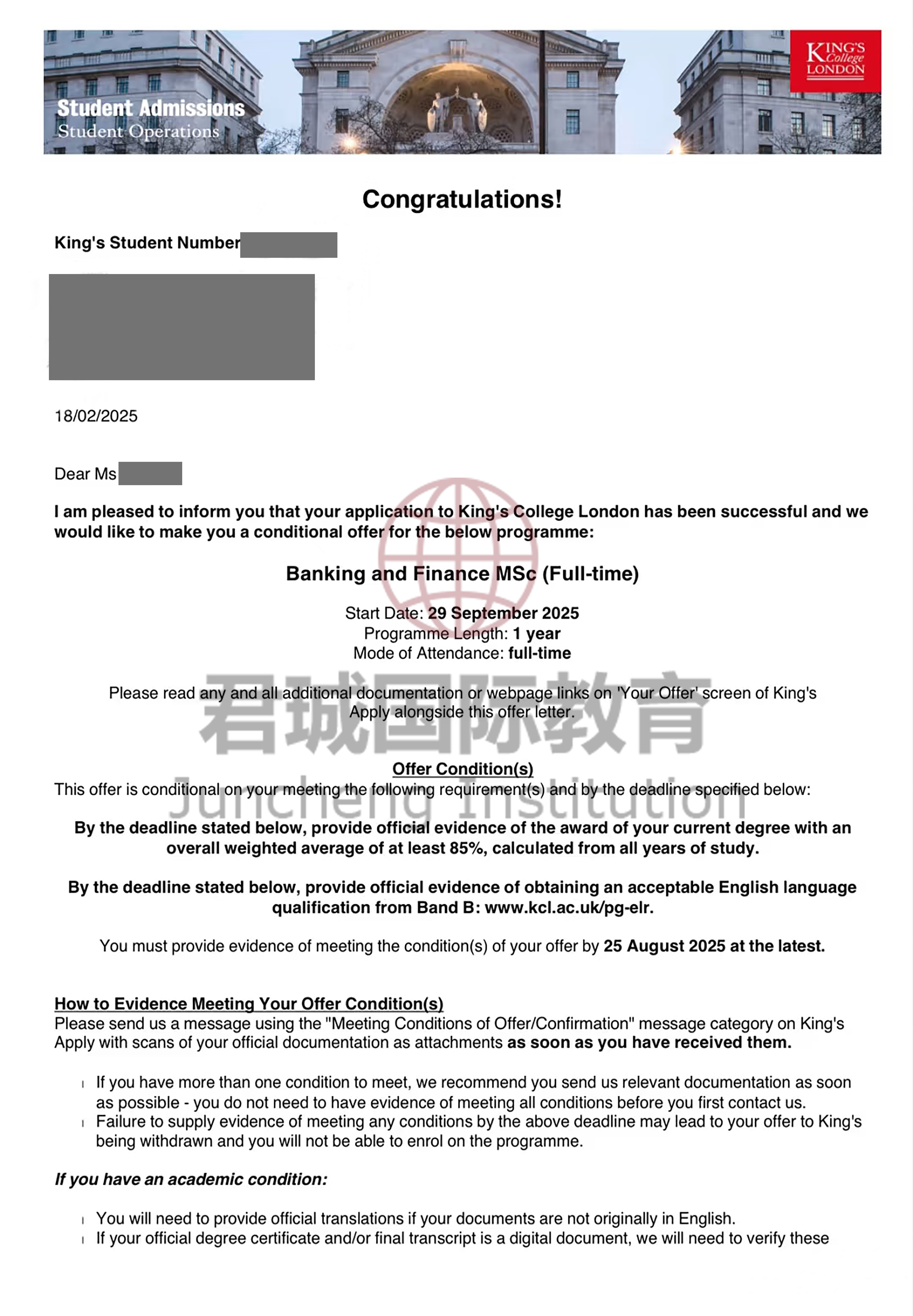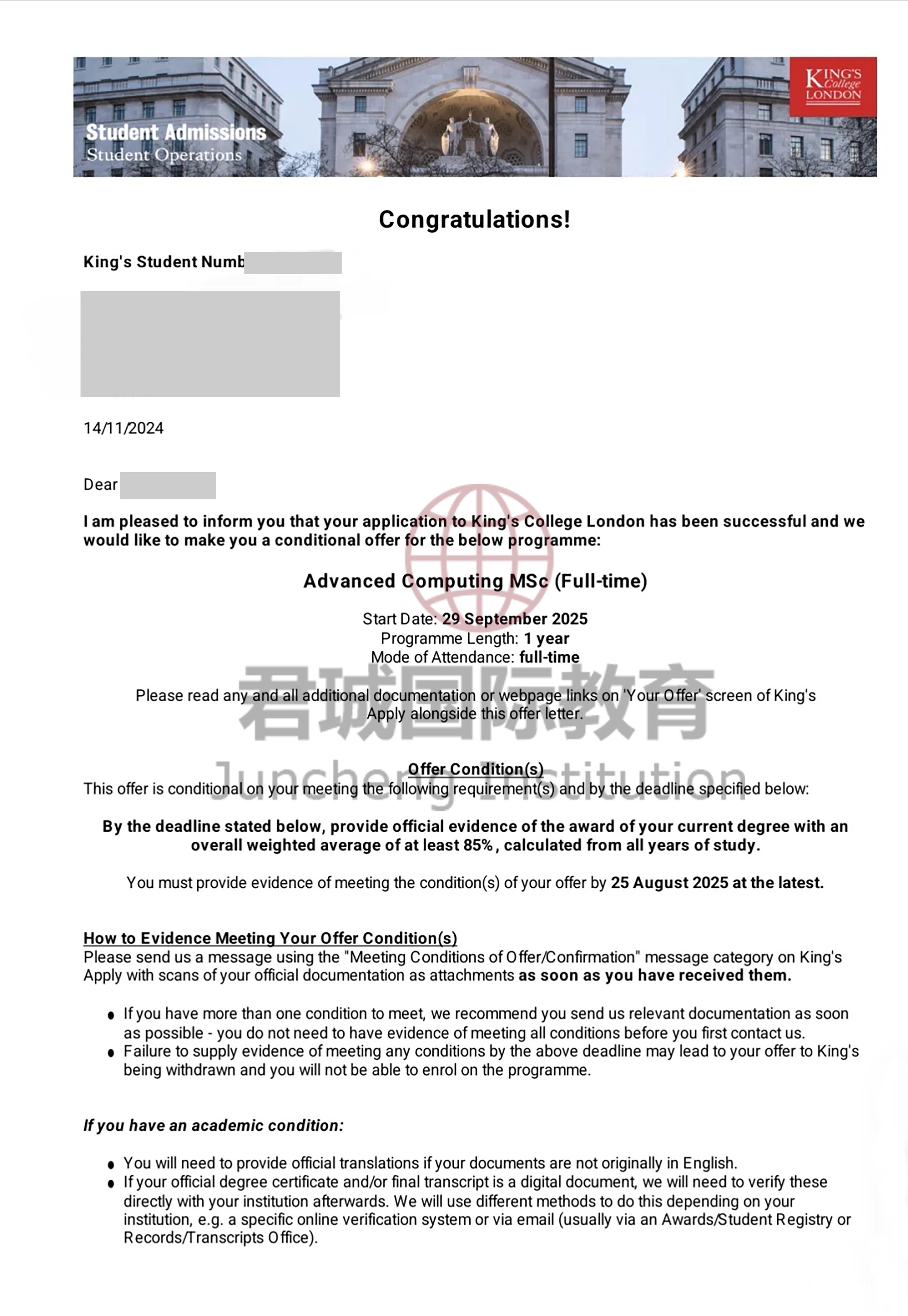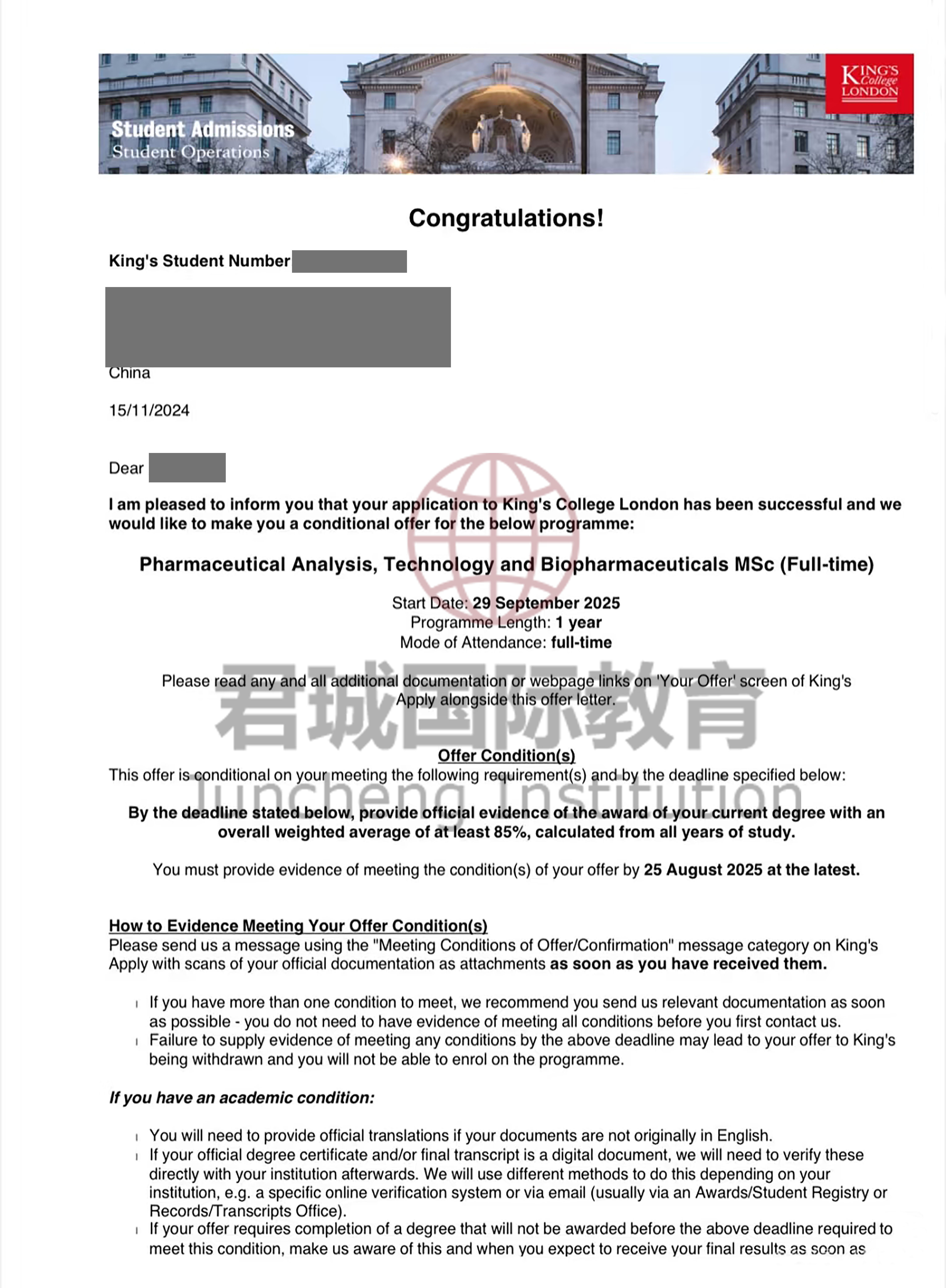 录取Offer:伦敦国王学院 King's College London
