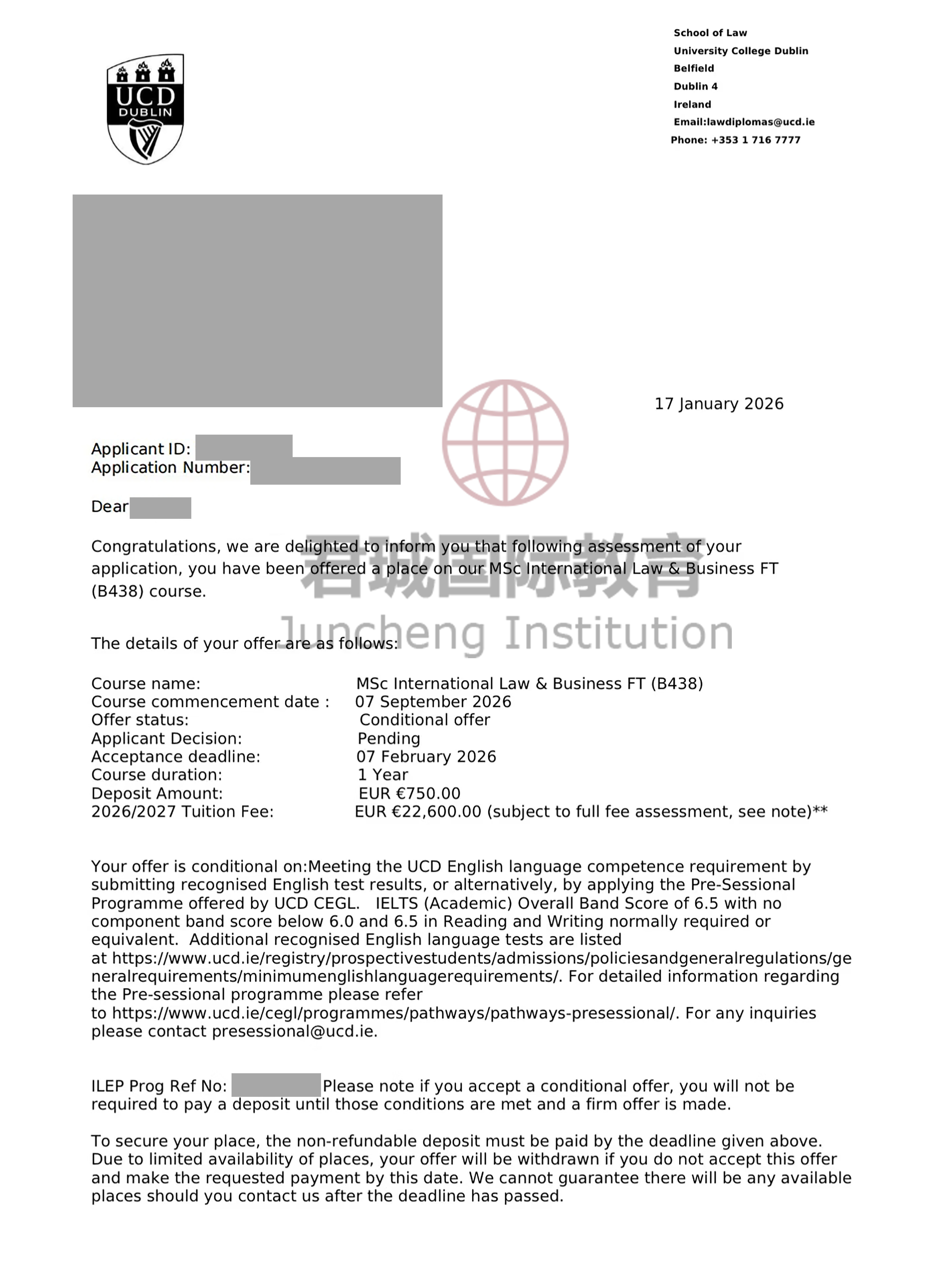 录取Offer:都柏林大学学院 University College Dublin