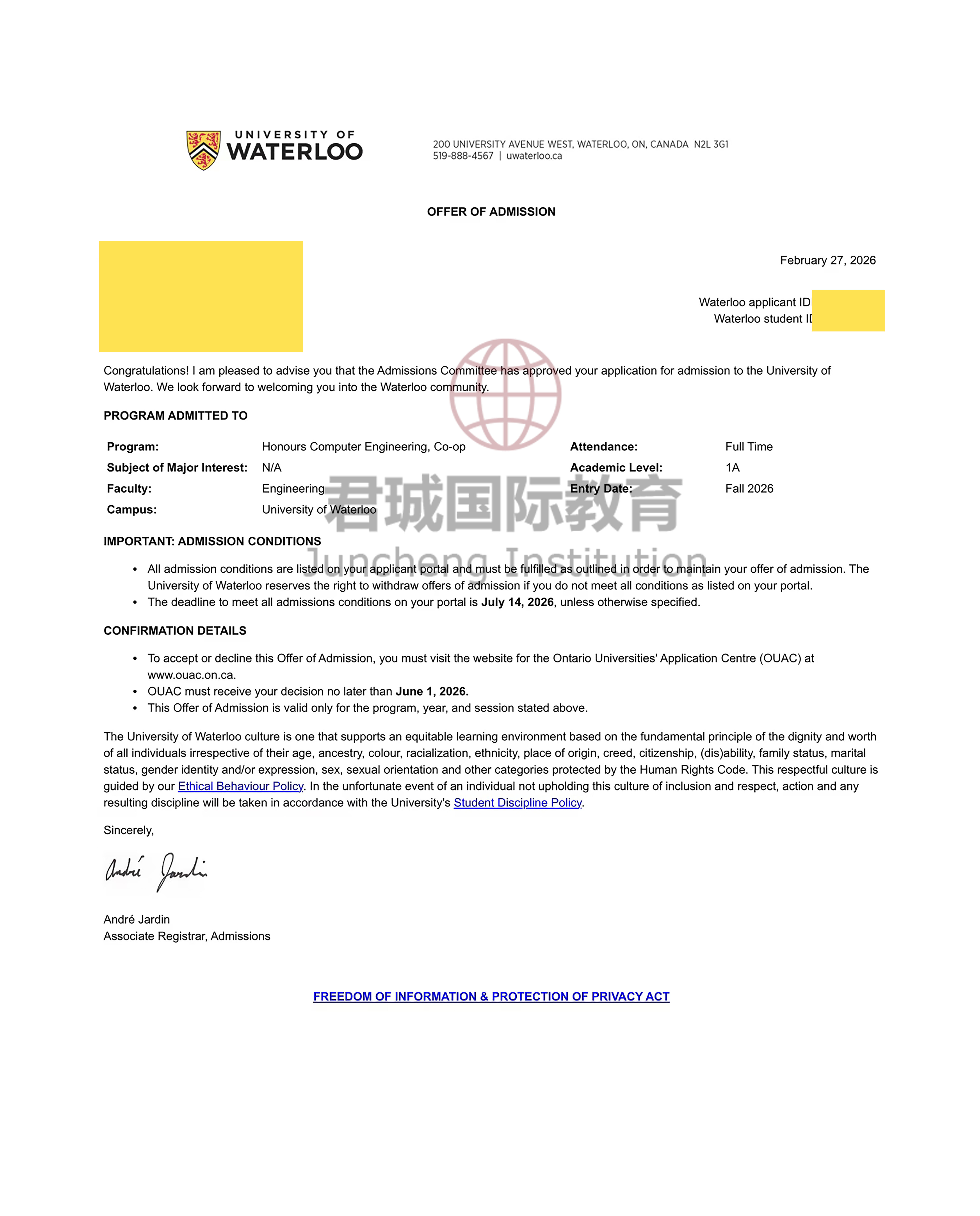 录取Offer:滑铁卢大学 University of Waterloo
