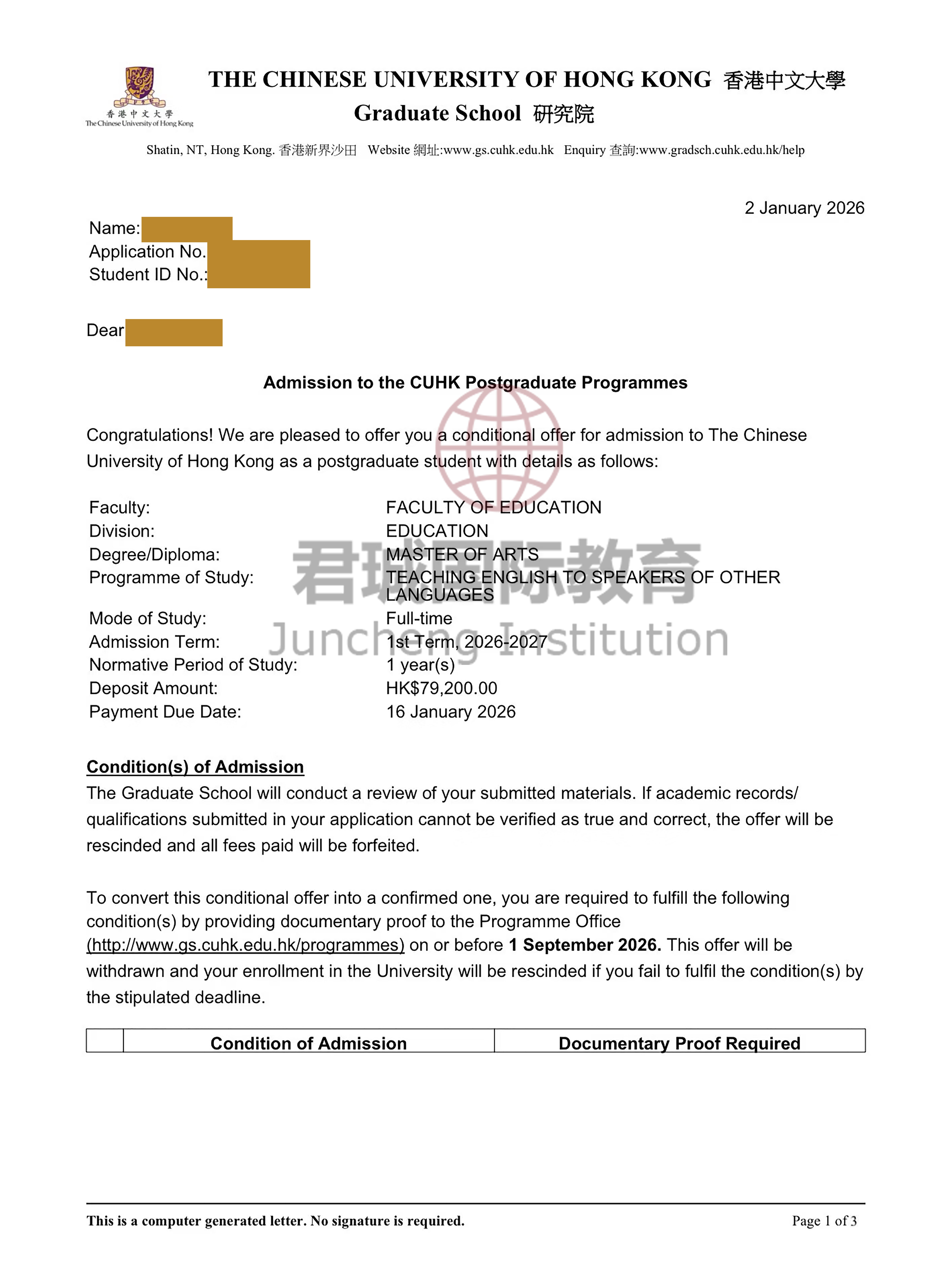 录取Offer:香港中文大学 The Chinese University of Hong Kong