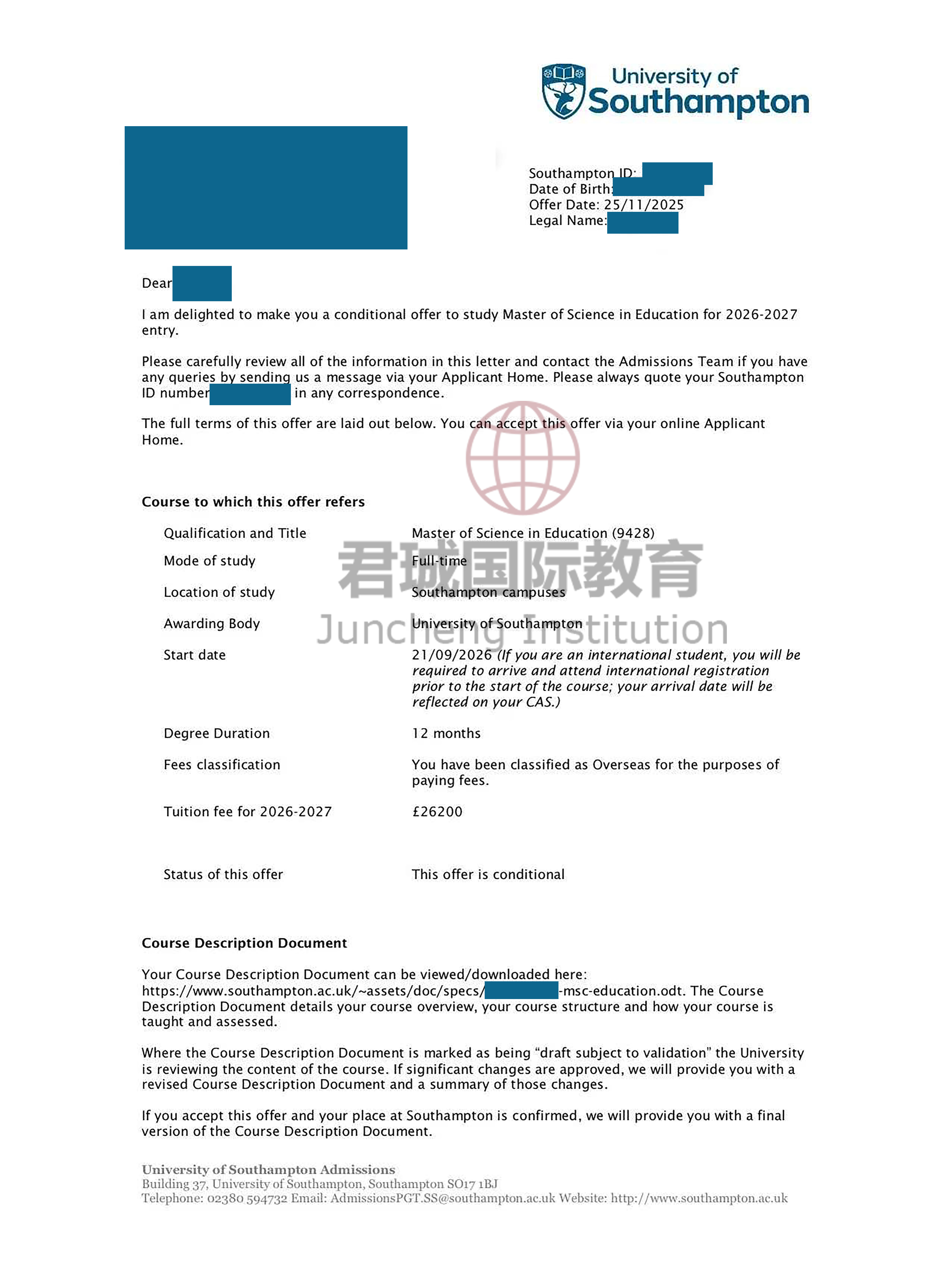 录取Offer:南安普顿大学 University of Southampton