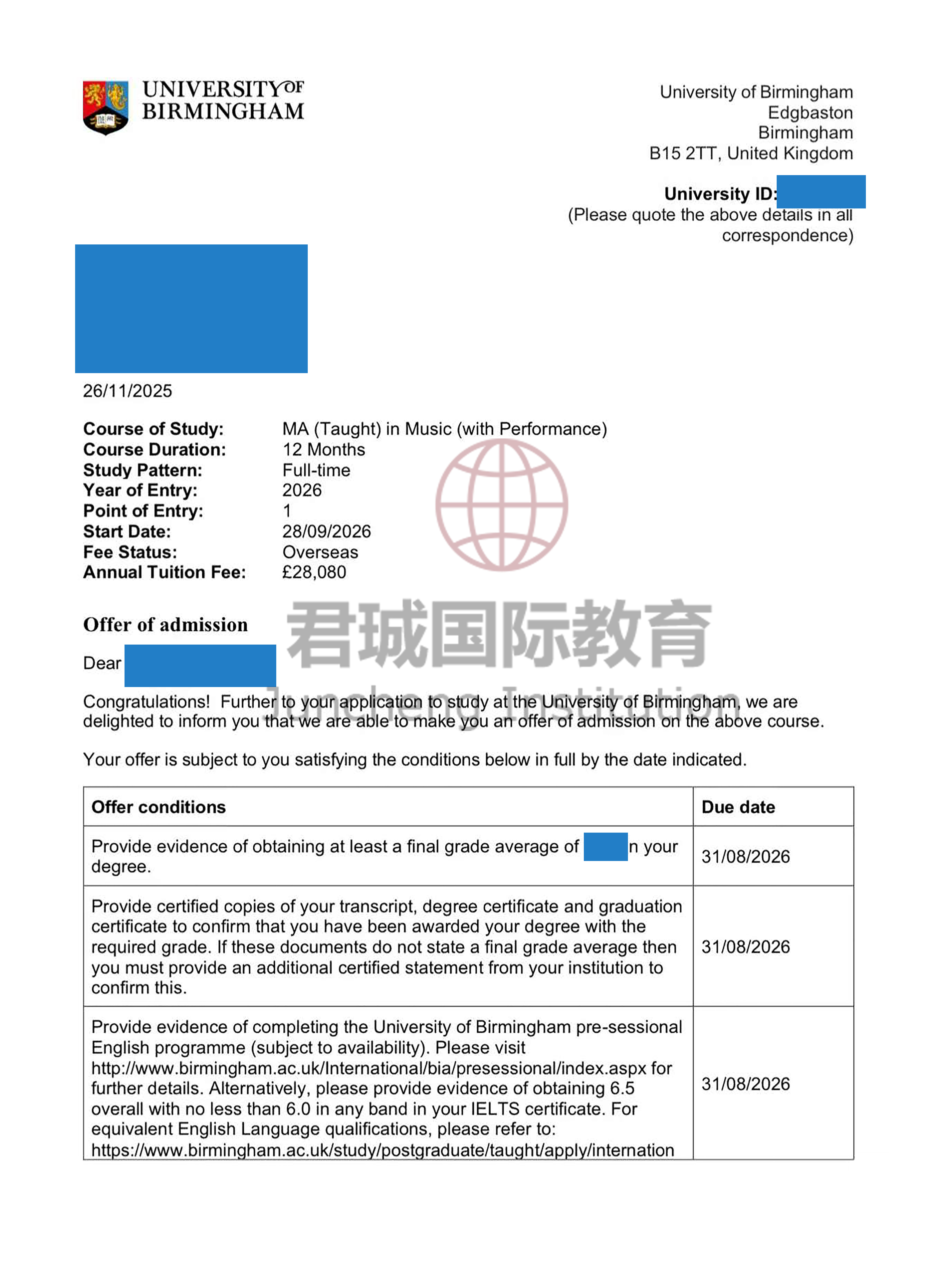 录取Offer:伯明翰大学 University of Birmingham
