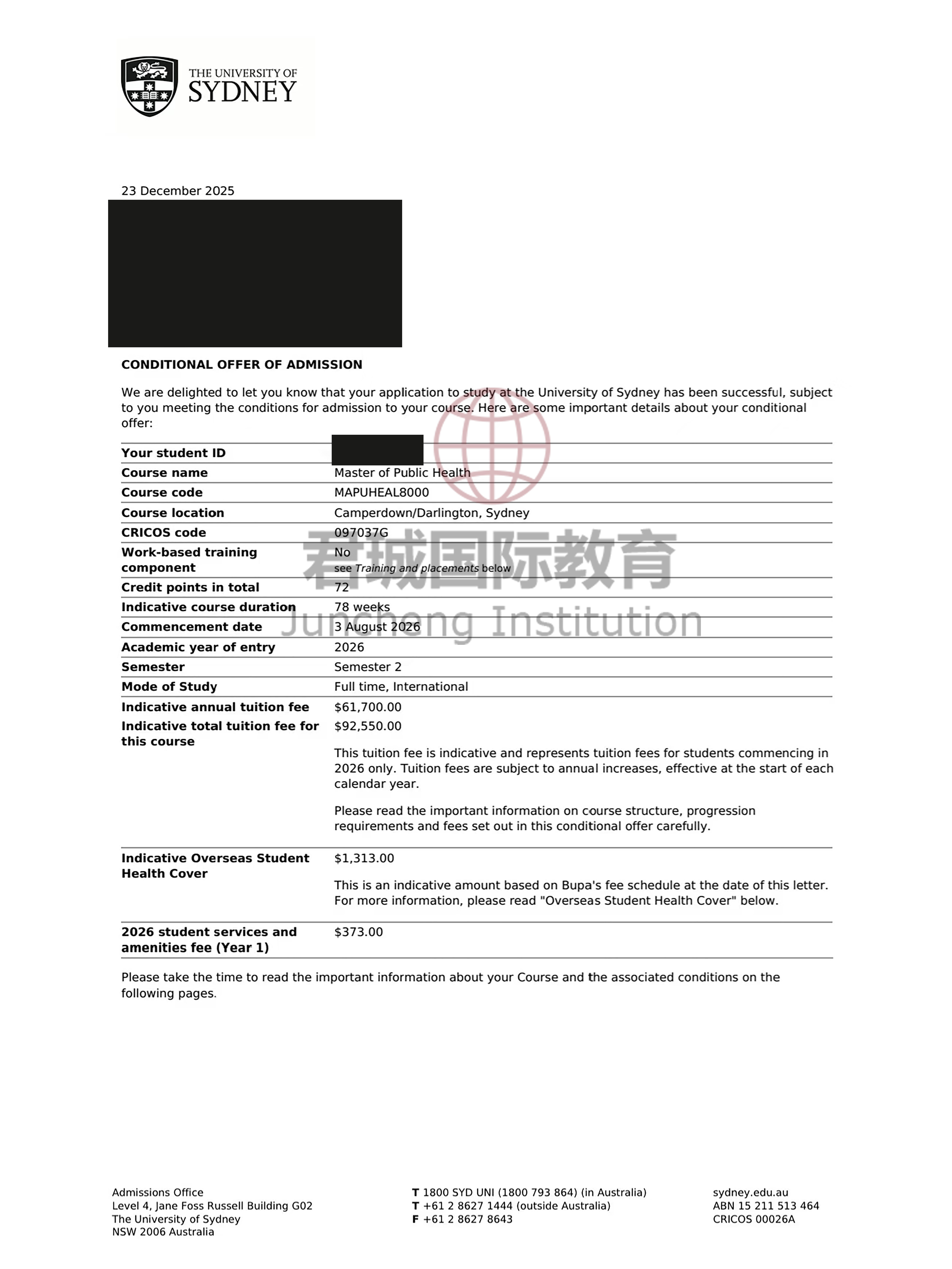 录取Offer:澳大利亚悉尼大学 University of Sydney