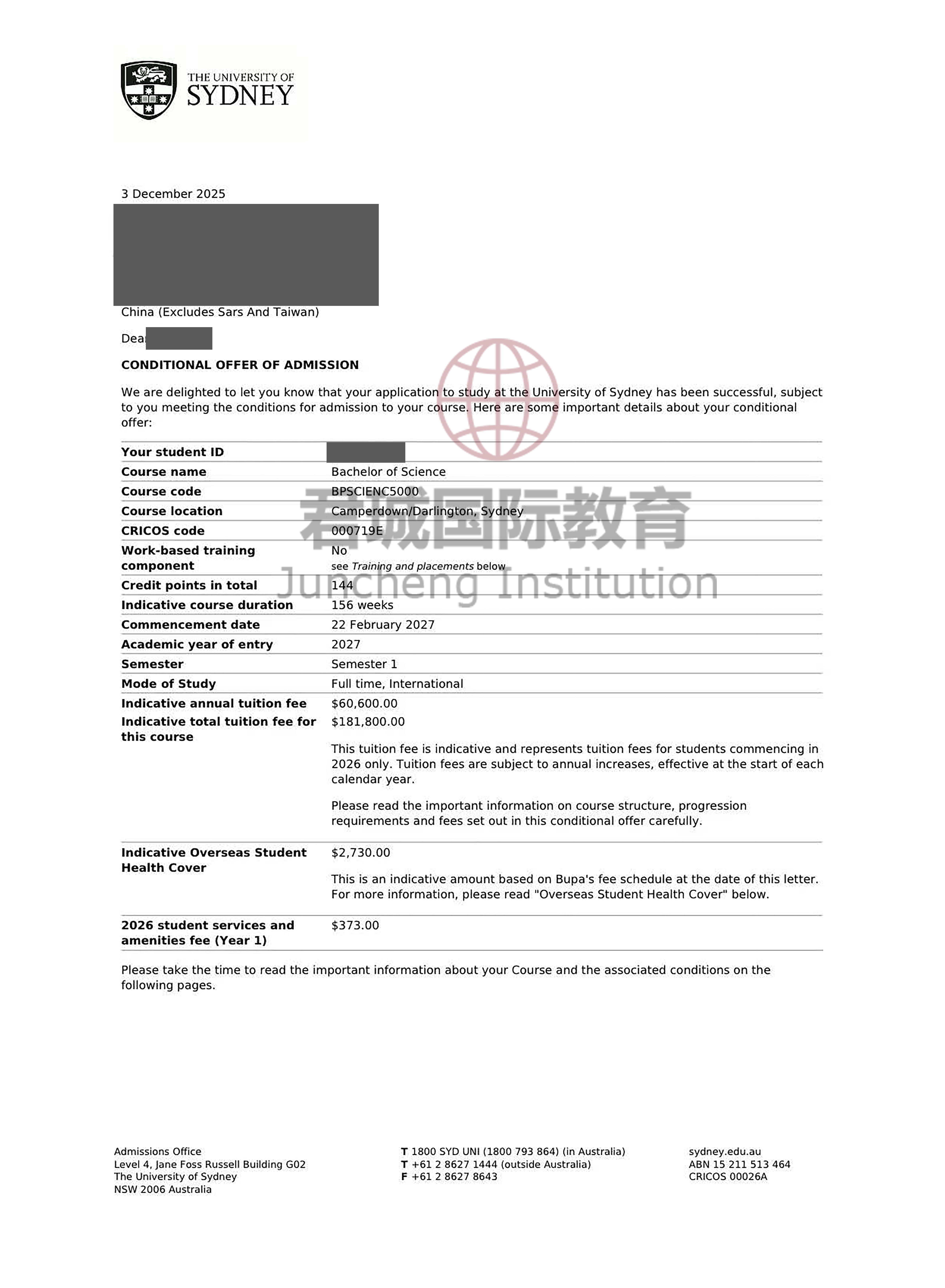 录取Offer:澳大利亚悉尼大学 University of Sydney