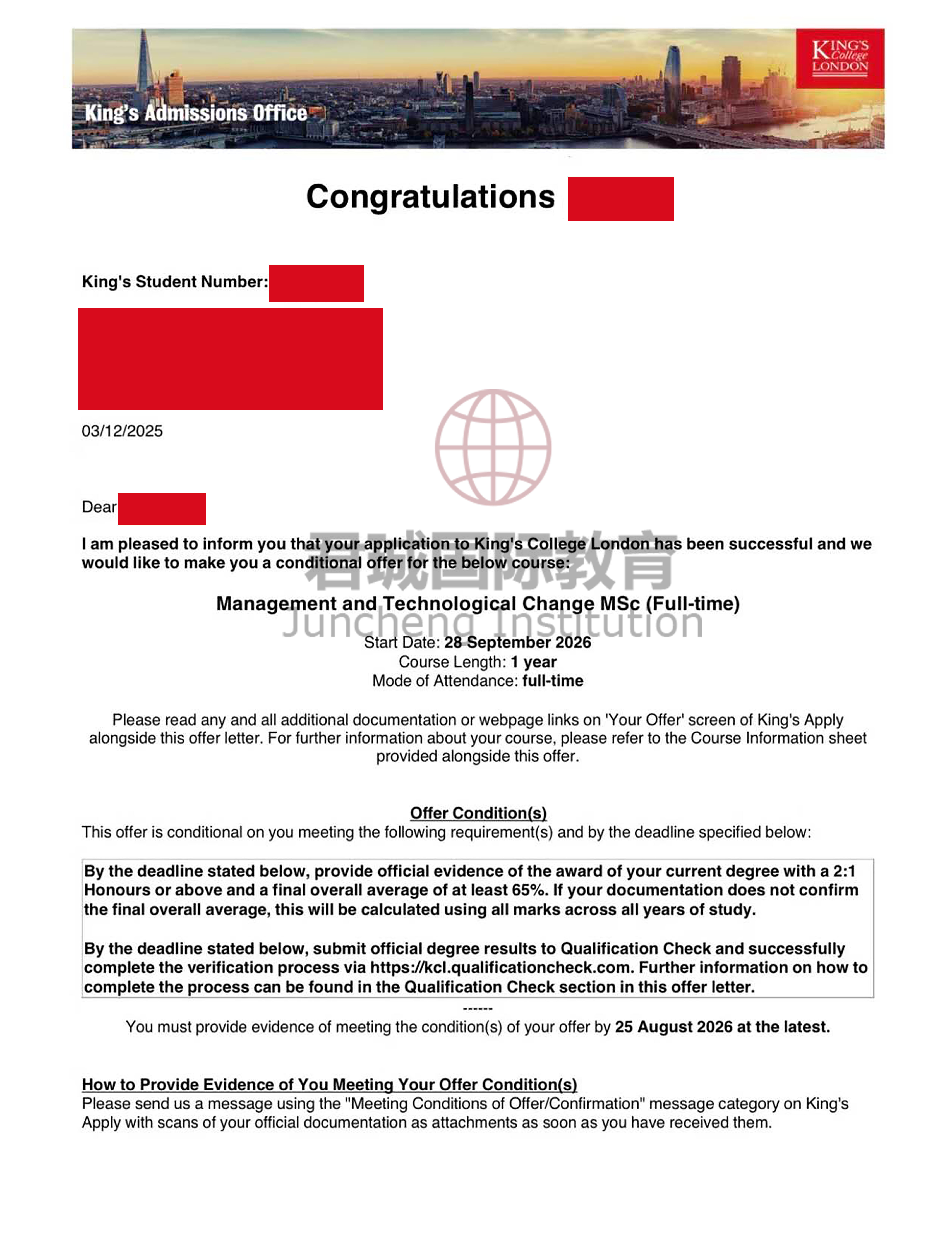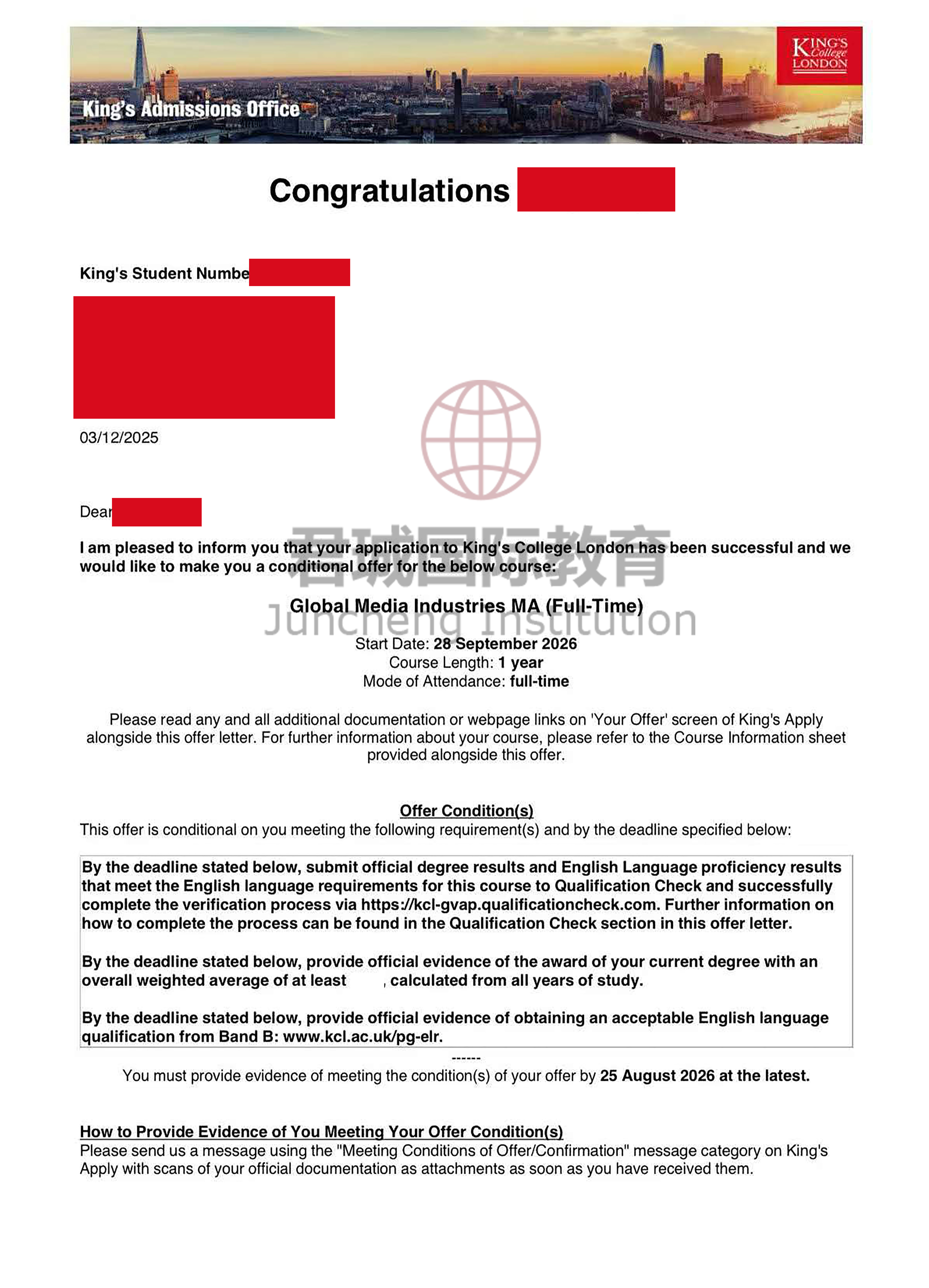 录取Offer:伦敦国王学院 King's College London