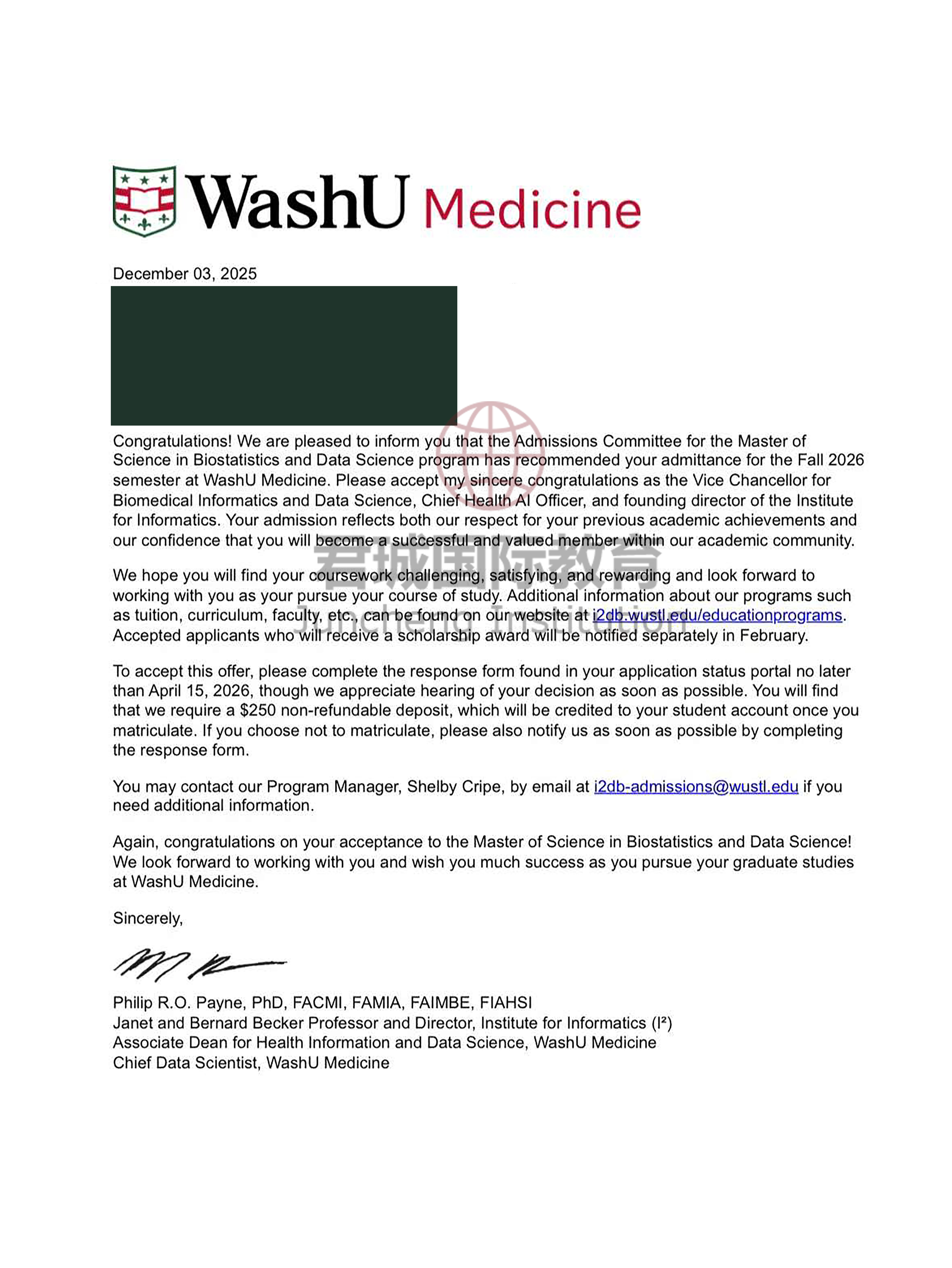 录取Offer:圣路易斯华盛顿大学 Washington University in St. Louis