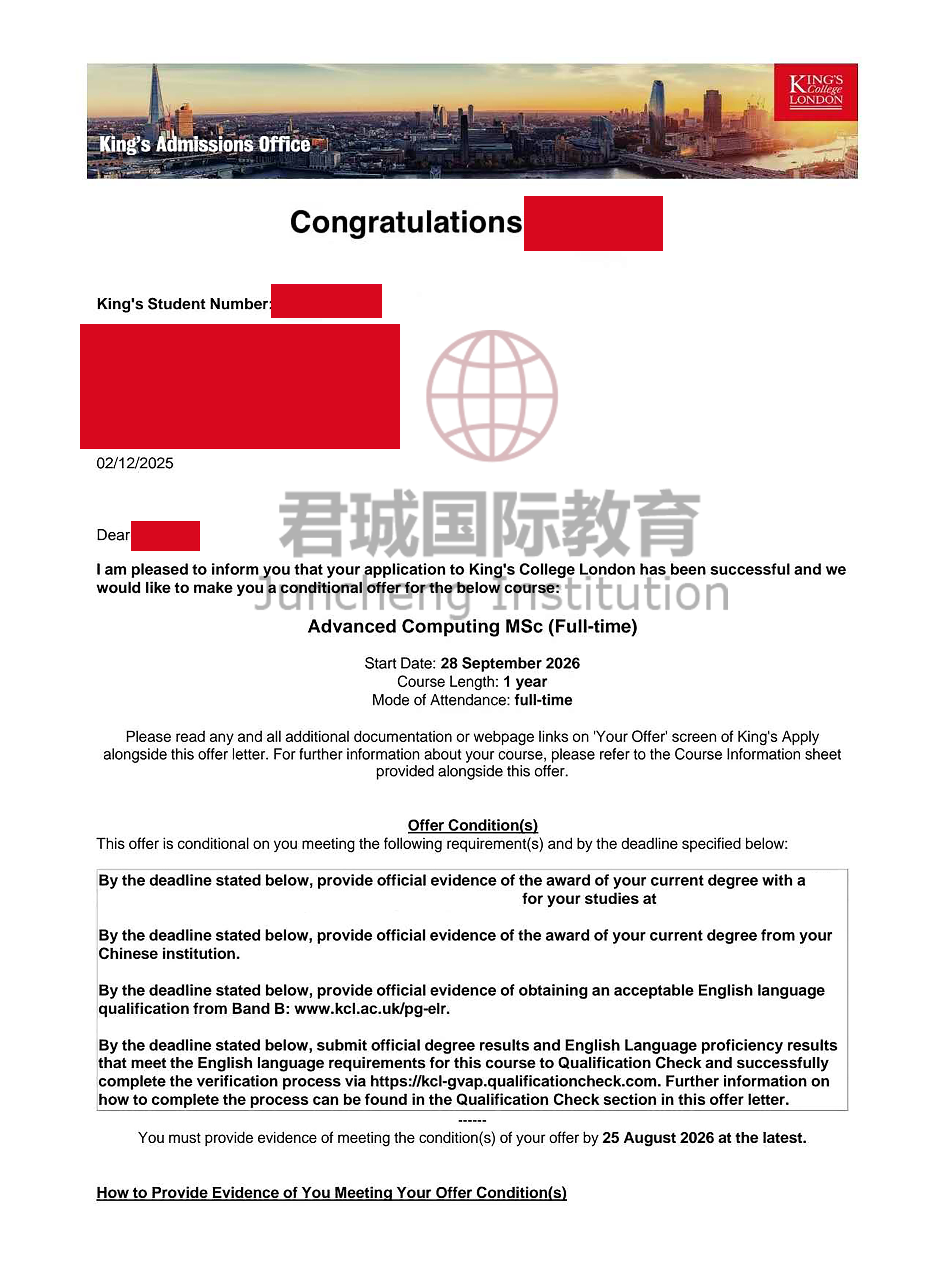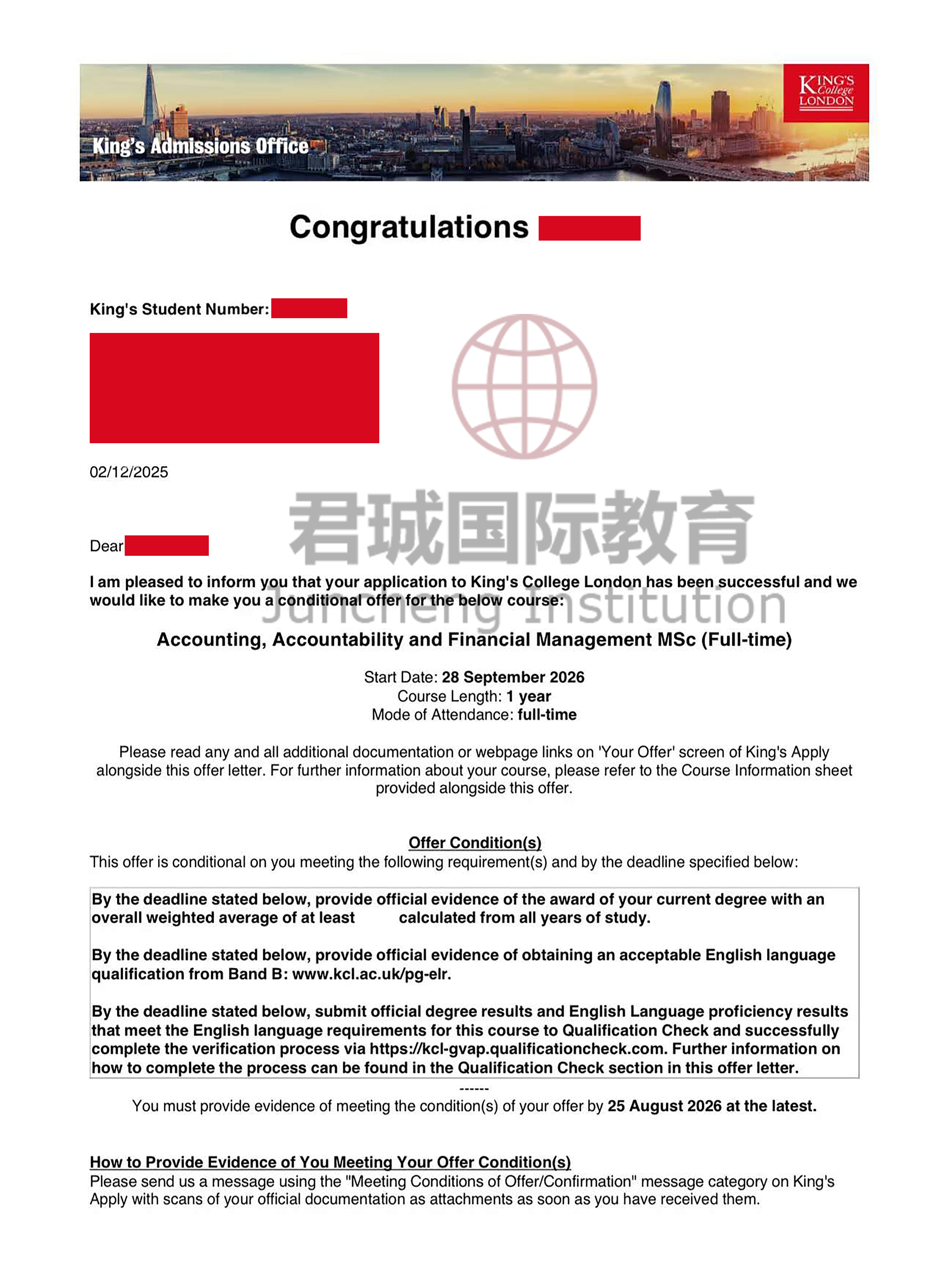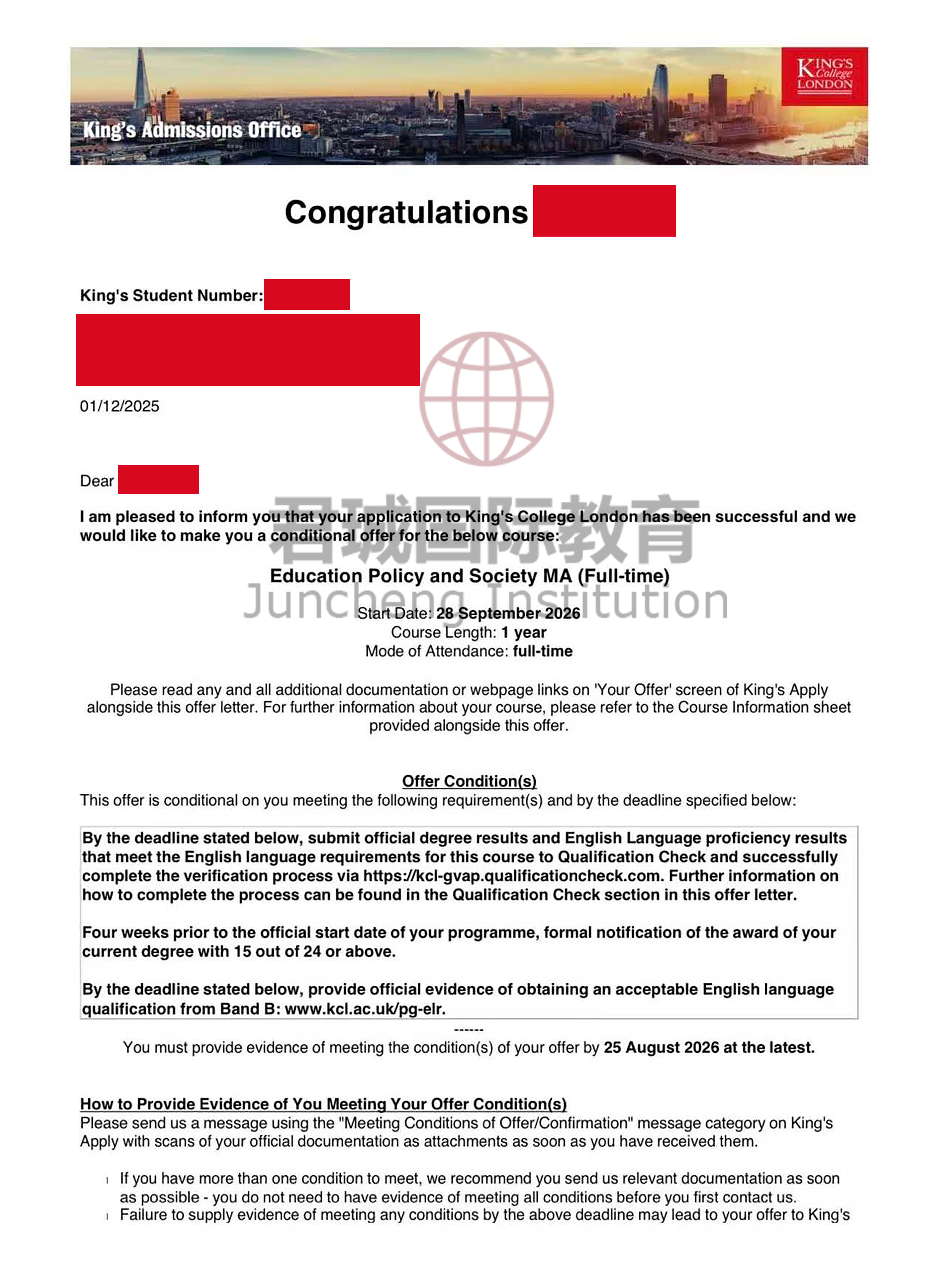 录取Offer:伦敦国王学院 King's College London