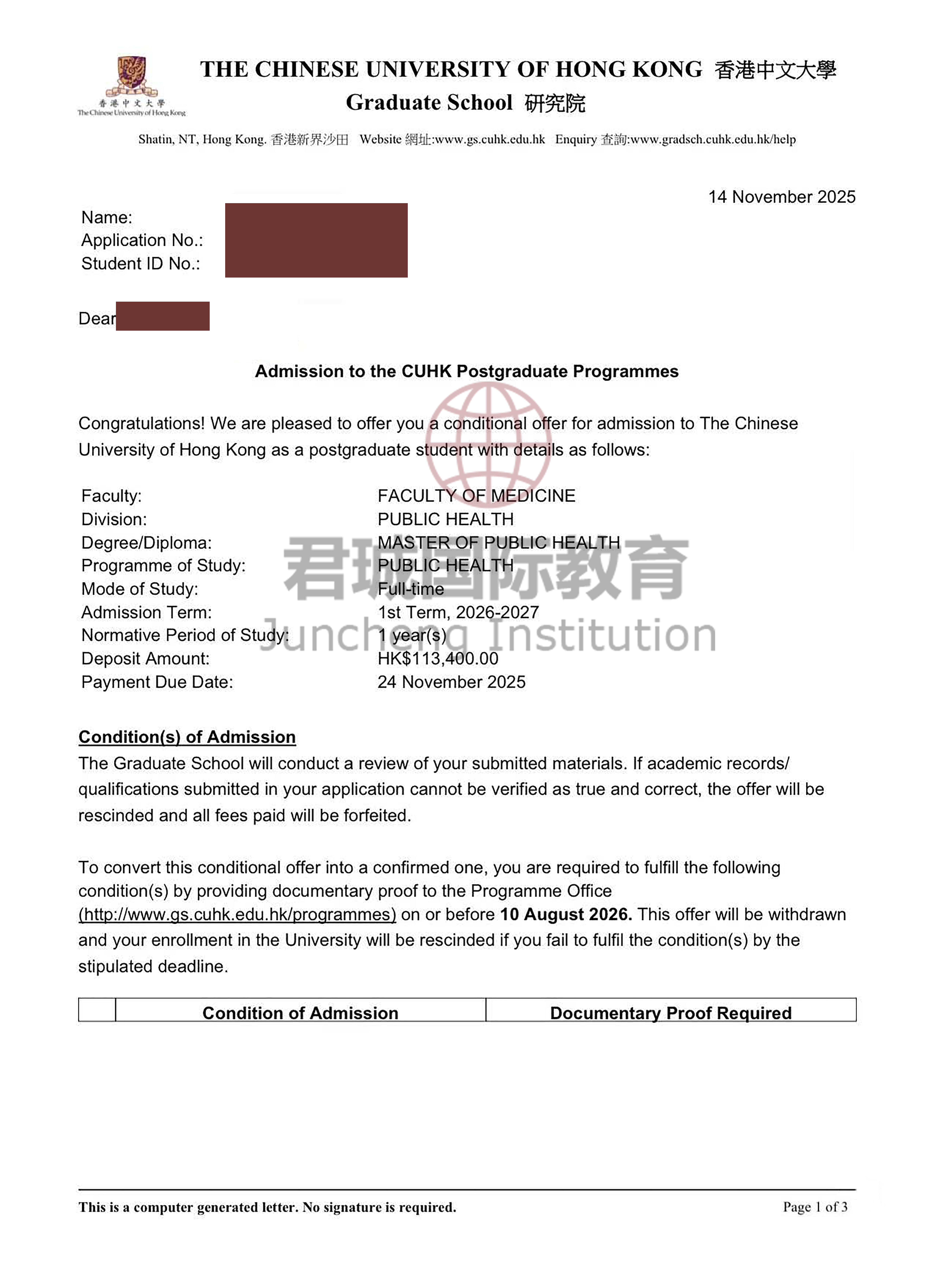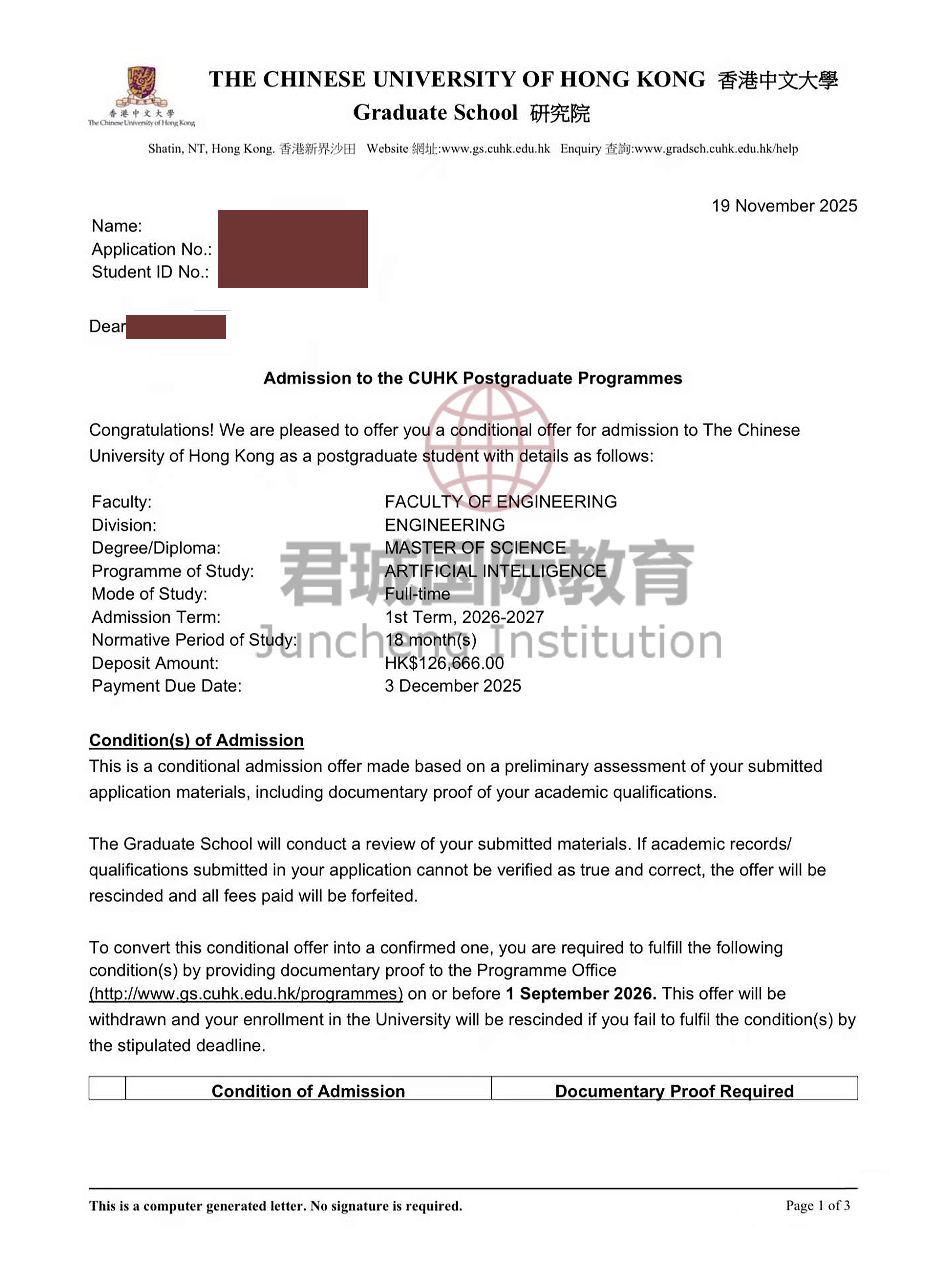 录取Offer:香港中文大学 The Chinese University of Hong Kong