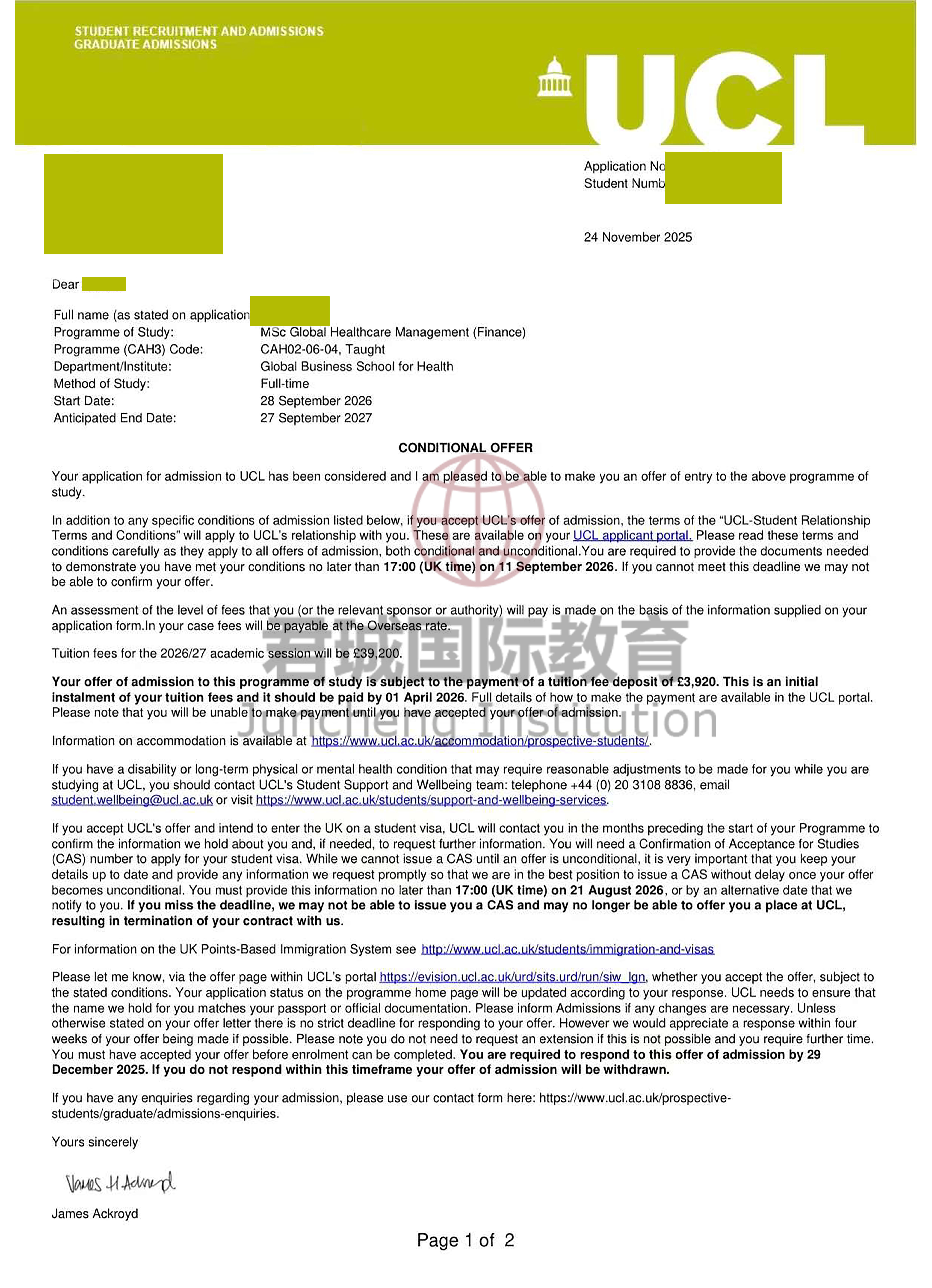 录取Offer:伦敦大学学院 University College London