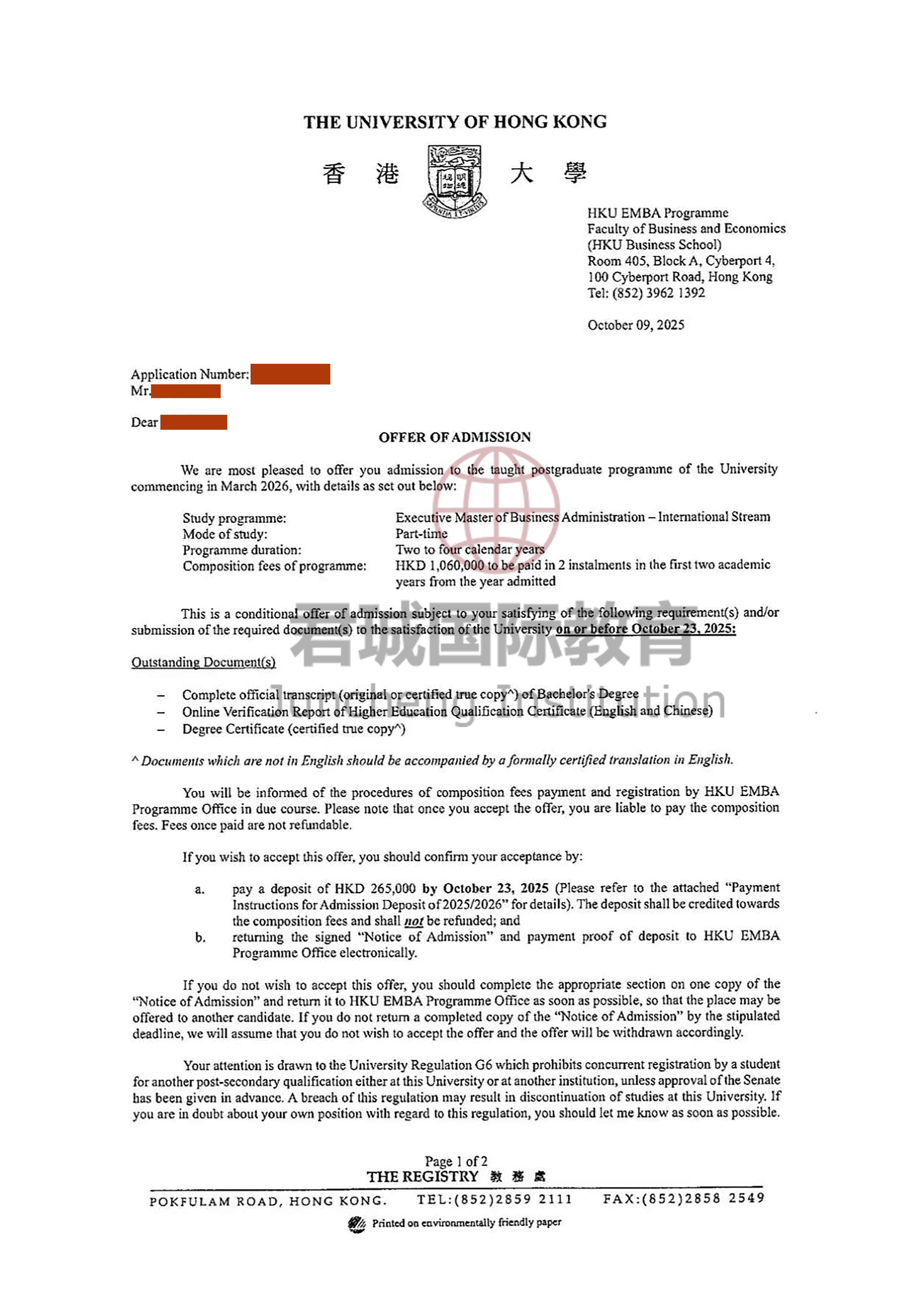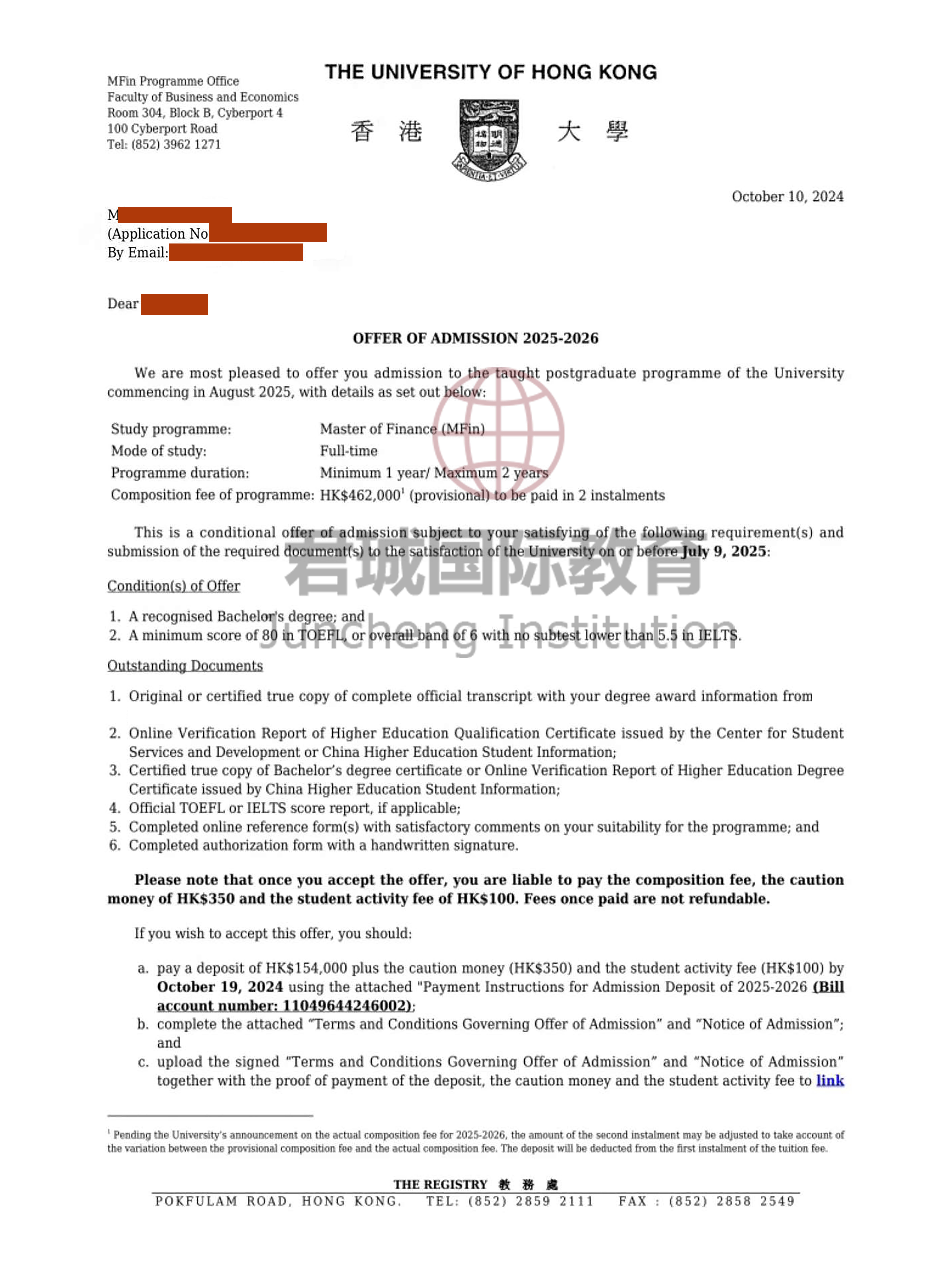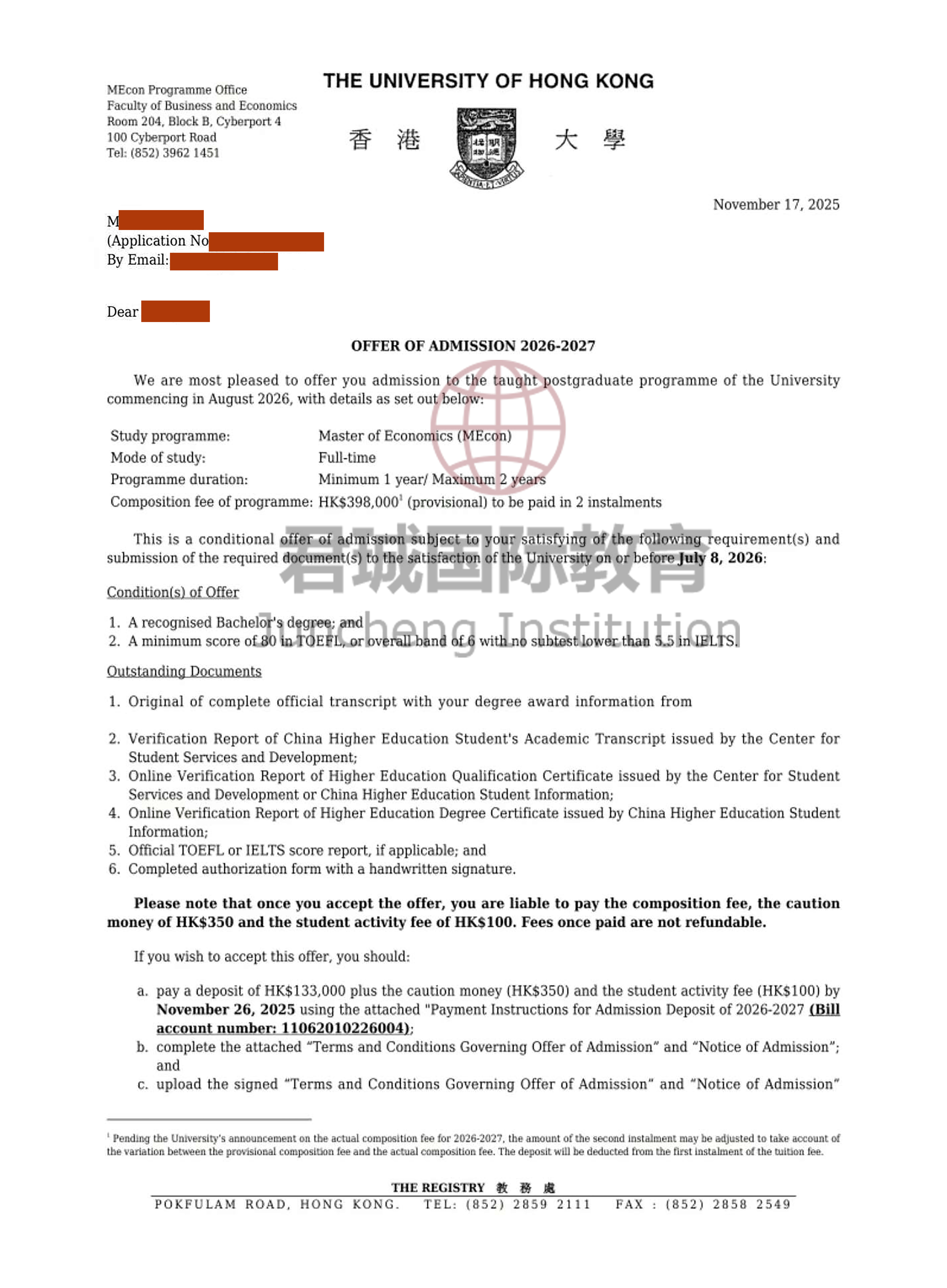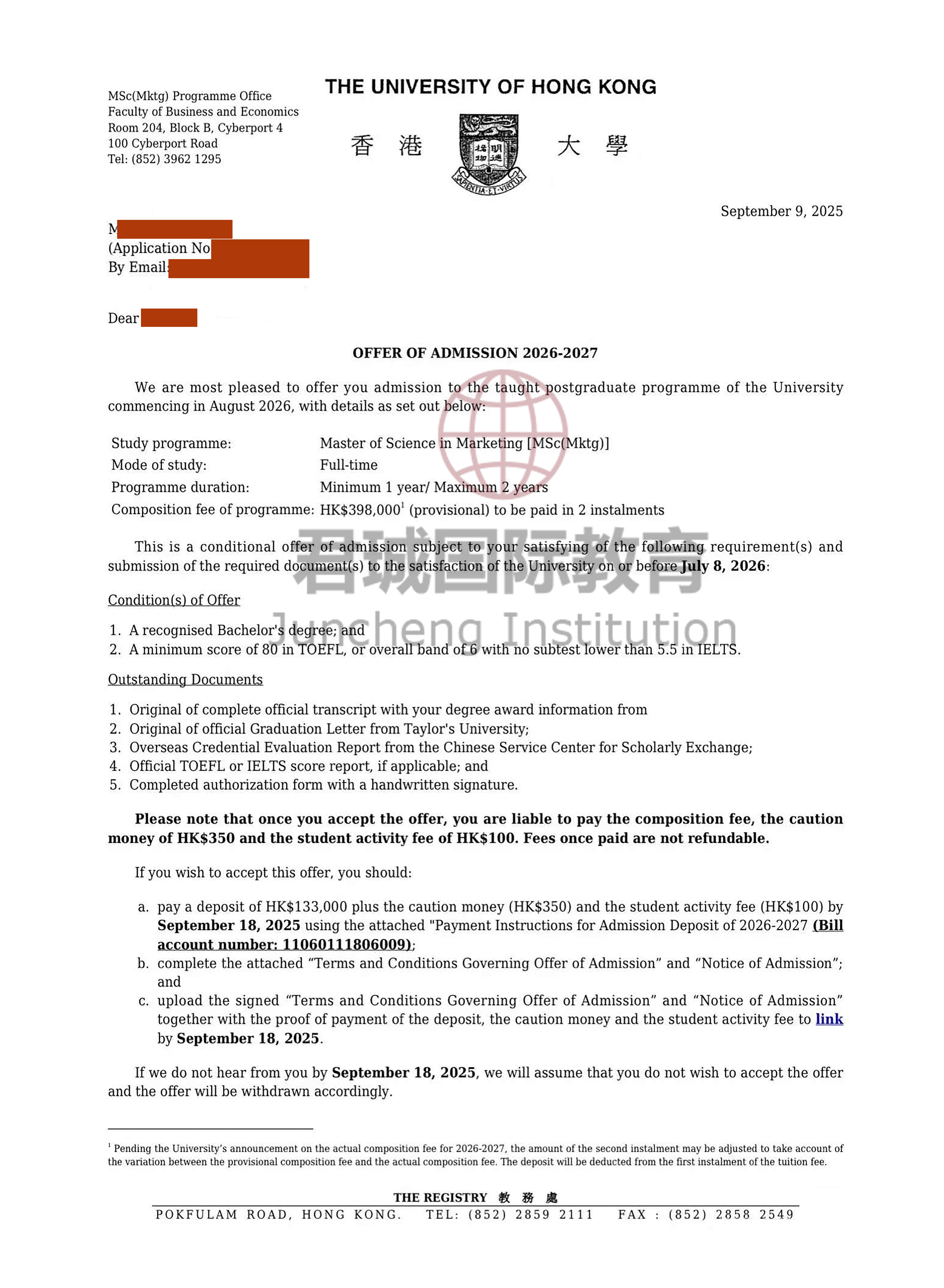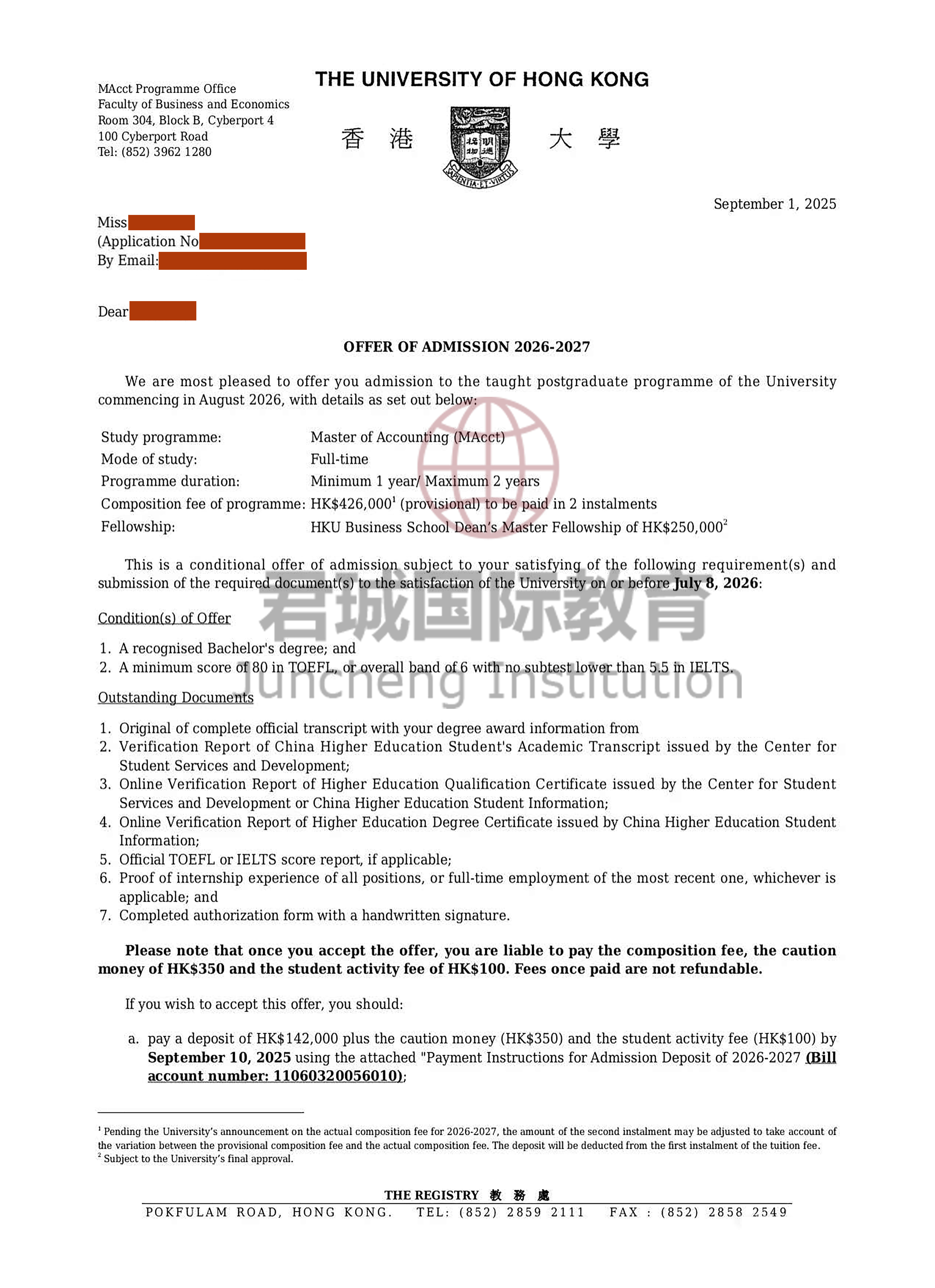 录取Offer:香港大学 University of Hong Kong