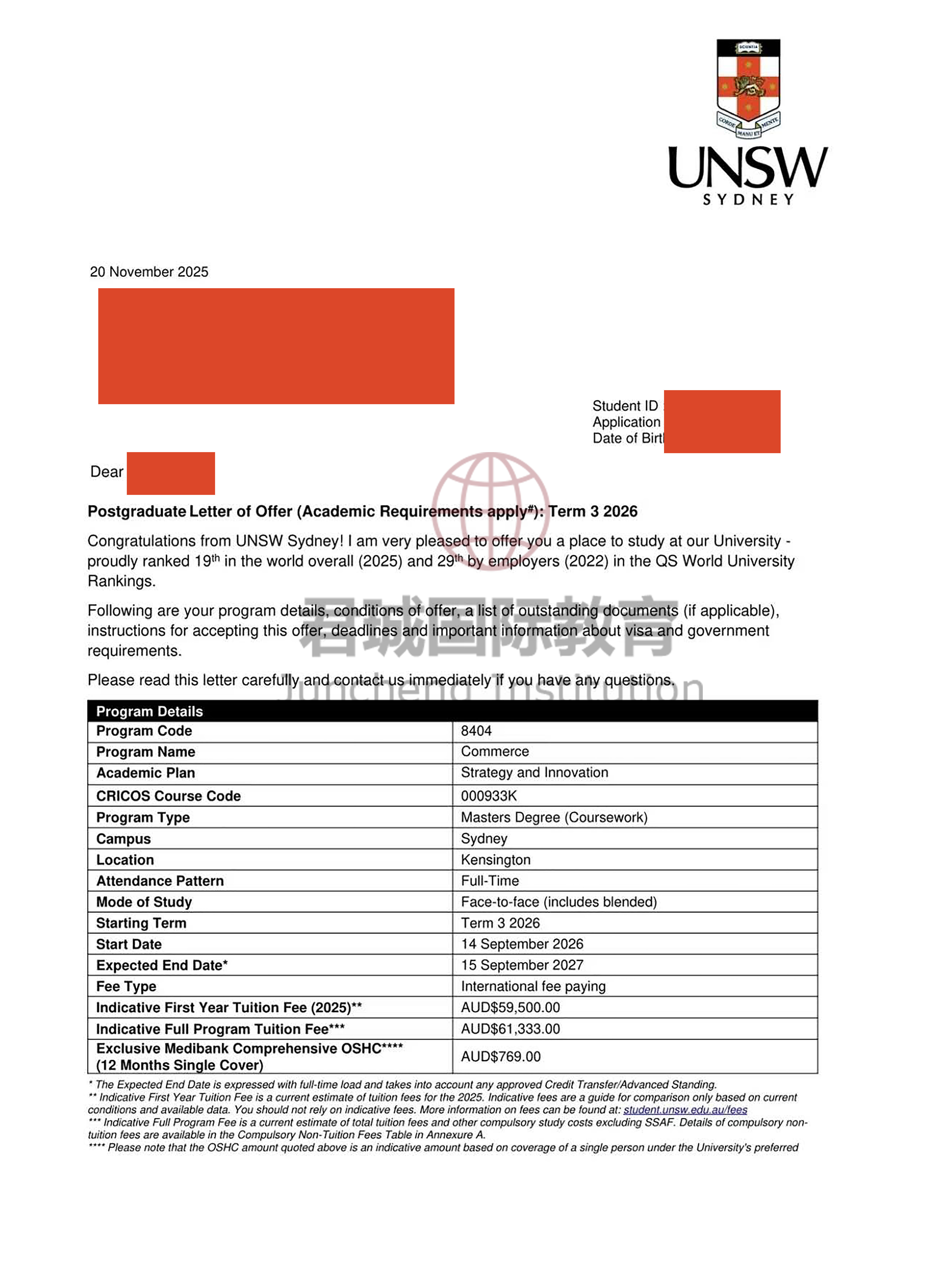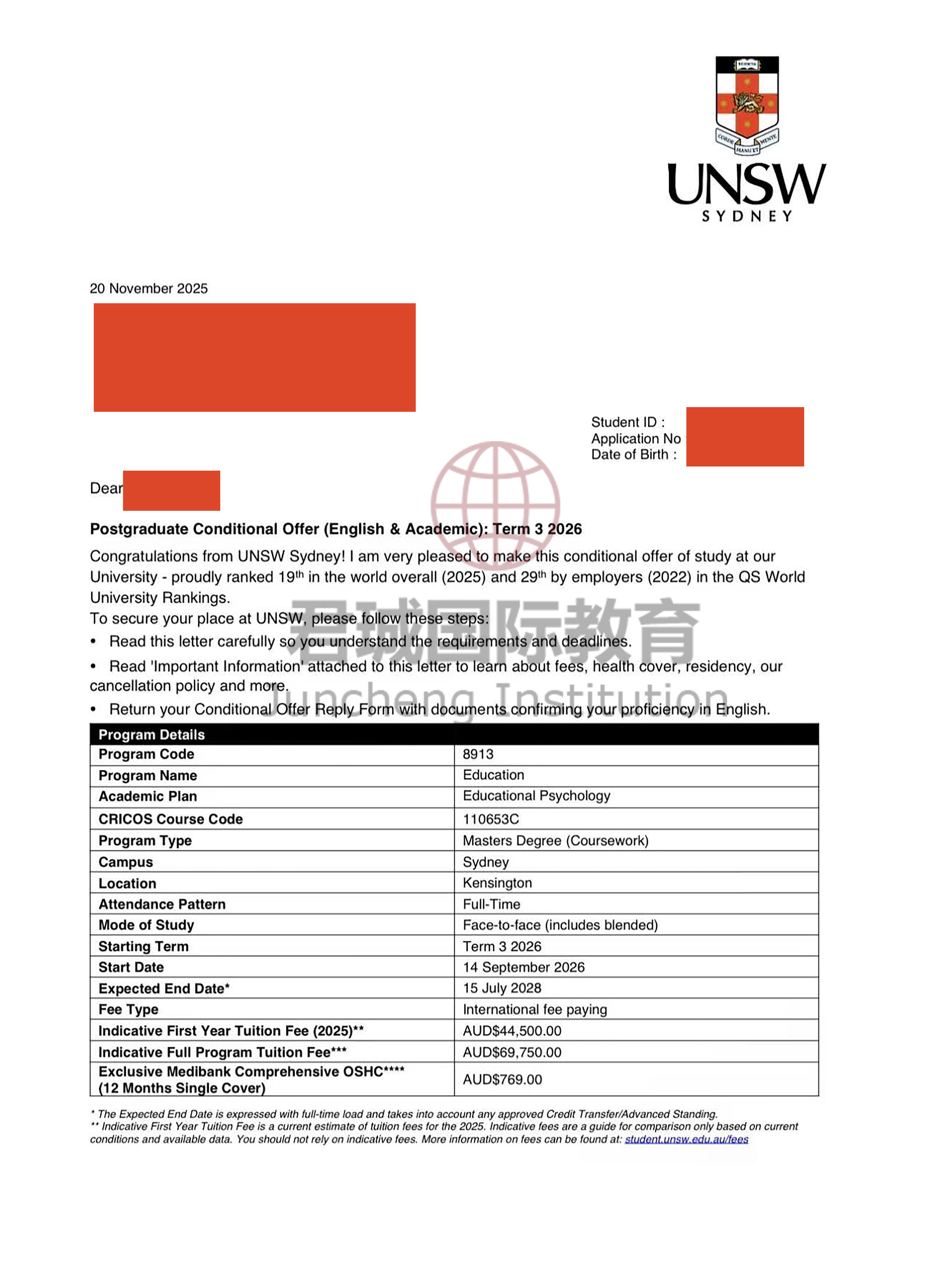 录取Offer:新南威尔士大学 University of New South Wales