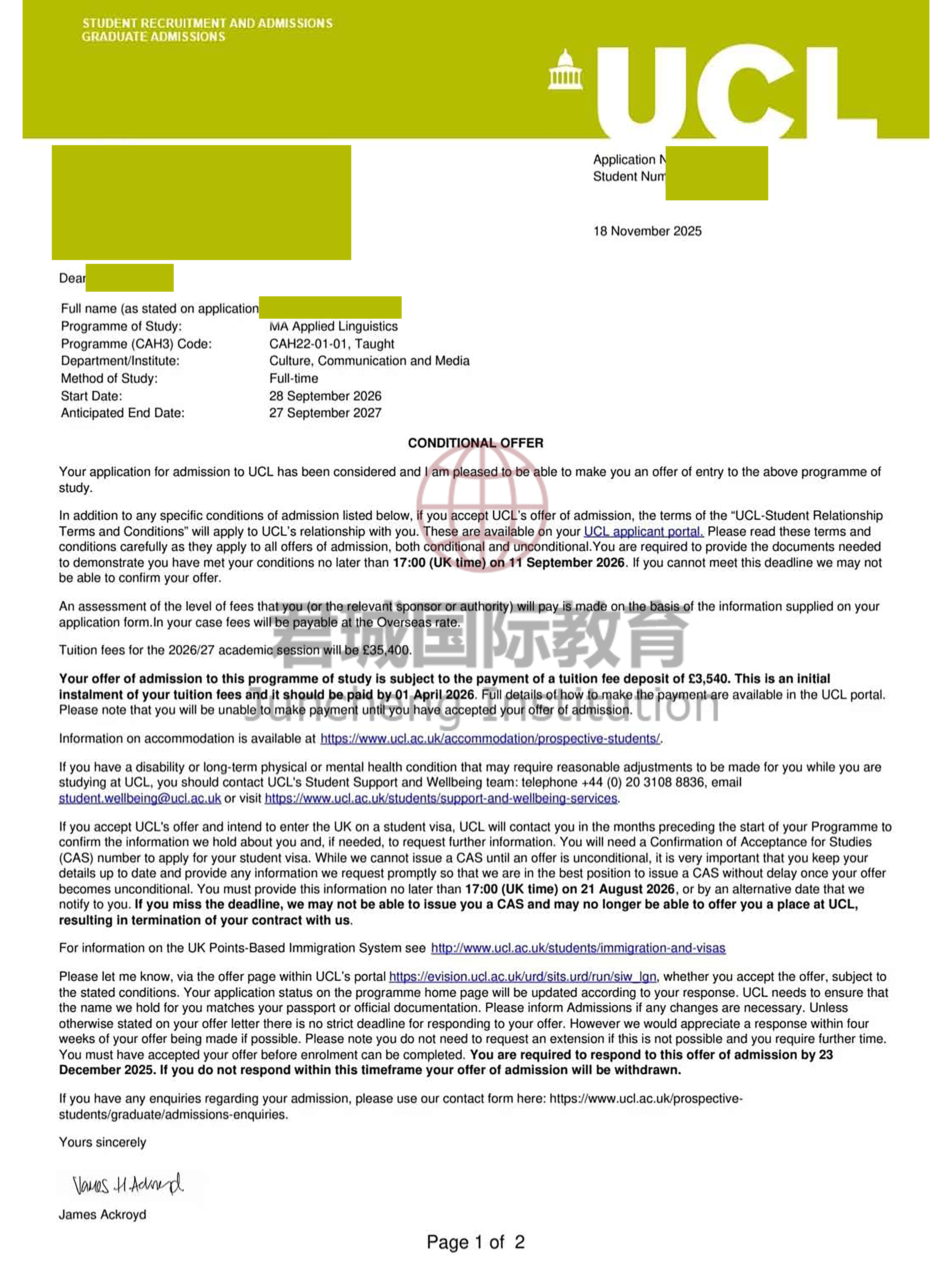 录取Offer:伦敦大学学院 University College London
