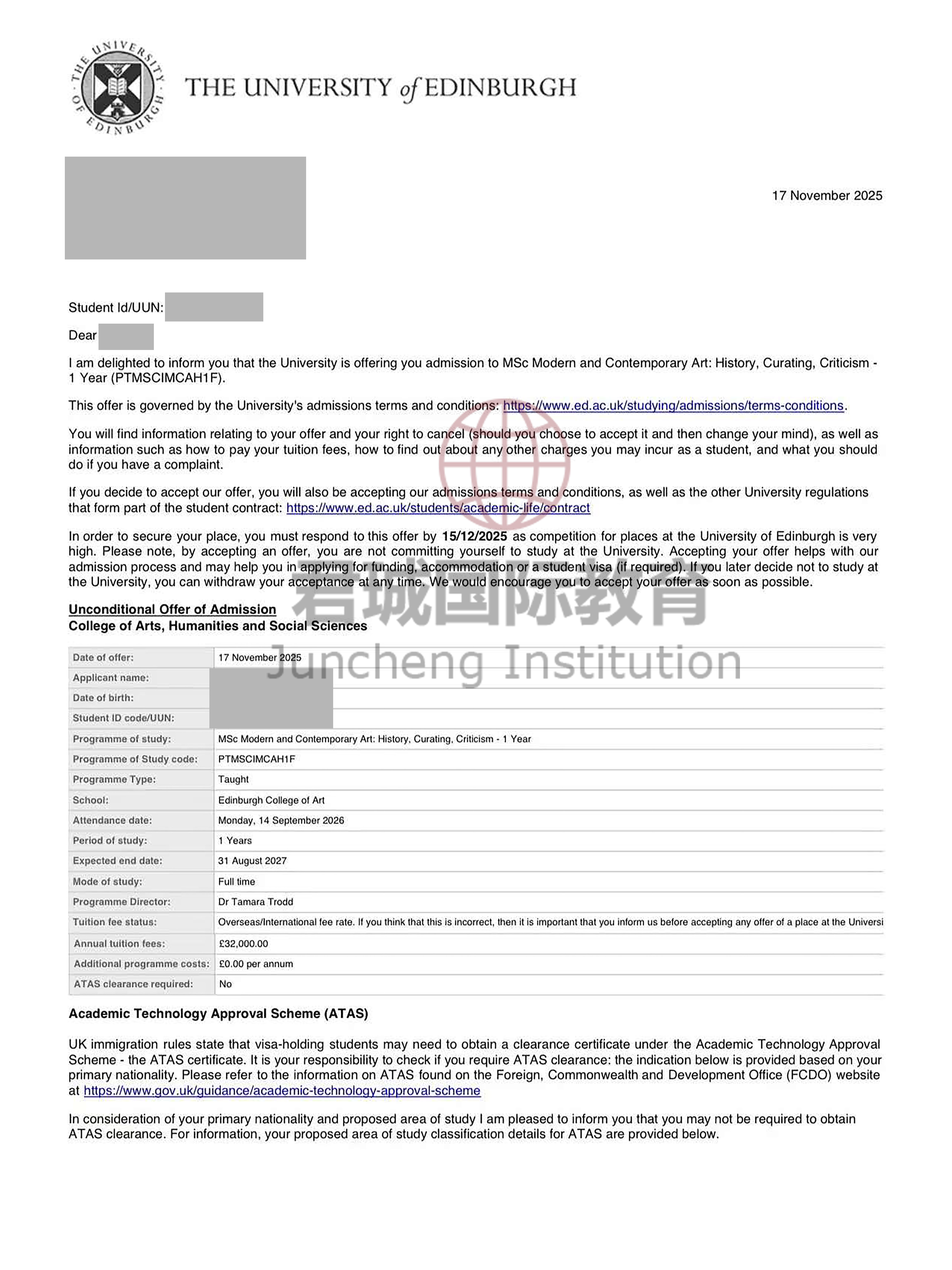 录取Offer:爱丁堡大学 University of Edinburgh