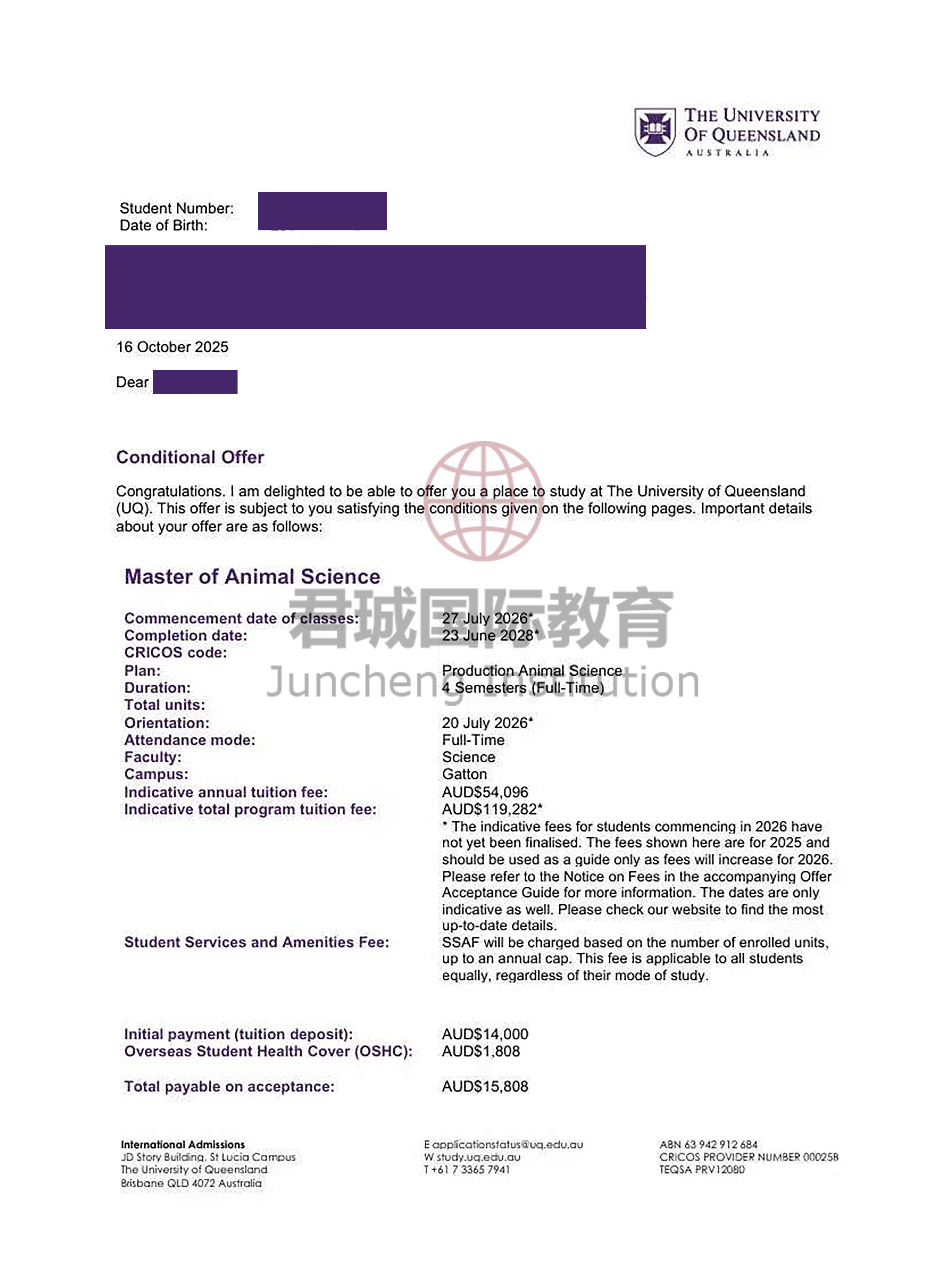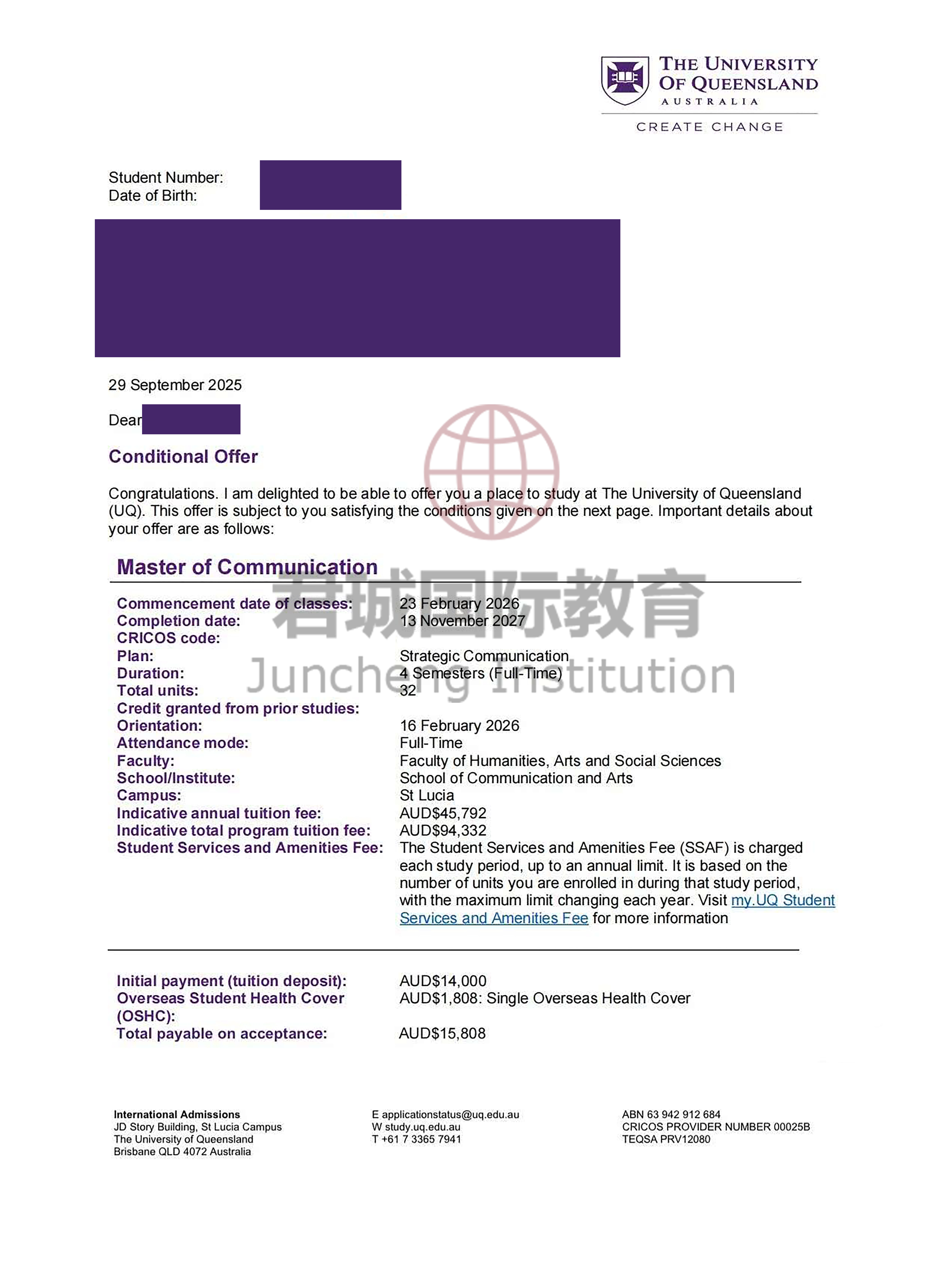录取Offer:昆士兰大学 University of Queensland
