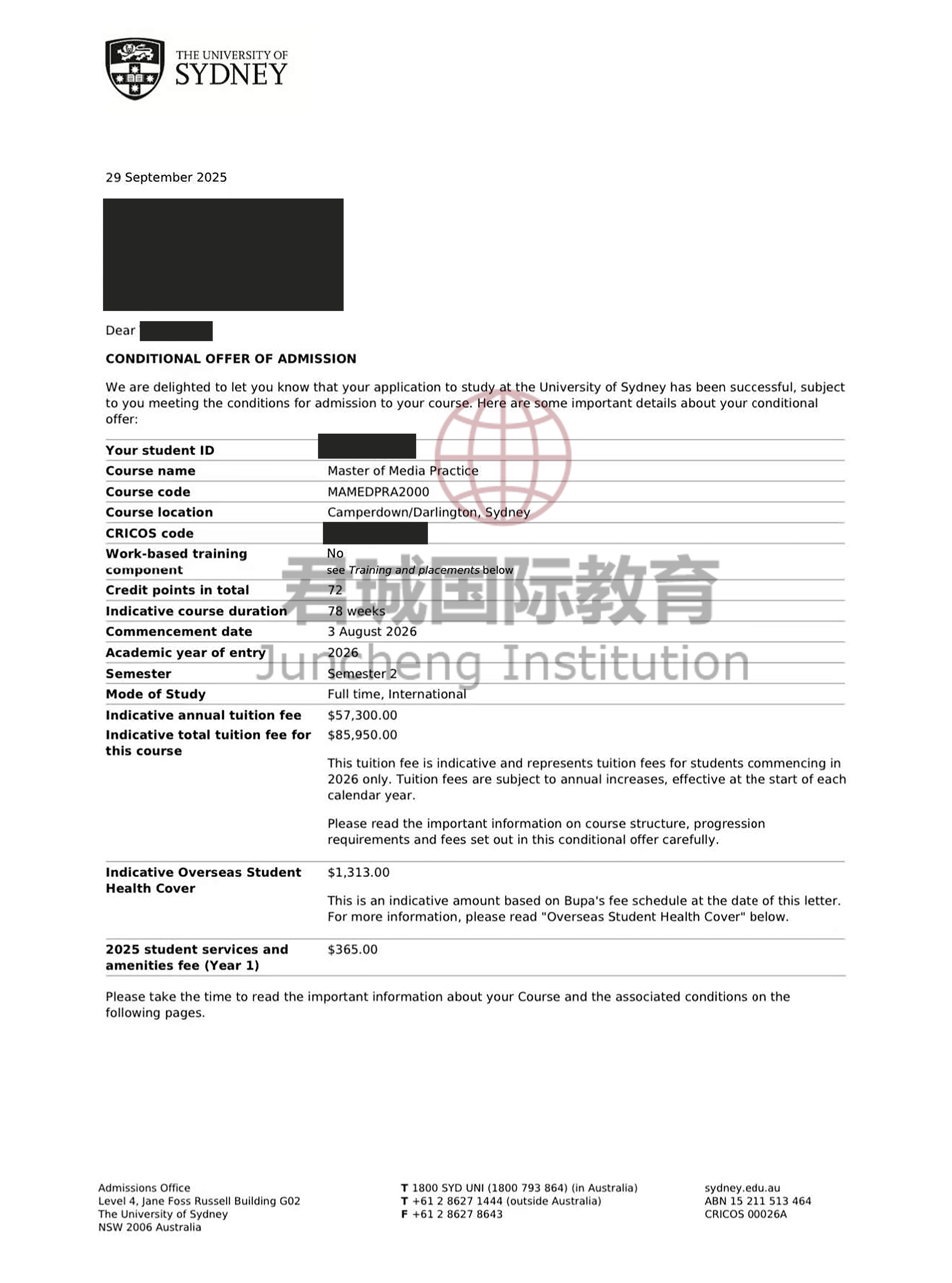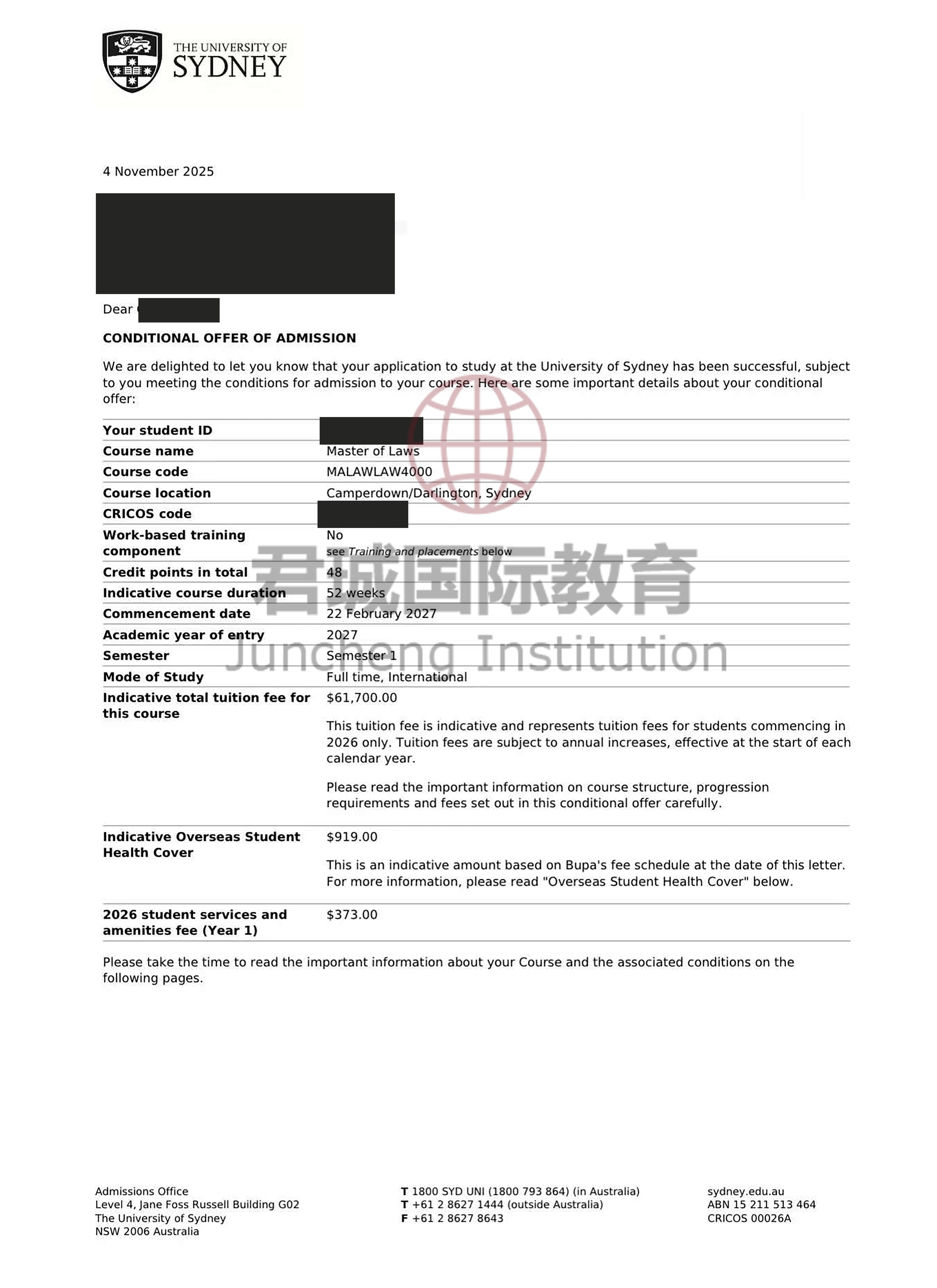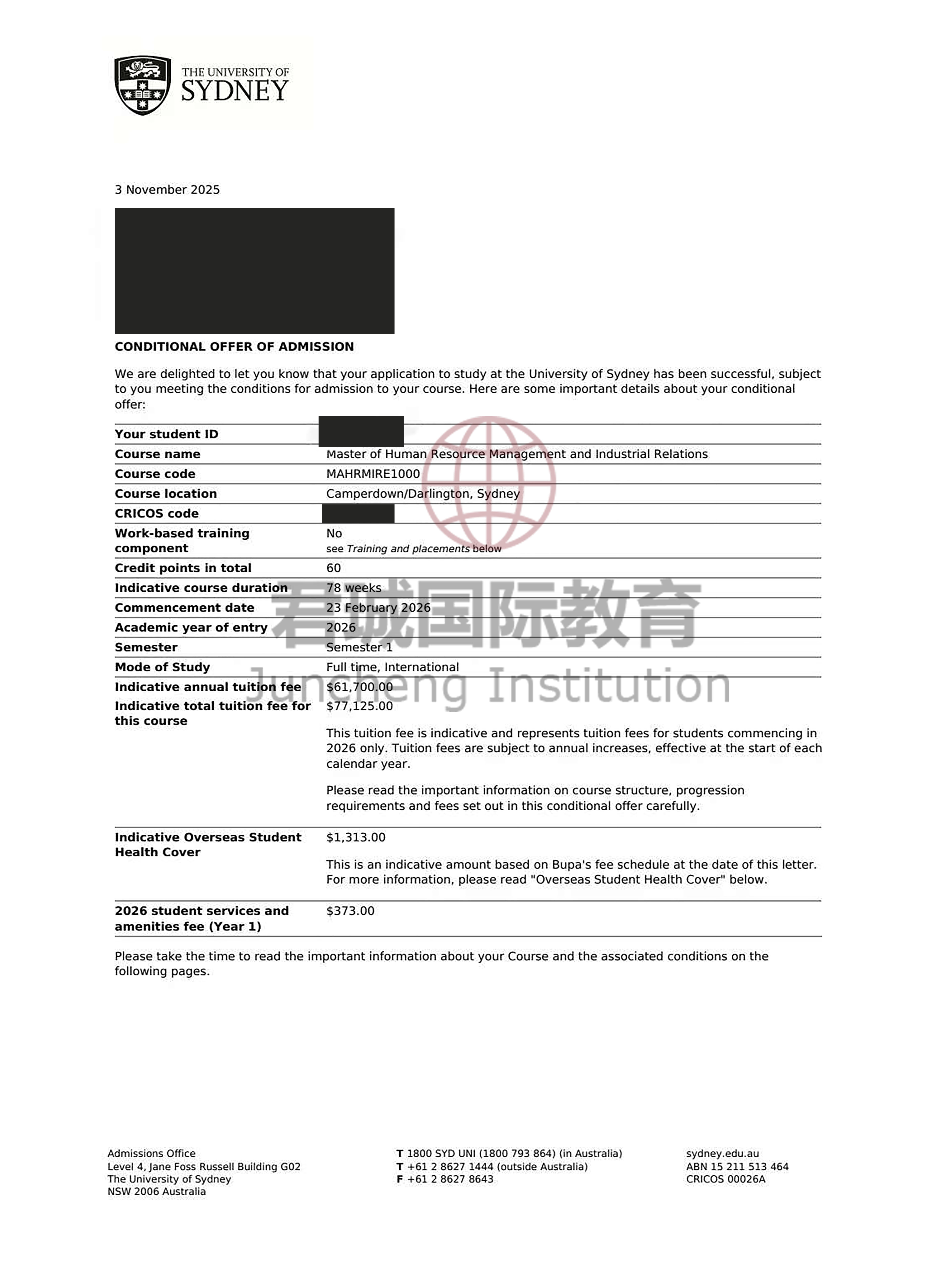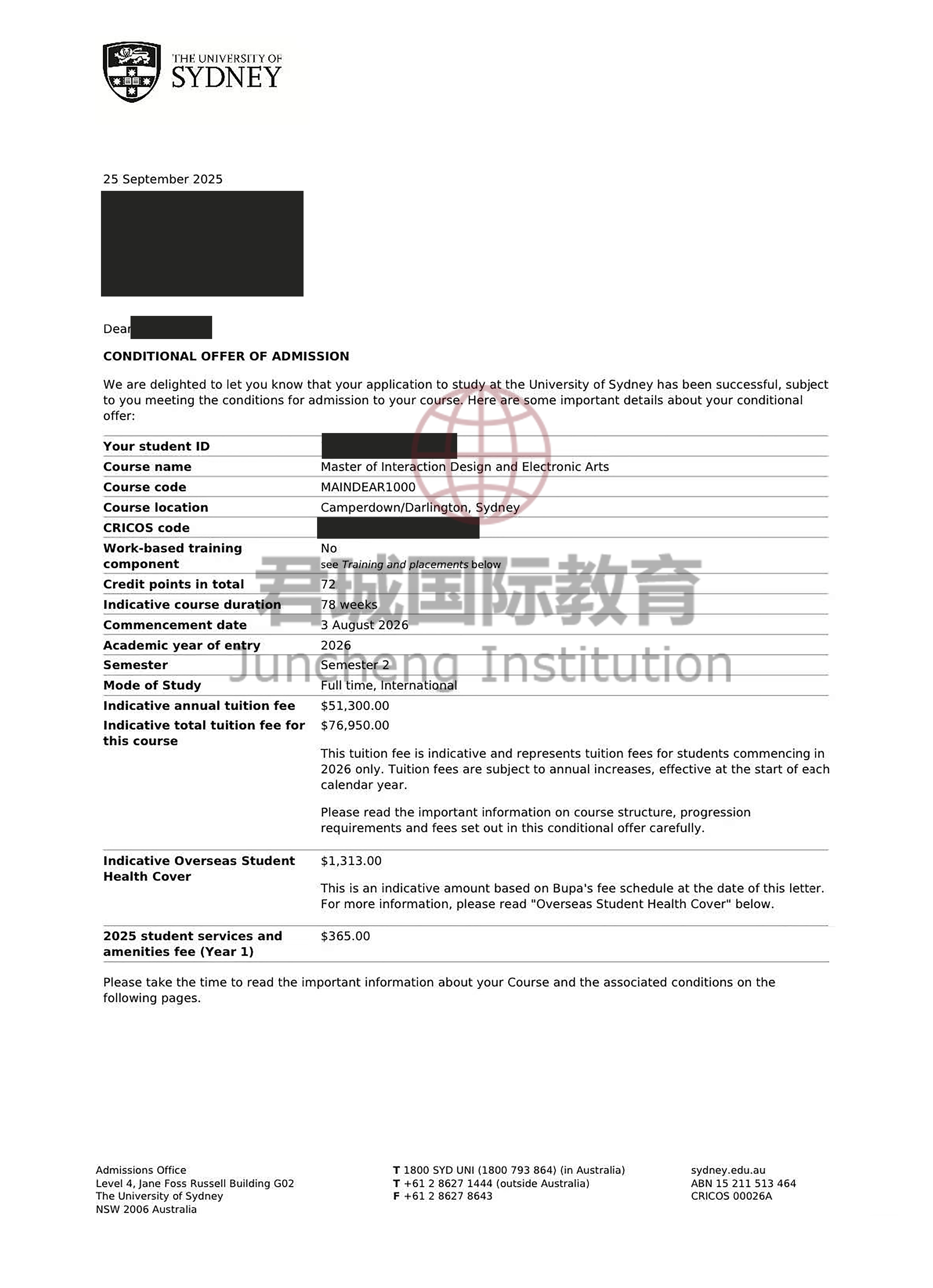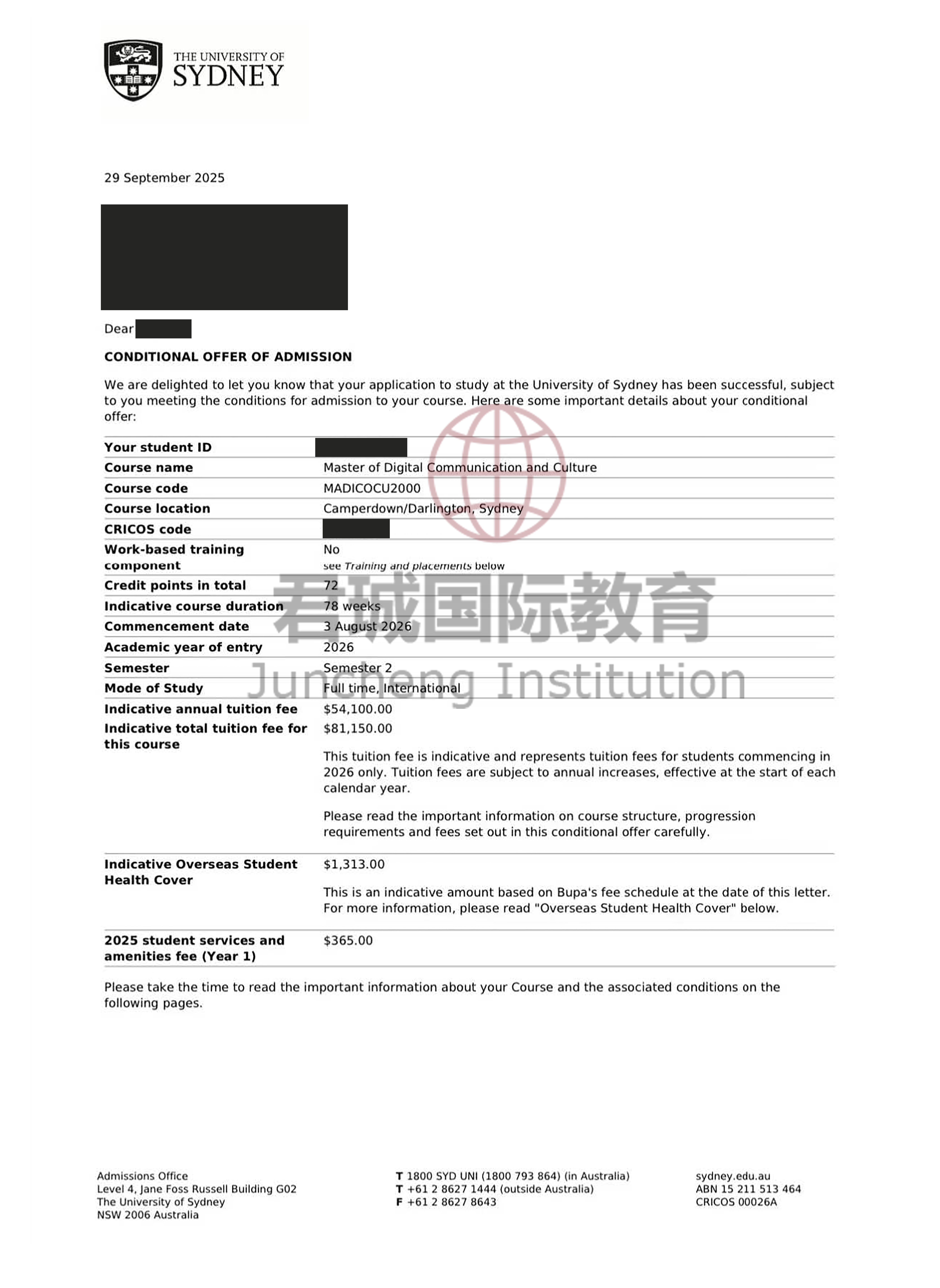 录取Offer:澳洲悉尼大学 University of Sydney