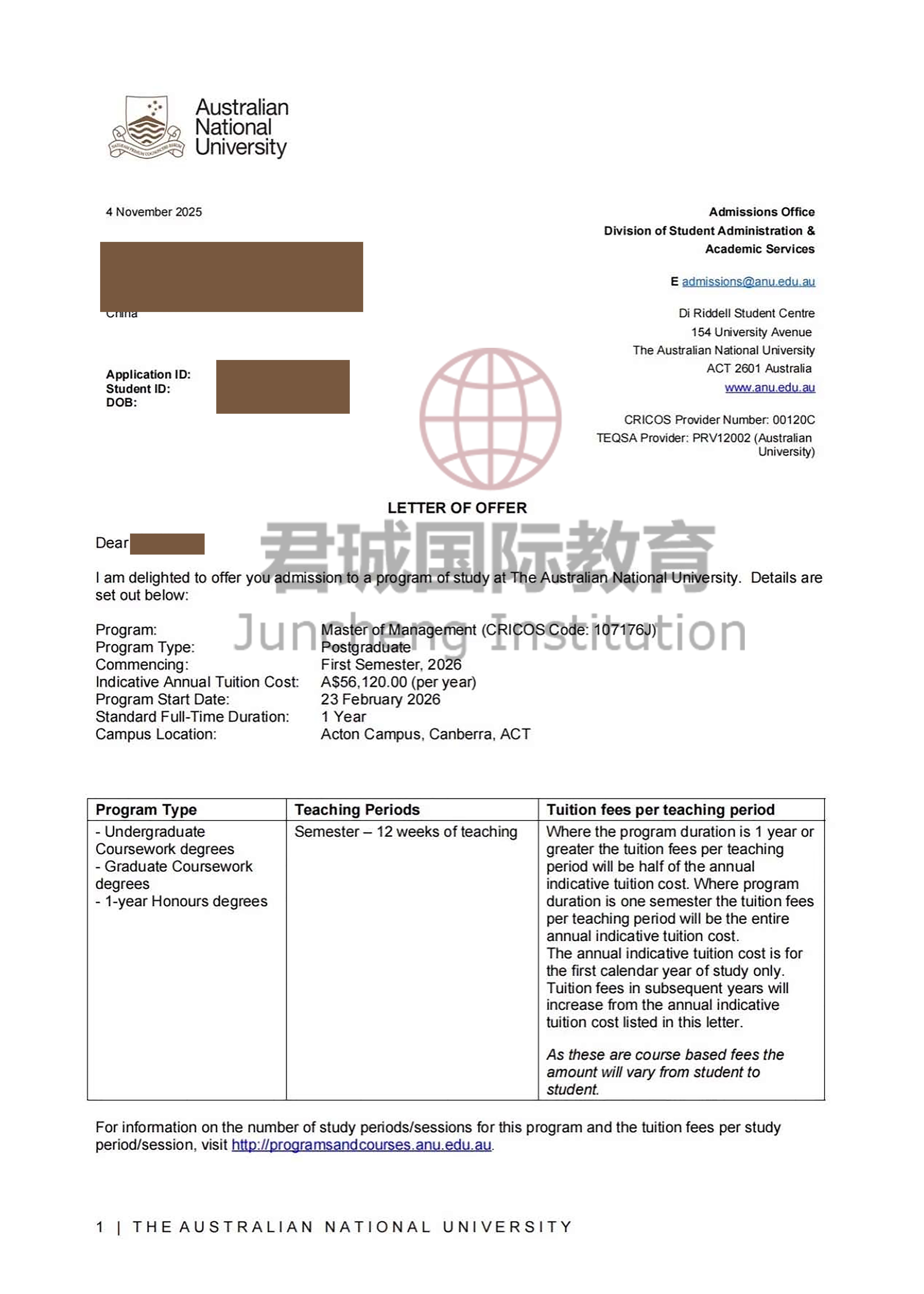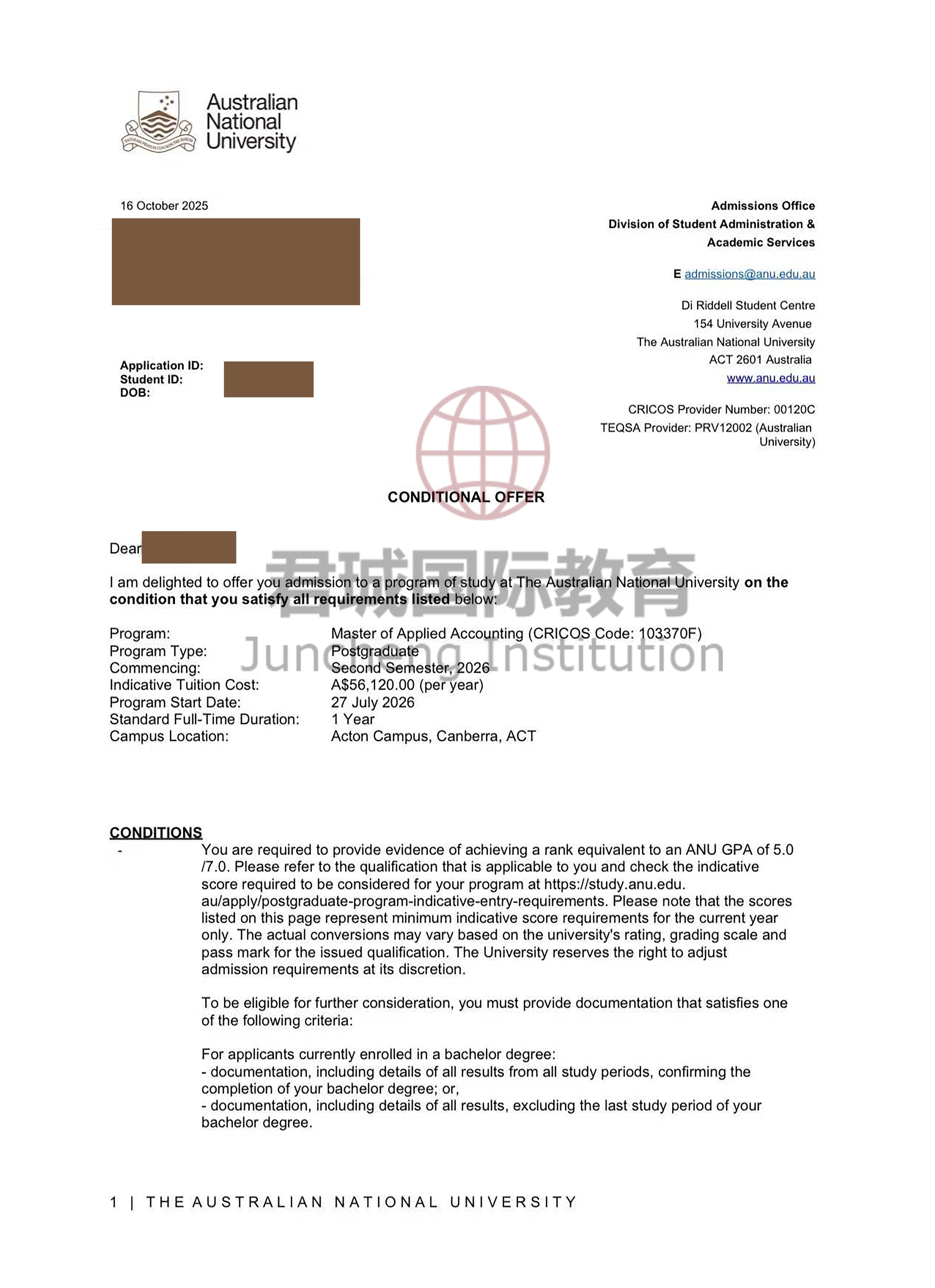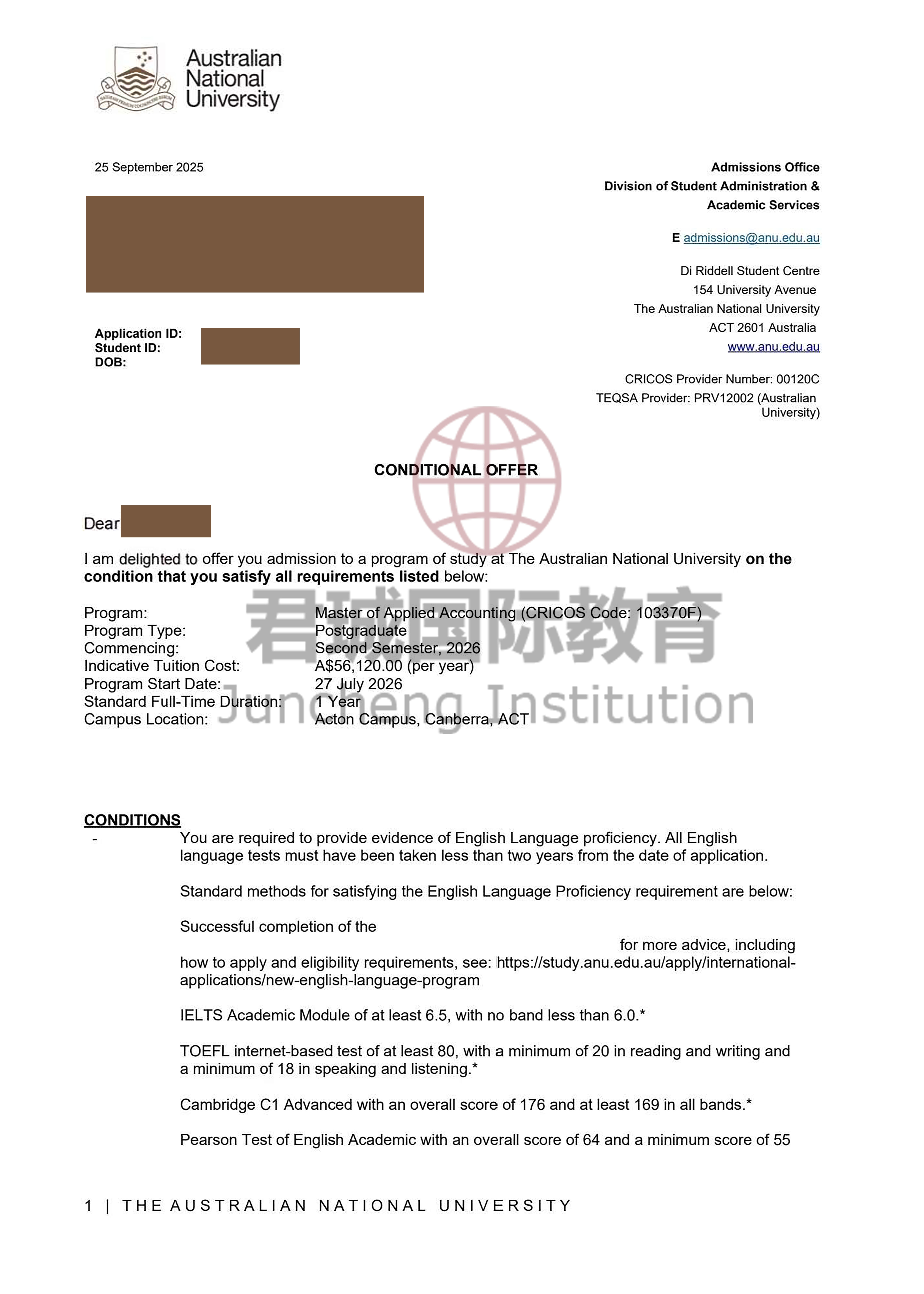 录取Offer:澳洲国立大学 Australian National University