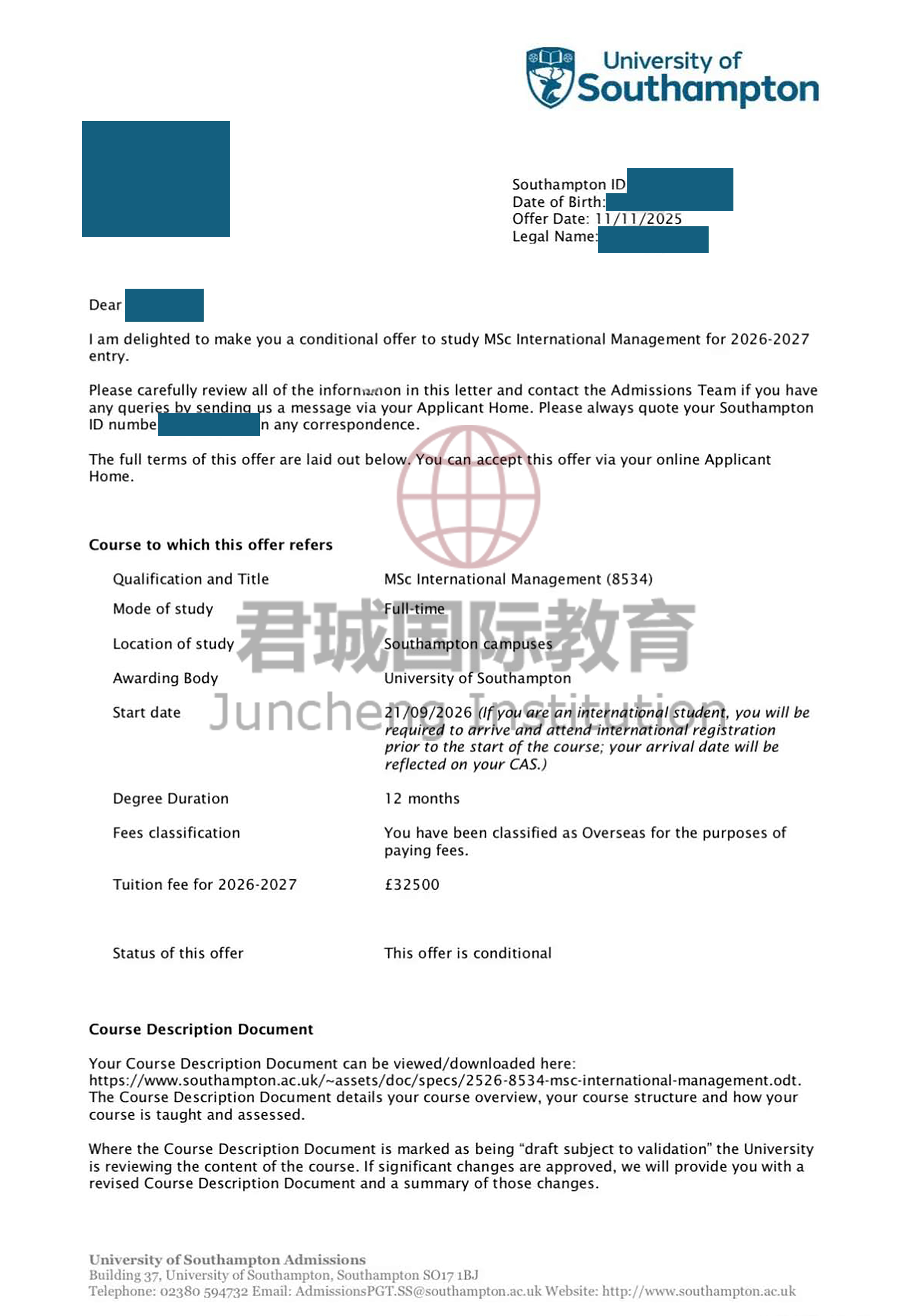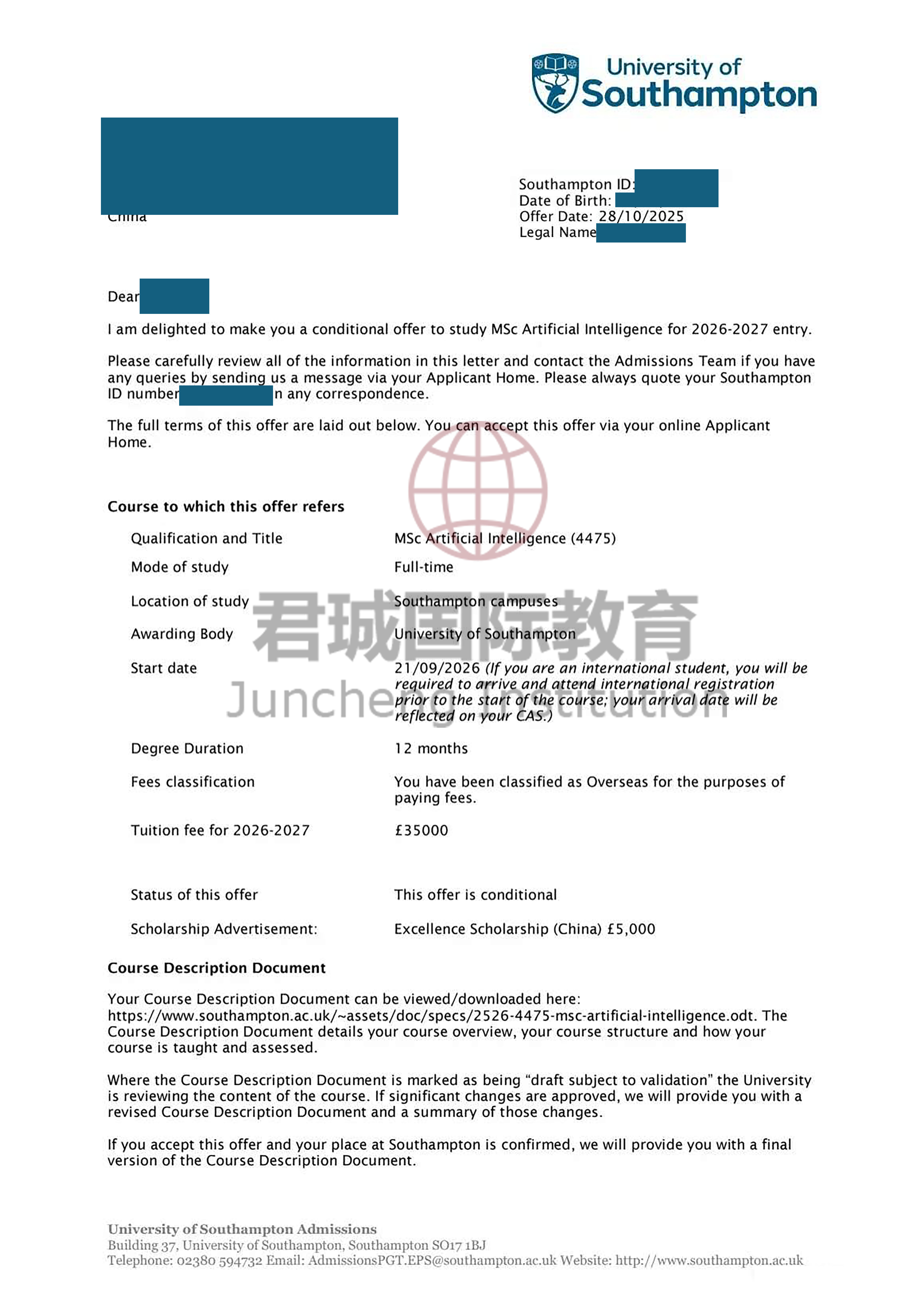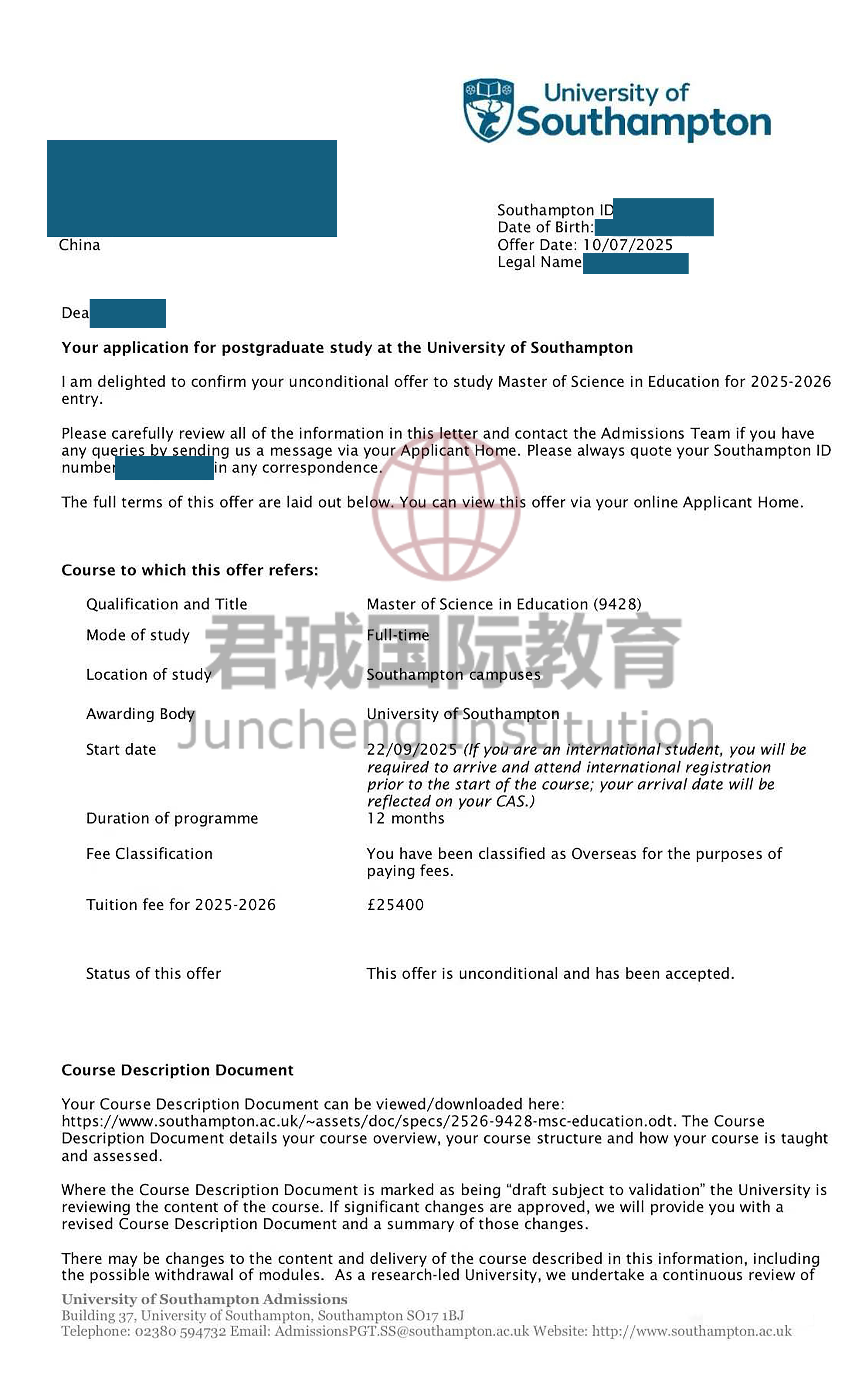 录取Offer:南安普顿大学 University of Southampton