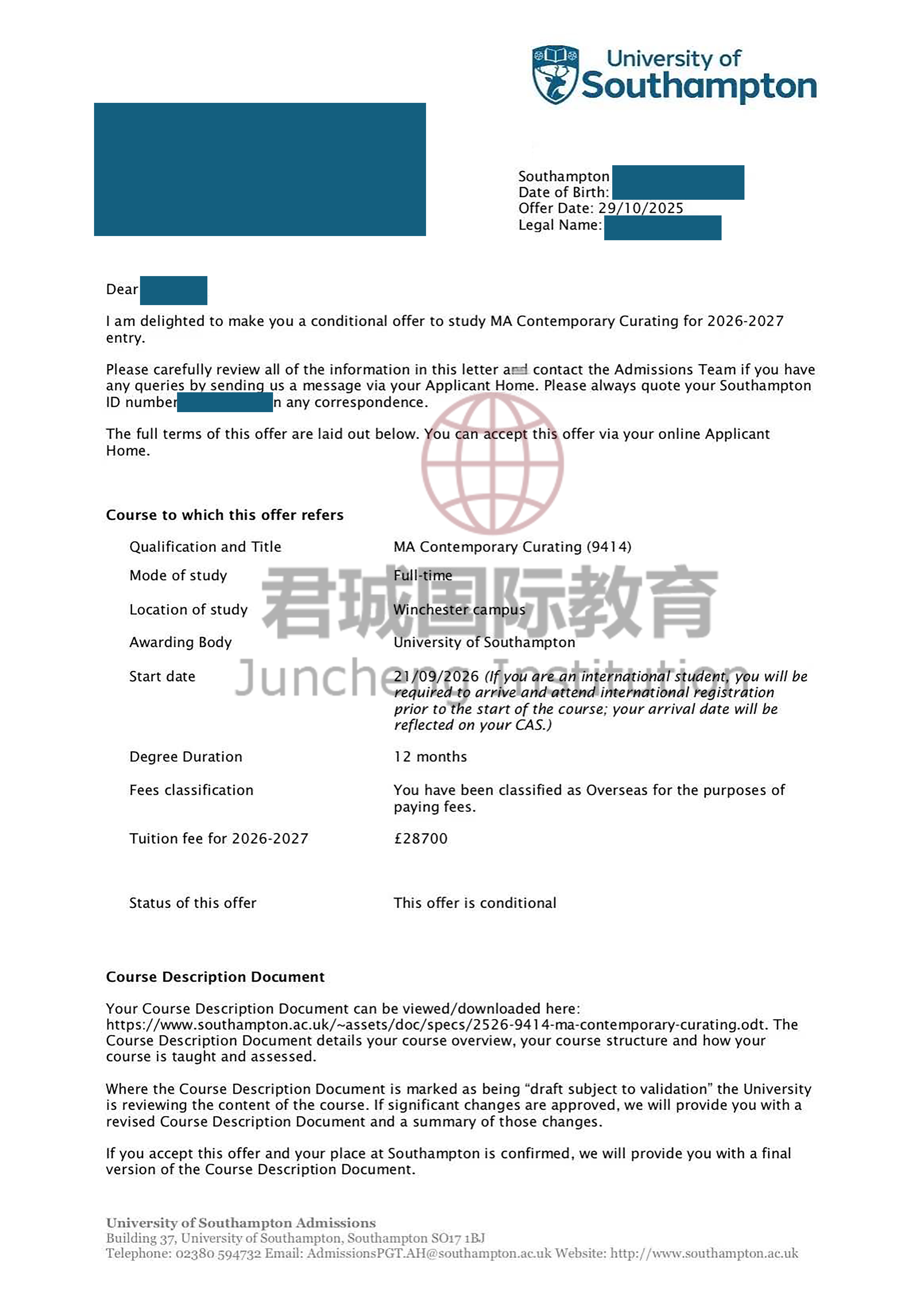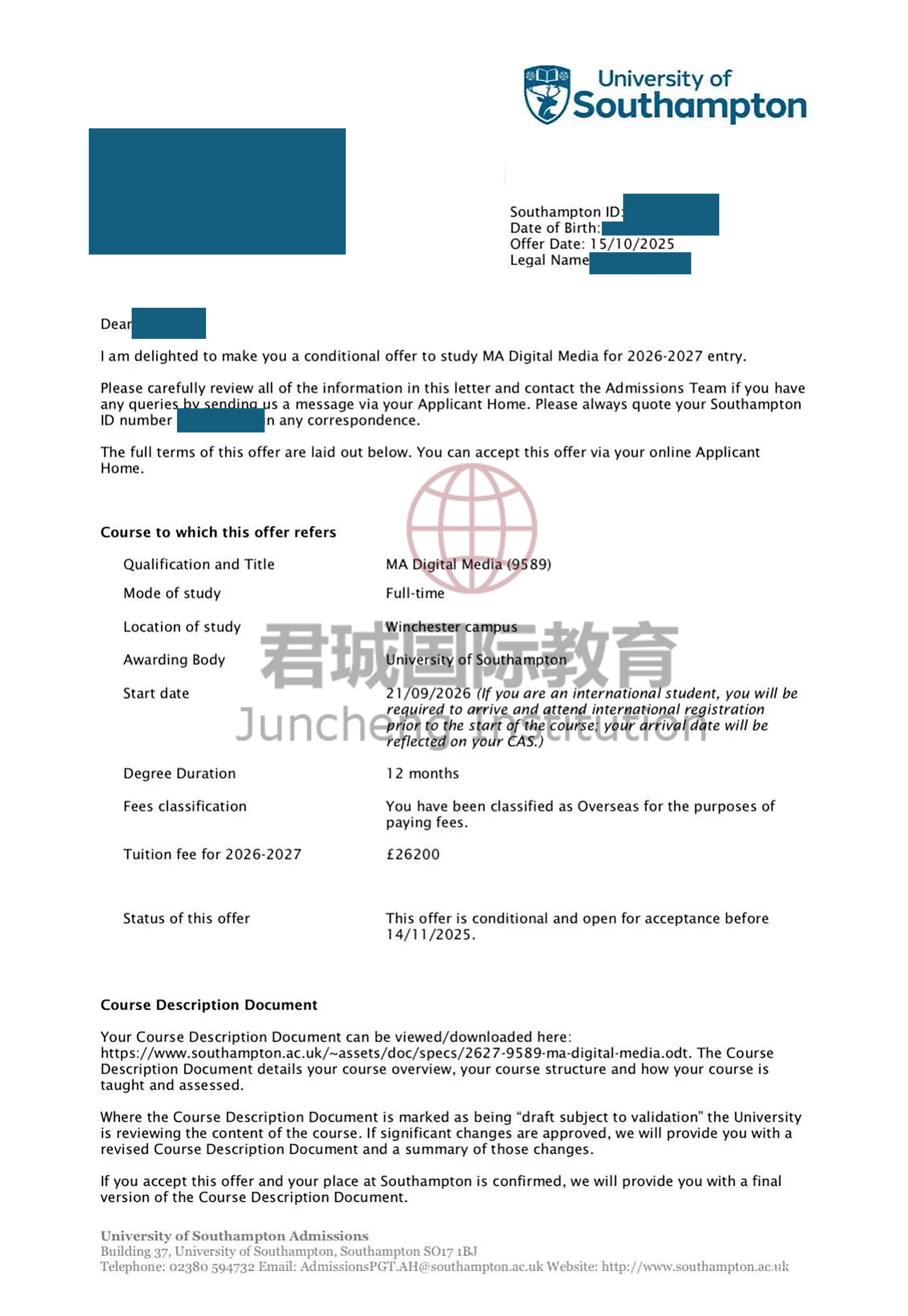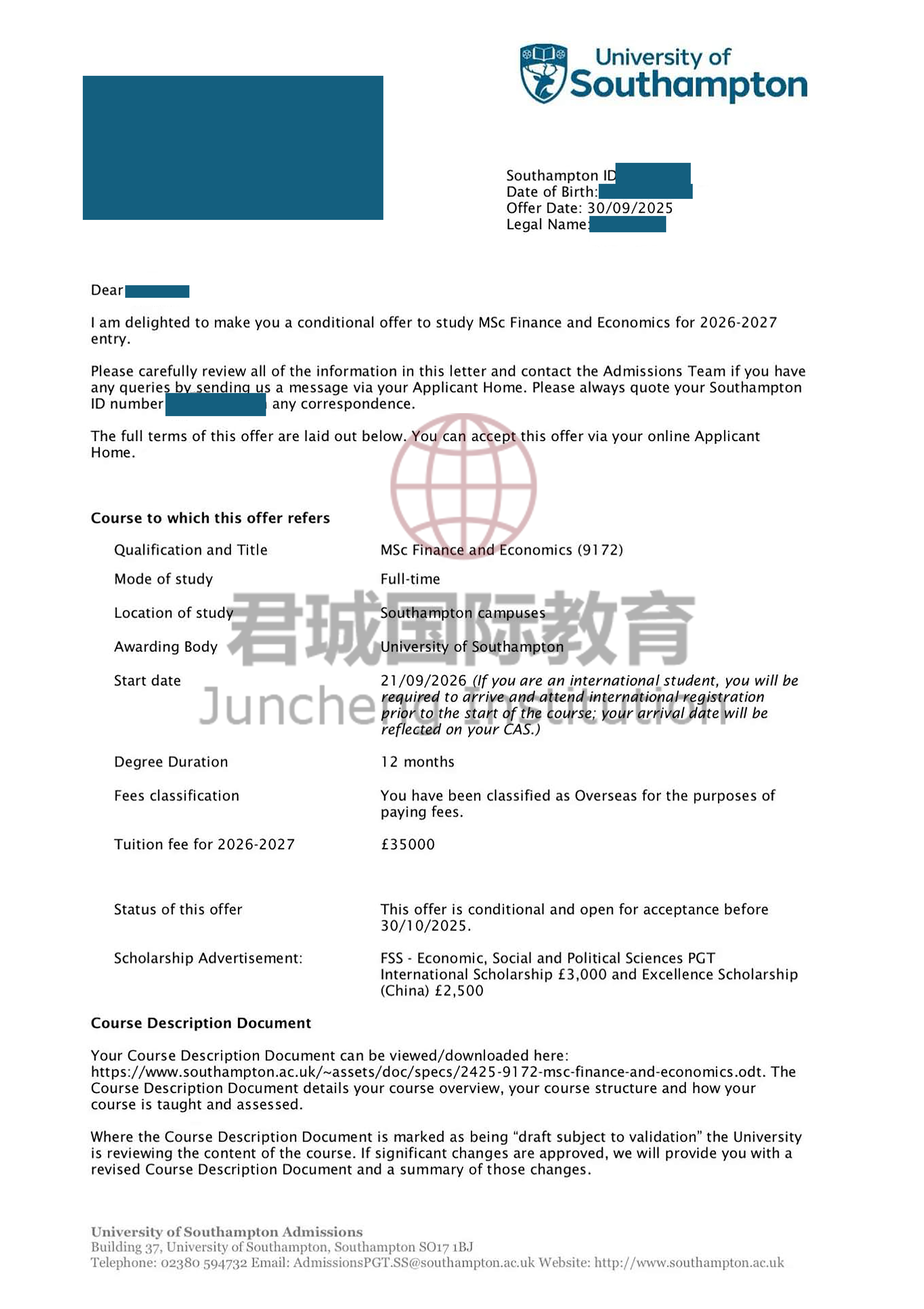 录取Offer:南安普顿大学 University of Southampton