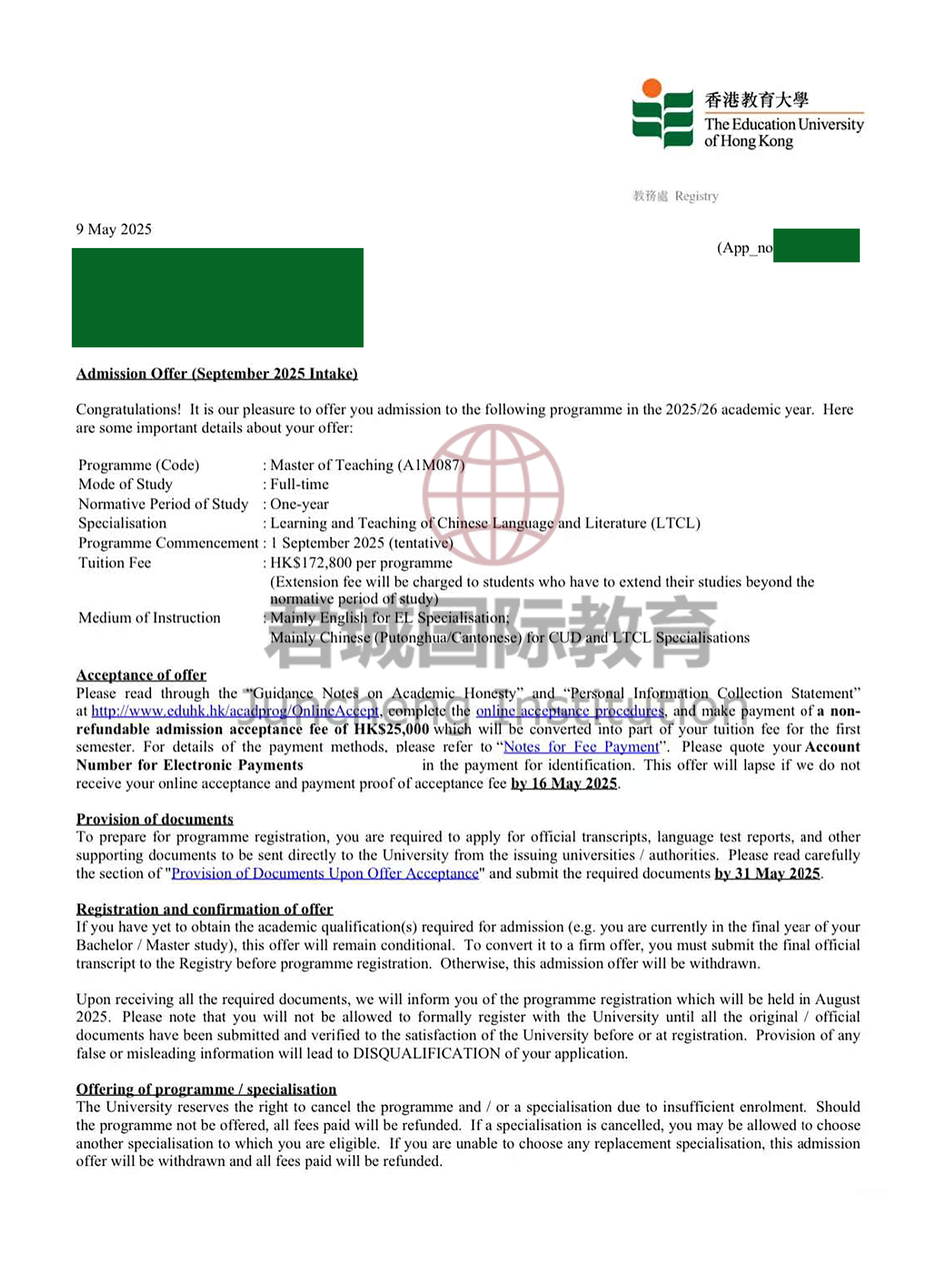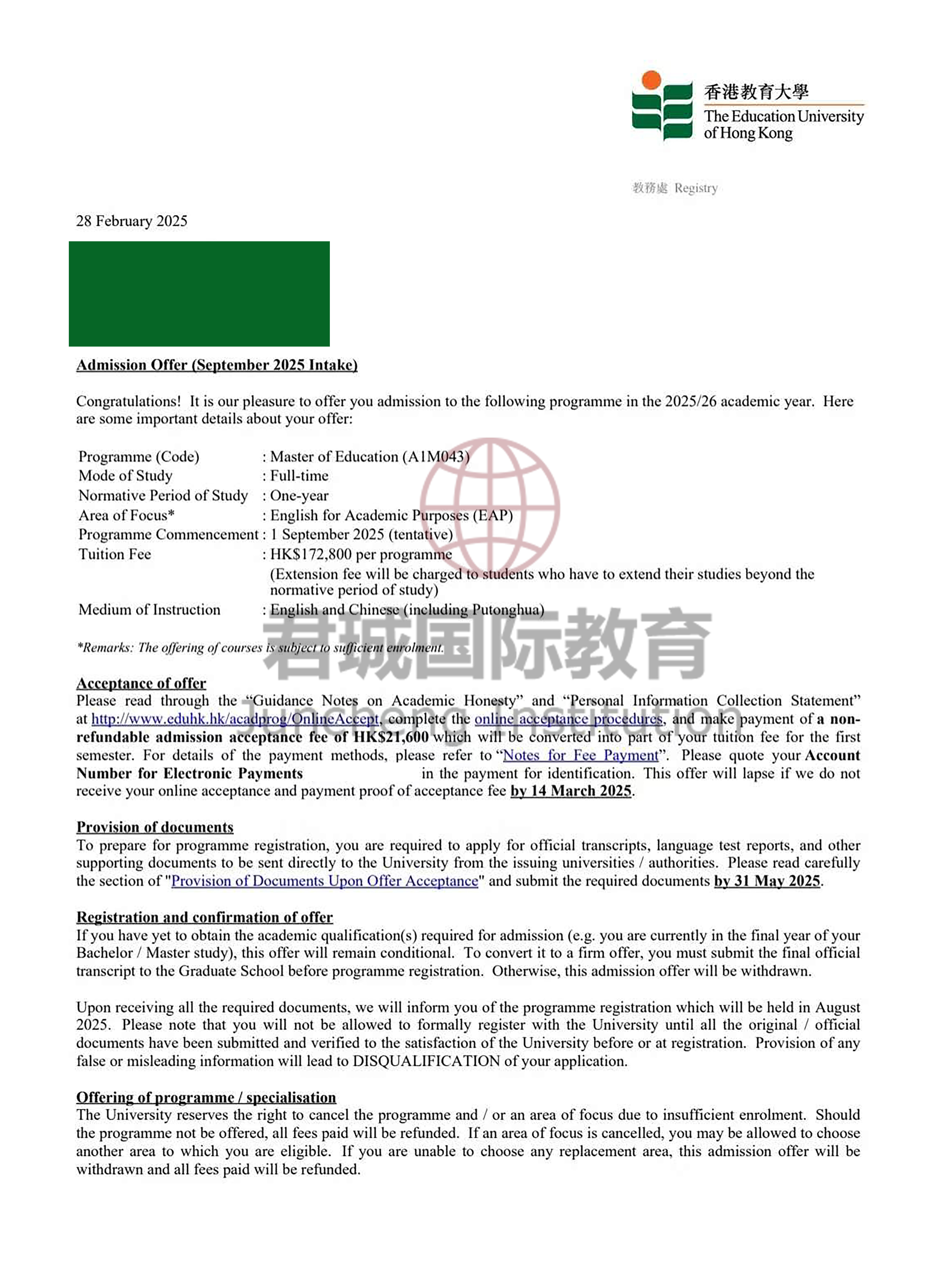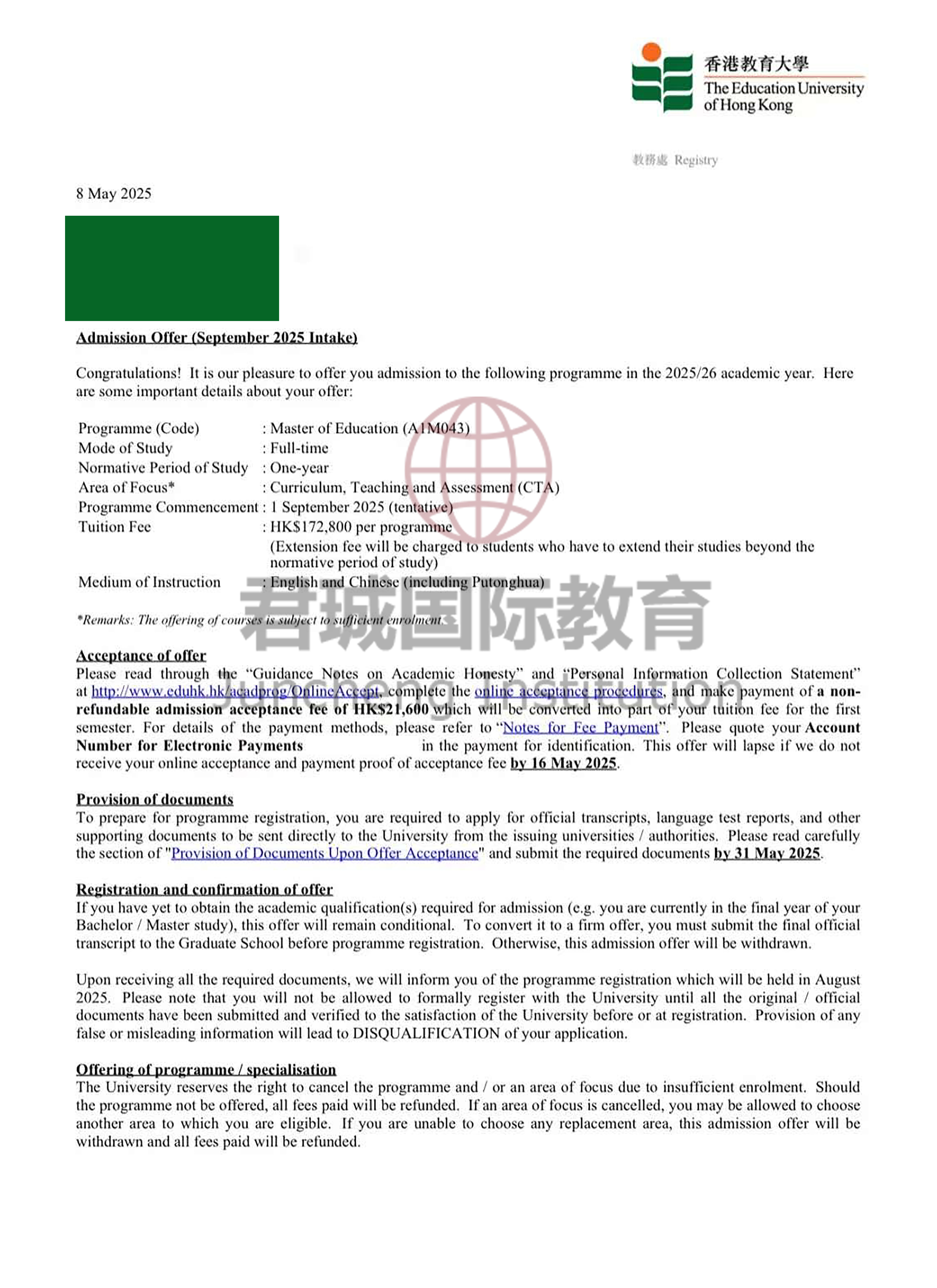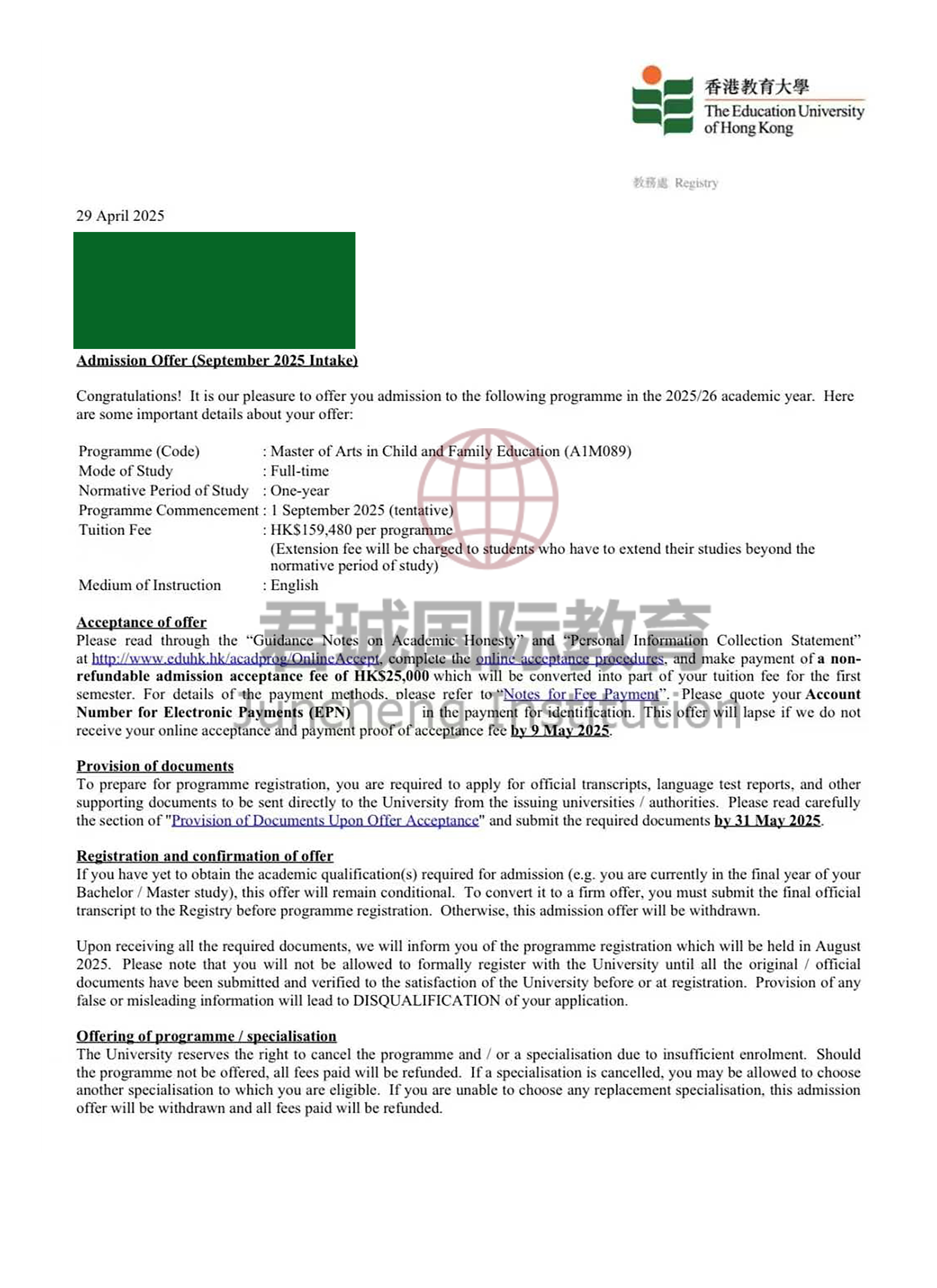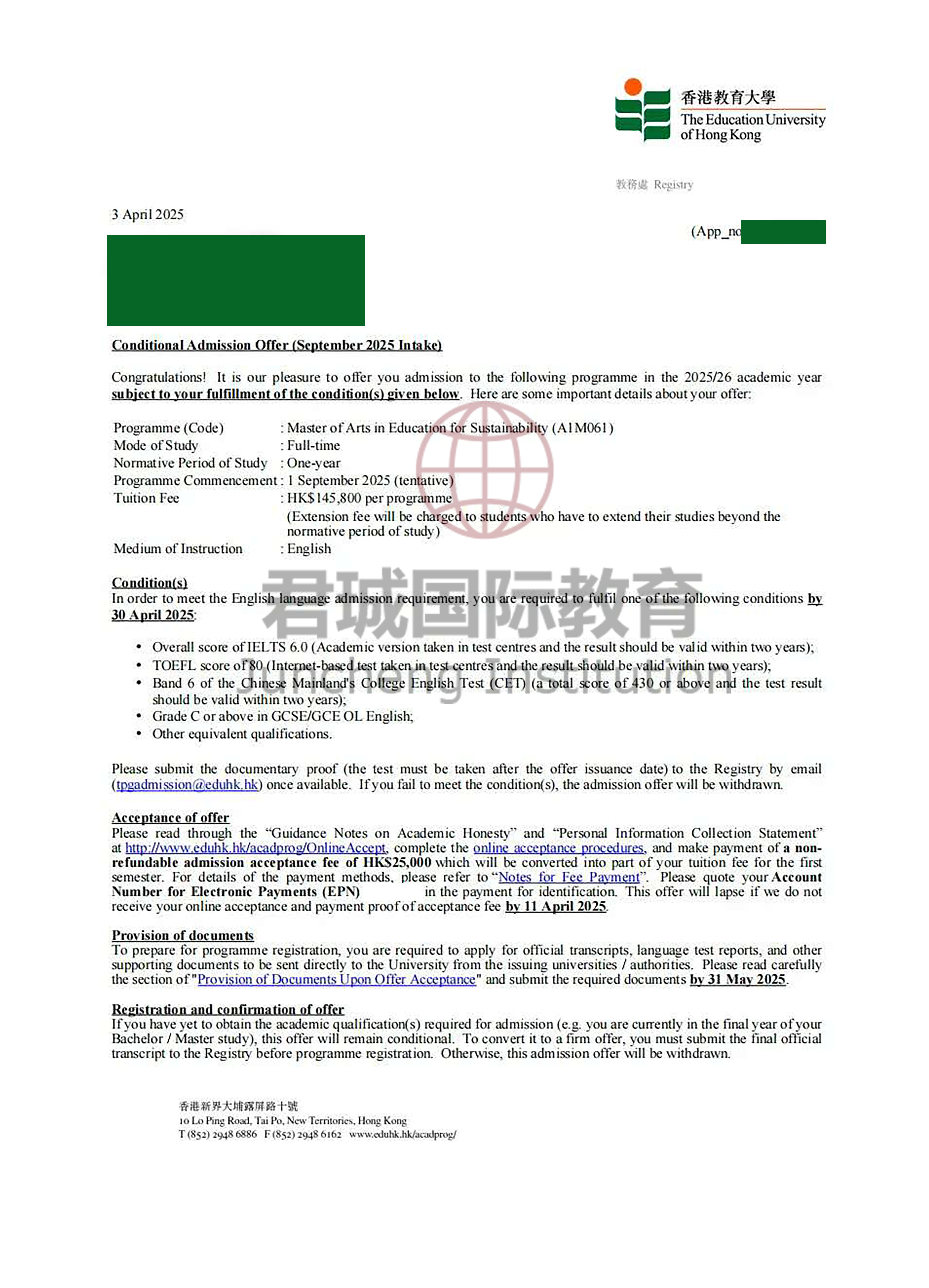 录取Offer:香港教育大学 The Education University of Hong Kong