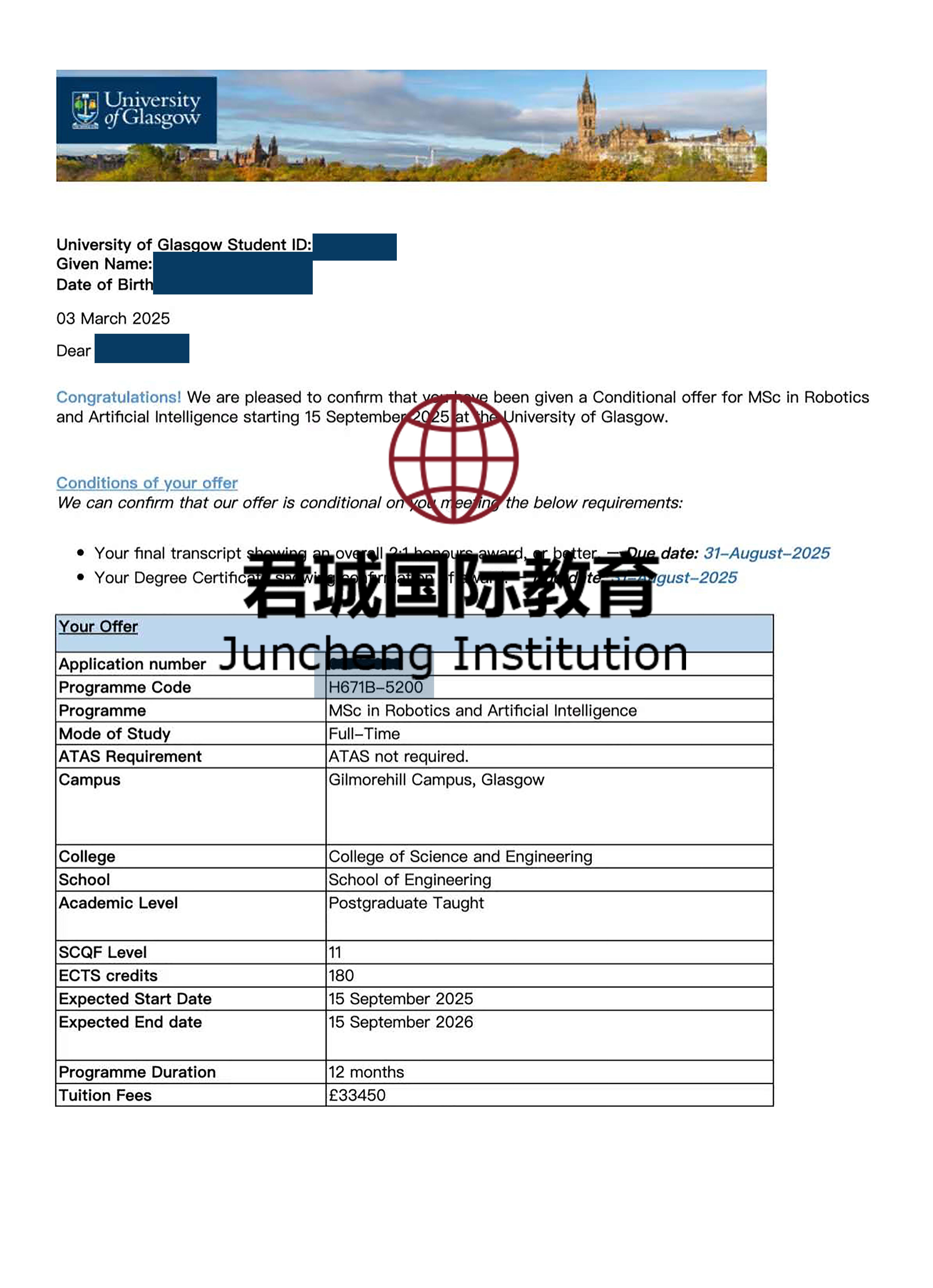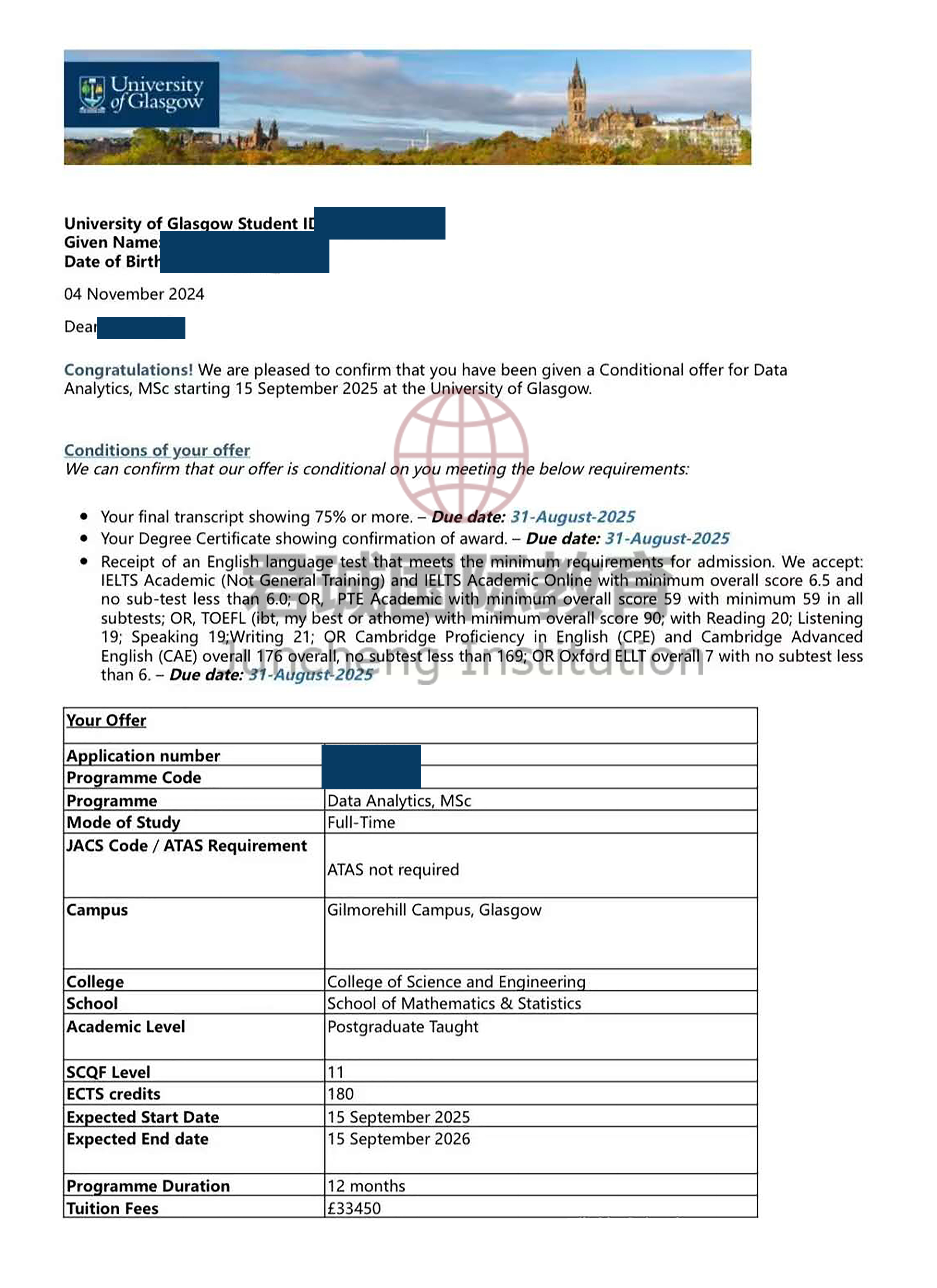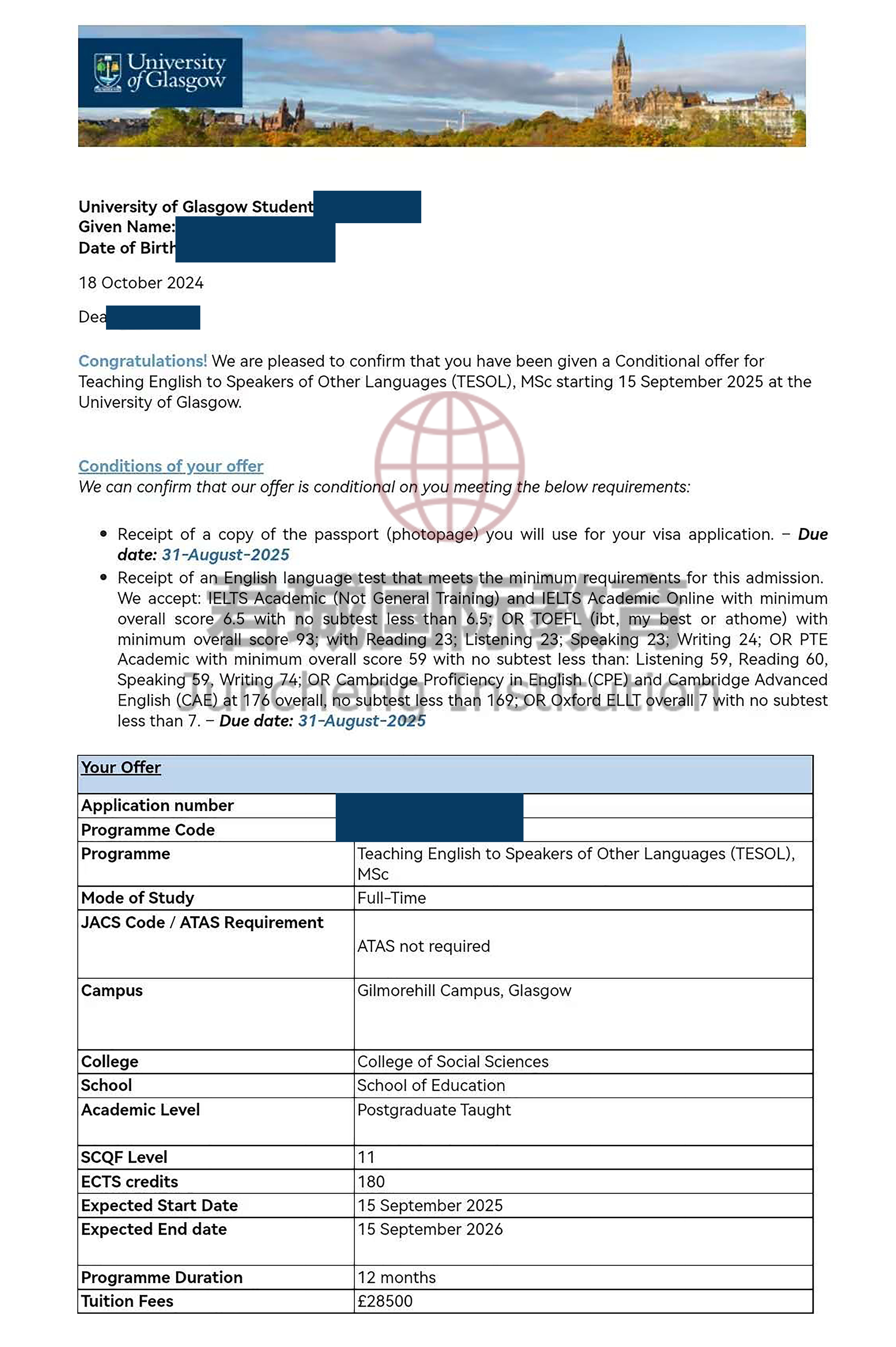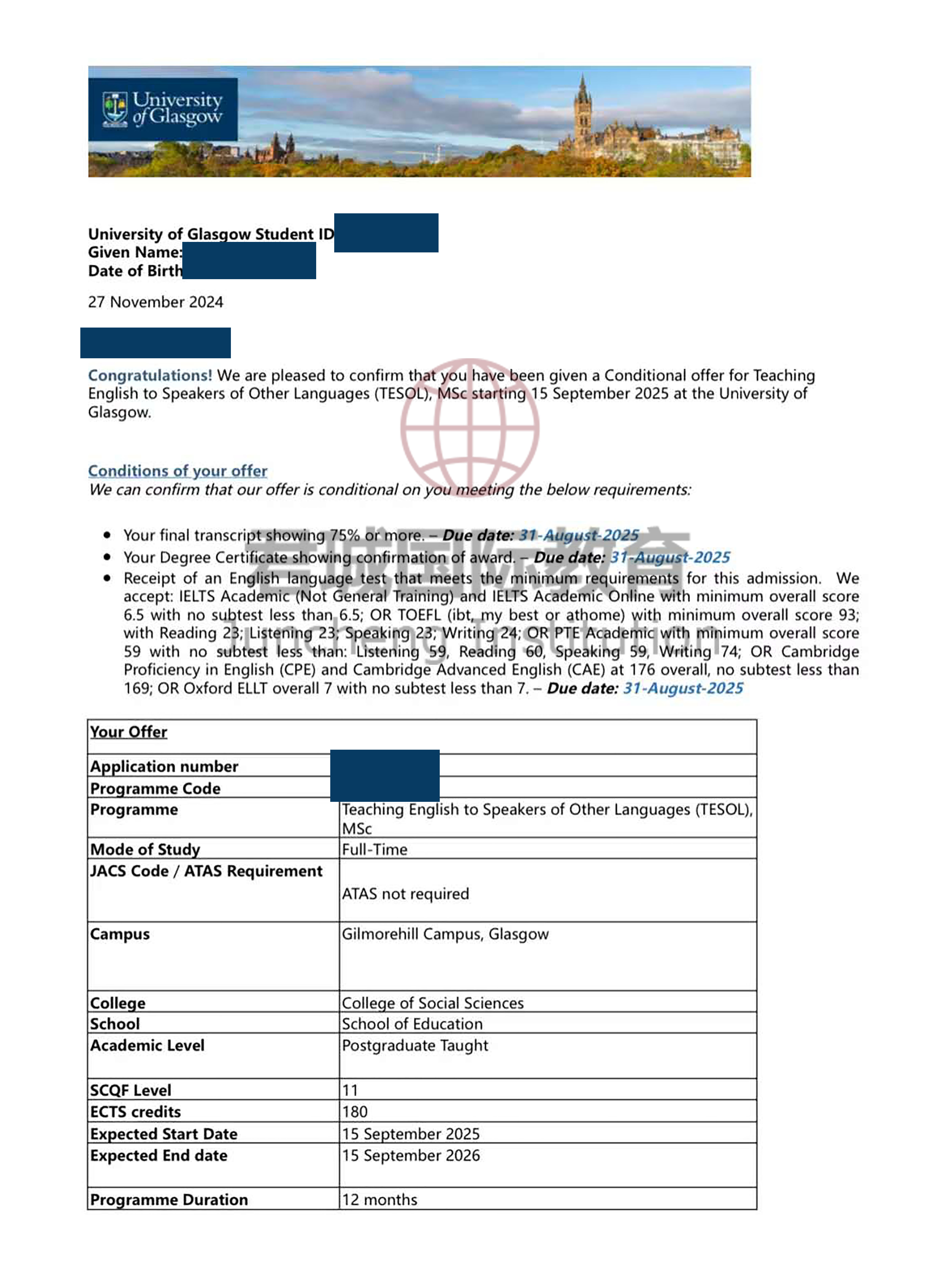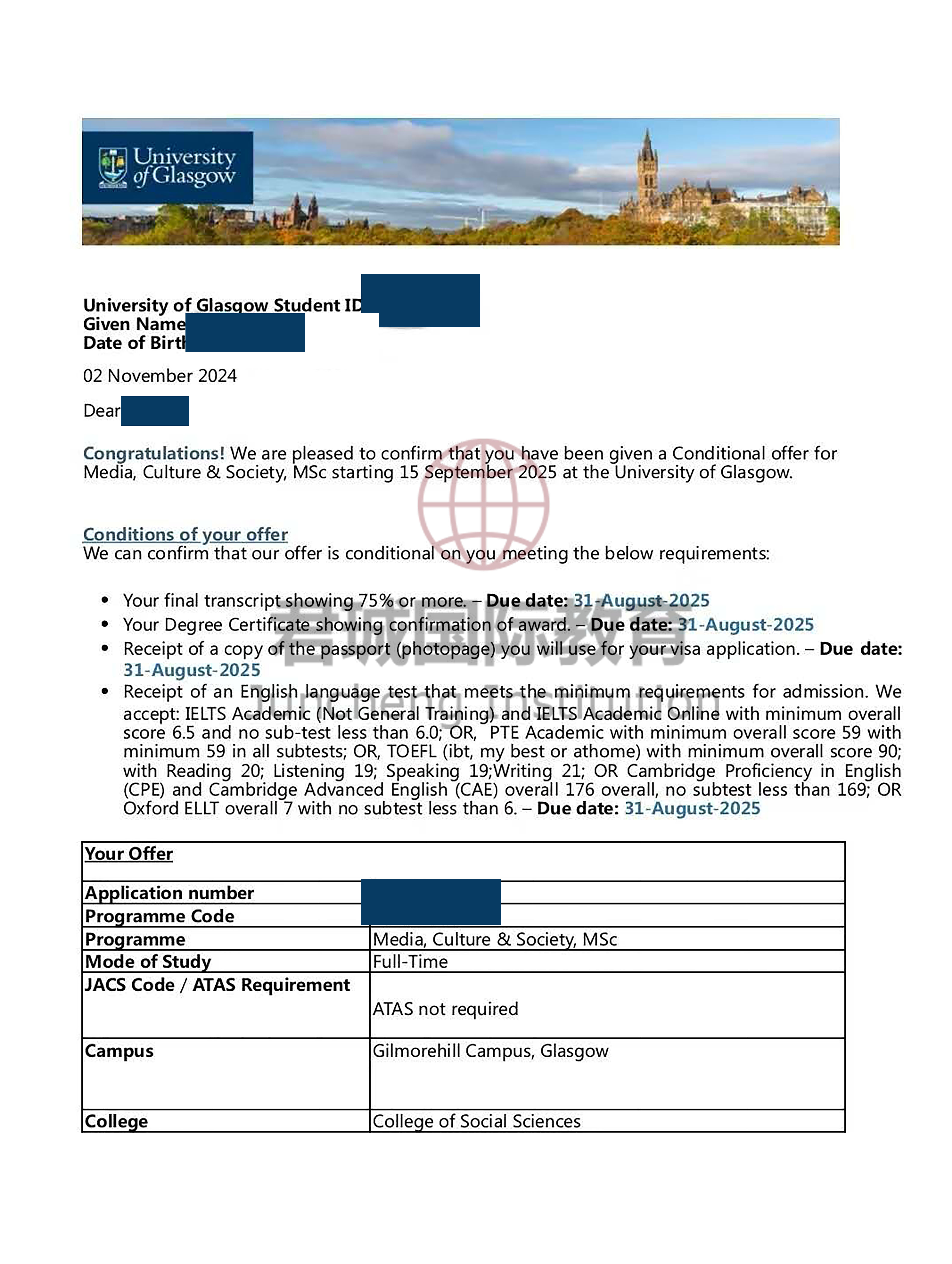 录取Offer:格拉斯哥大学 University of Glasgow