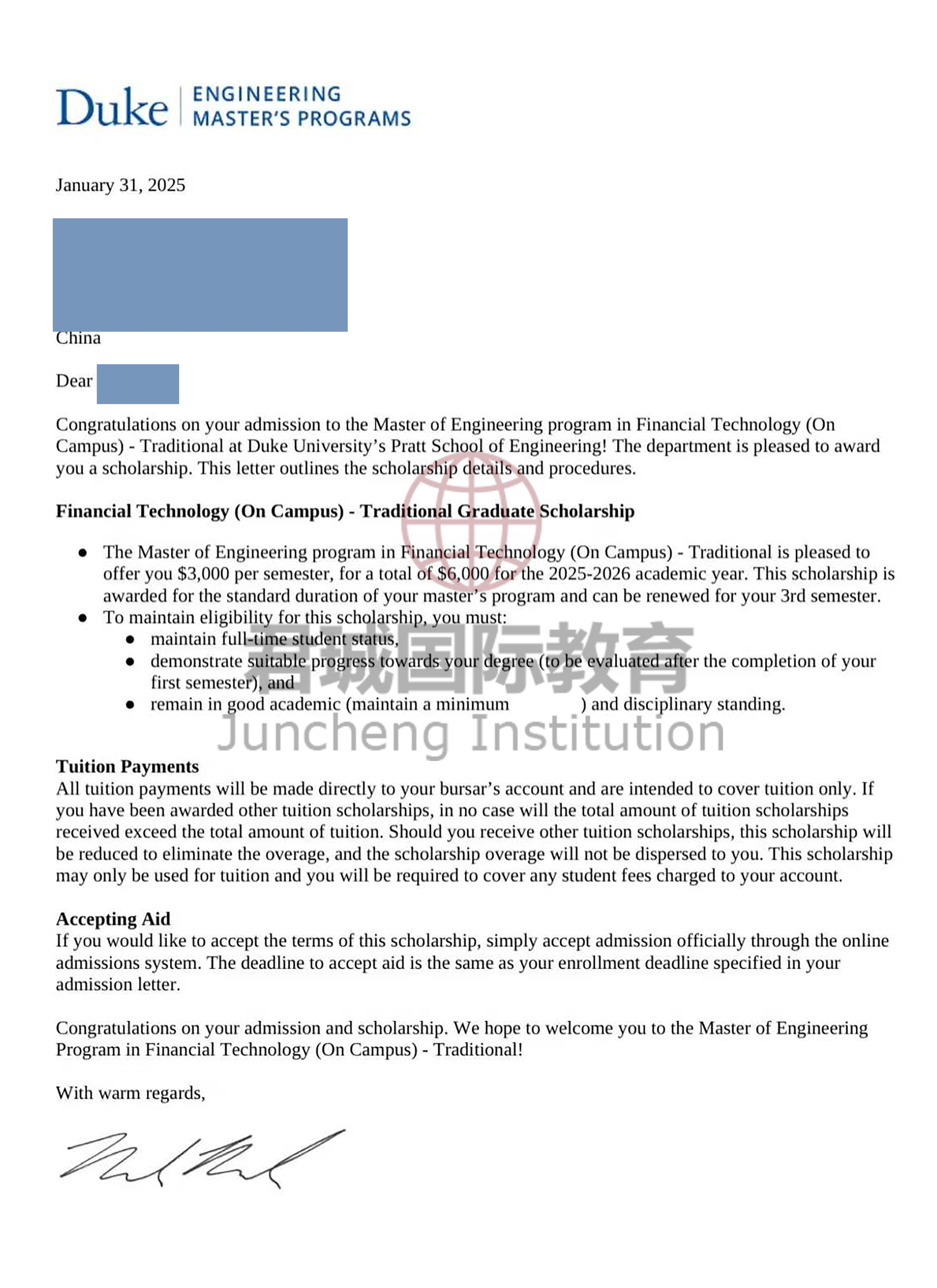录取Offer:美国杜克大学 Duke University, USA