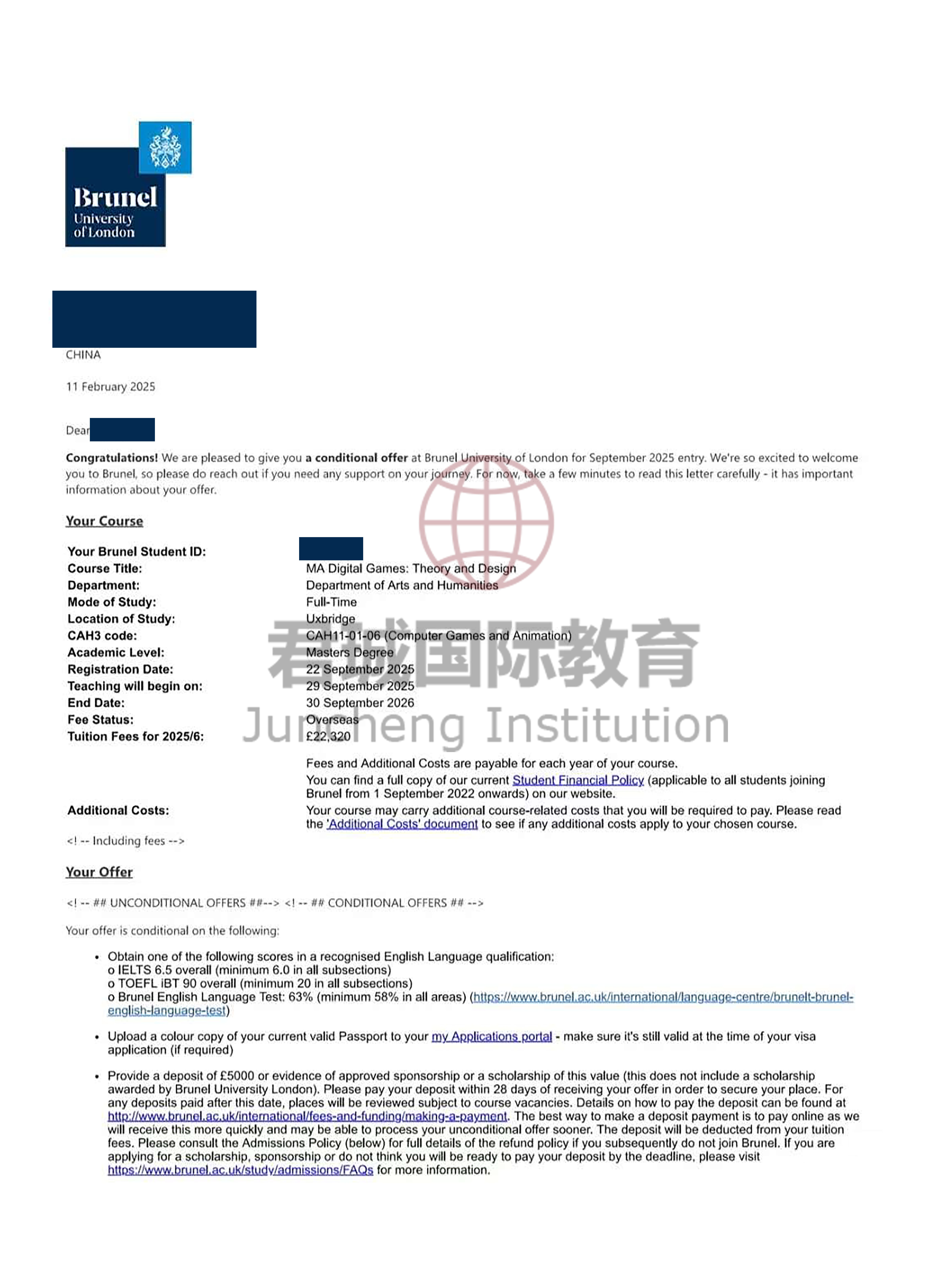 录取Offer:布鲁内尔大学 Brunel University of London